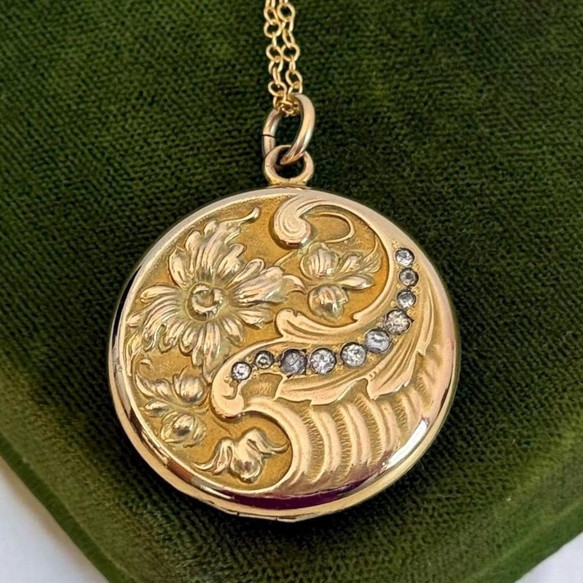 Lovely antique Art Nouveau 10K gold filled round photo locket on a 14K gold filled chain. The front features an ornate repousse floral design of a large open flower on the left and small buds above and below it. There is a swirl embossed on top of the flower. On the right side is a leafy shape that is encrusted with 10 "paste" stones. On the far right side are some curved "rib" shapes. The back has a matte finish and is engraved with the letter "N".