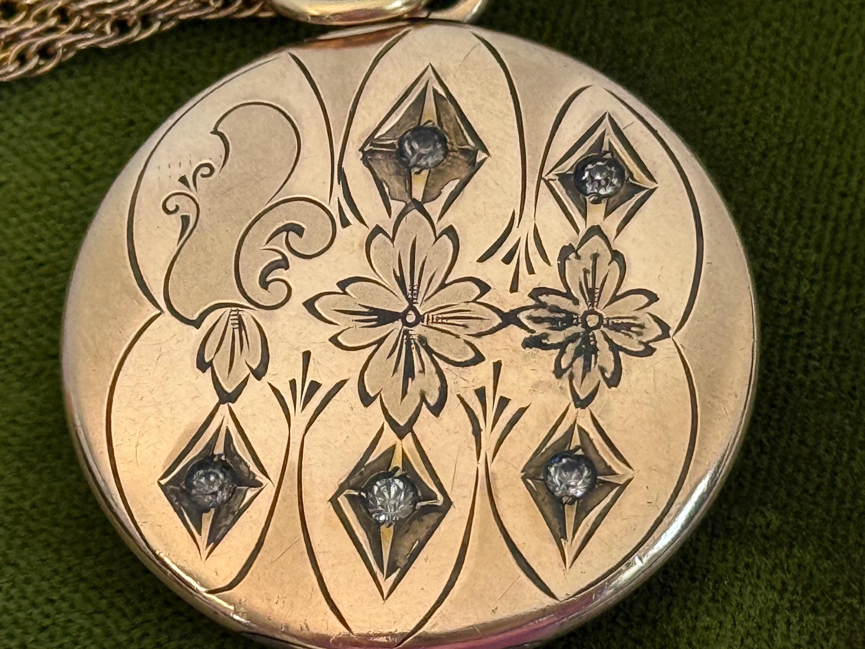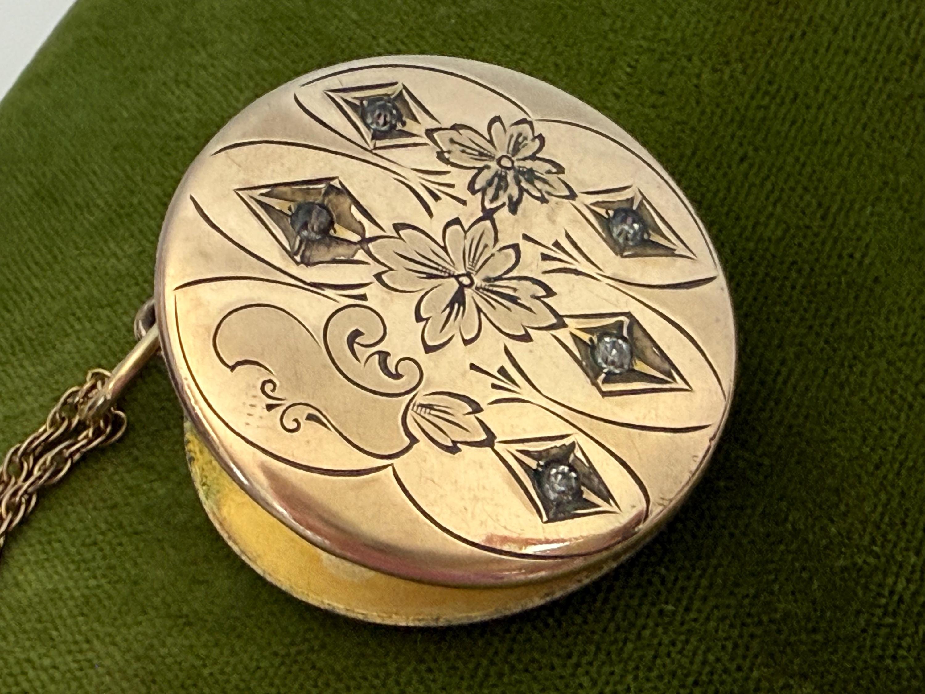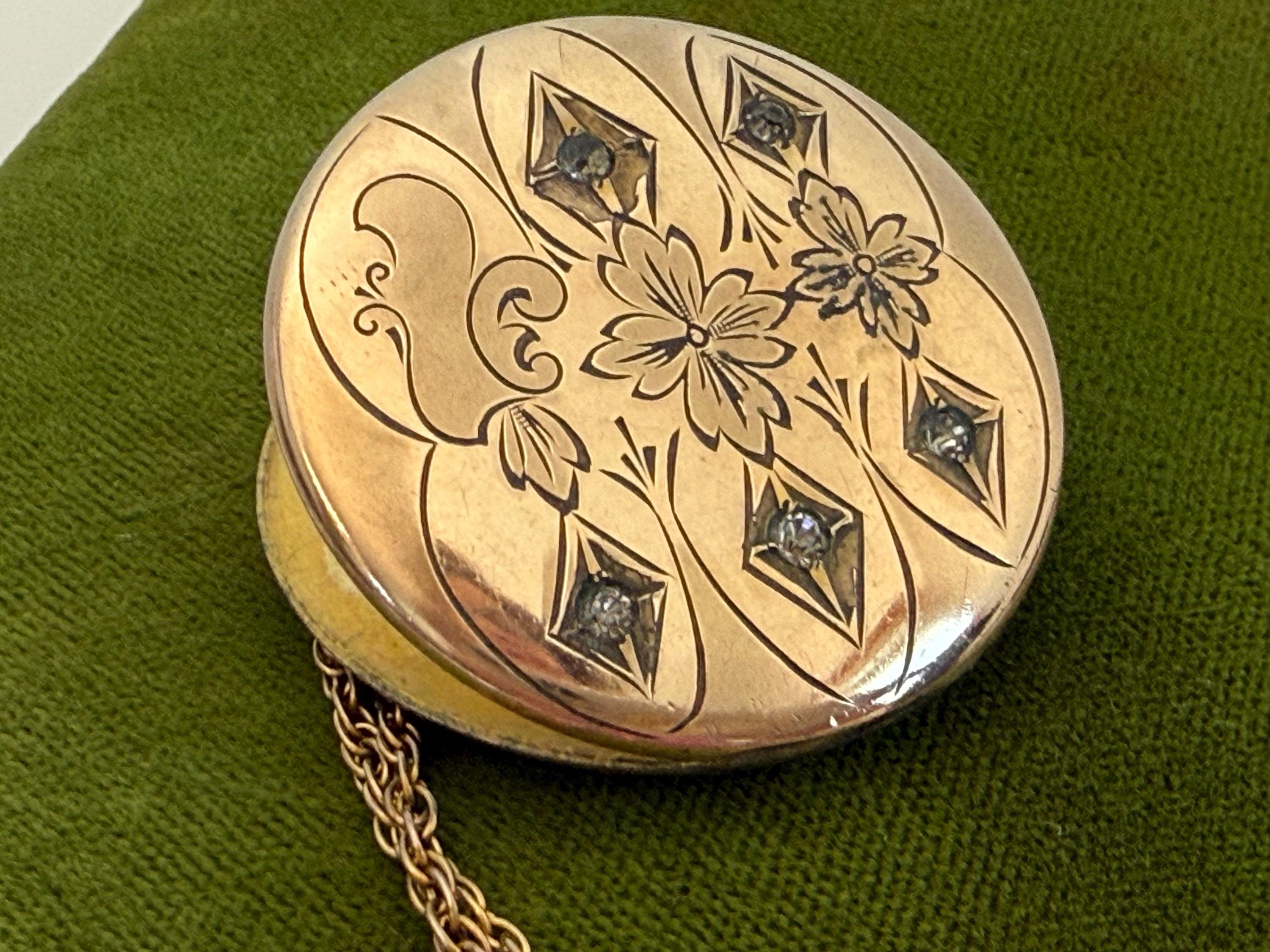 Lovely antique large round rose gold filled photo locket on a vintage twisted link gold filled chain. The round locket features a wonderful and intricate front with a subtle two-toned design with five "paste" accent stones. The locket is marked inside with the FM CO stamp.