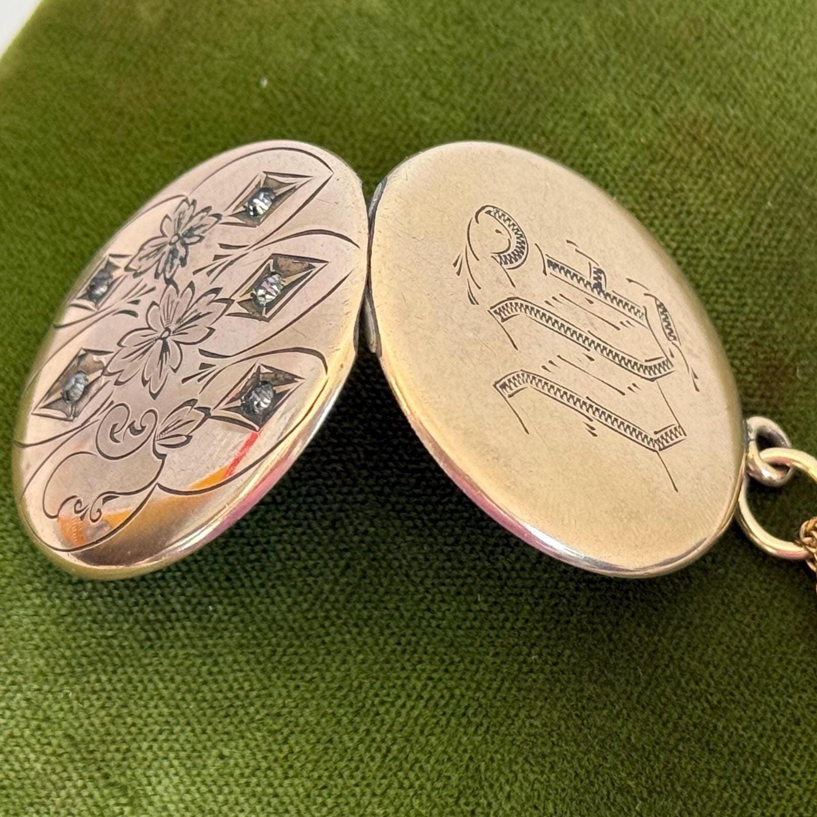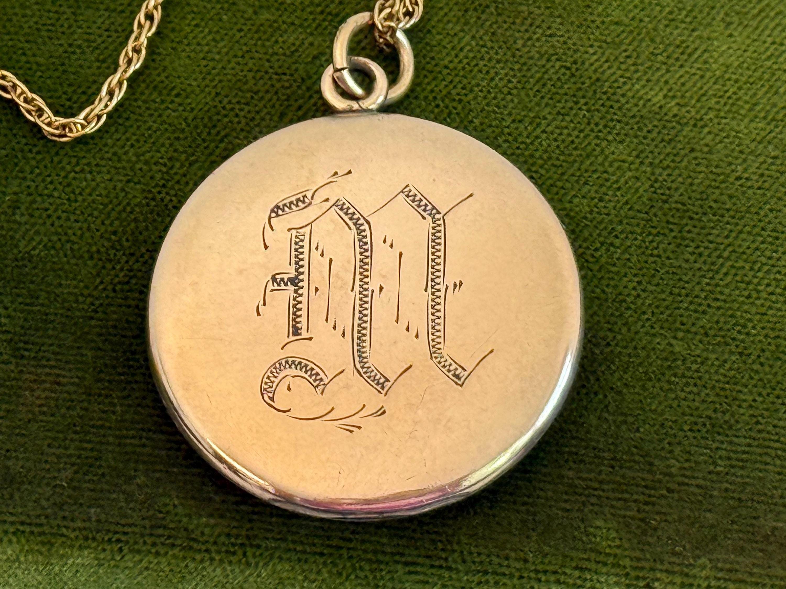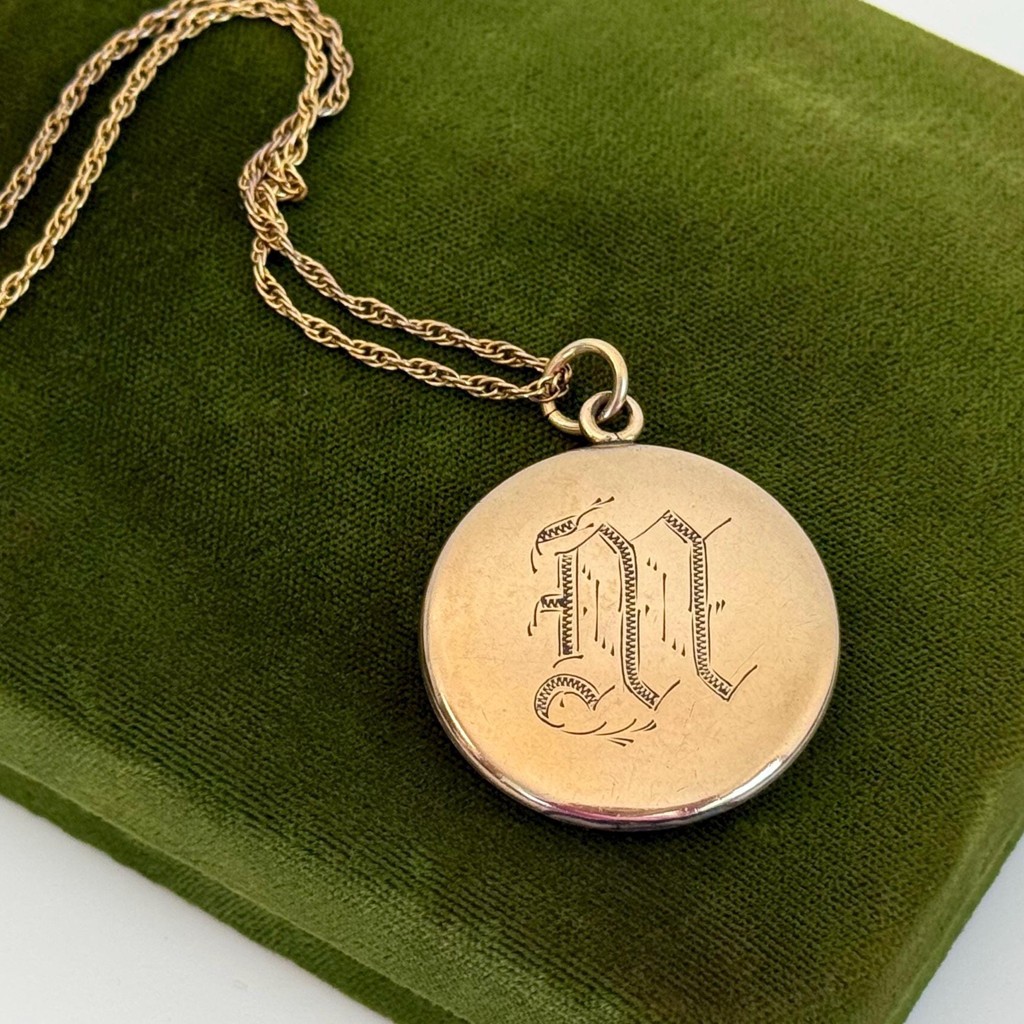 The back of the locket has a monogram of the the letter “M” in an old font engraved in the center on a matte background. The letter “M” is etched between its lines with a lovely bit of detail adding to the monogram’s presentation.