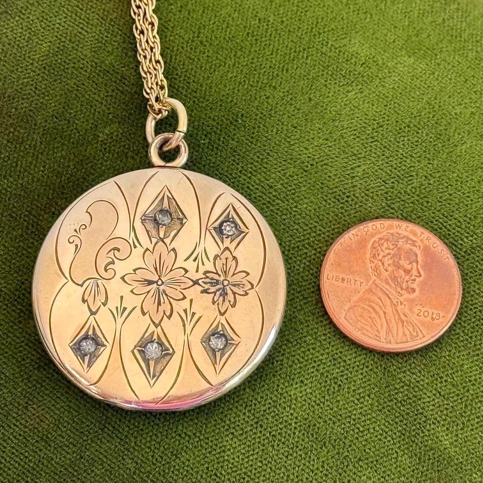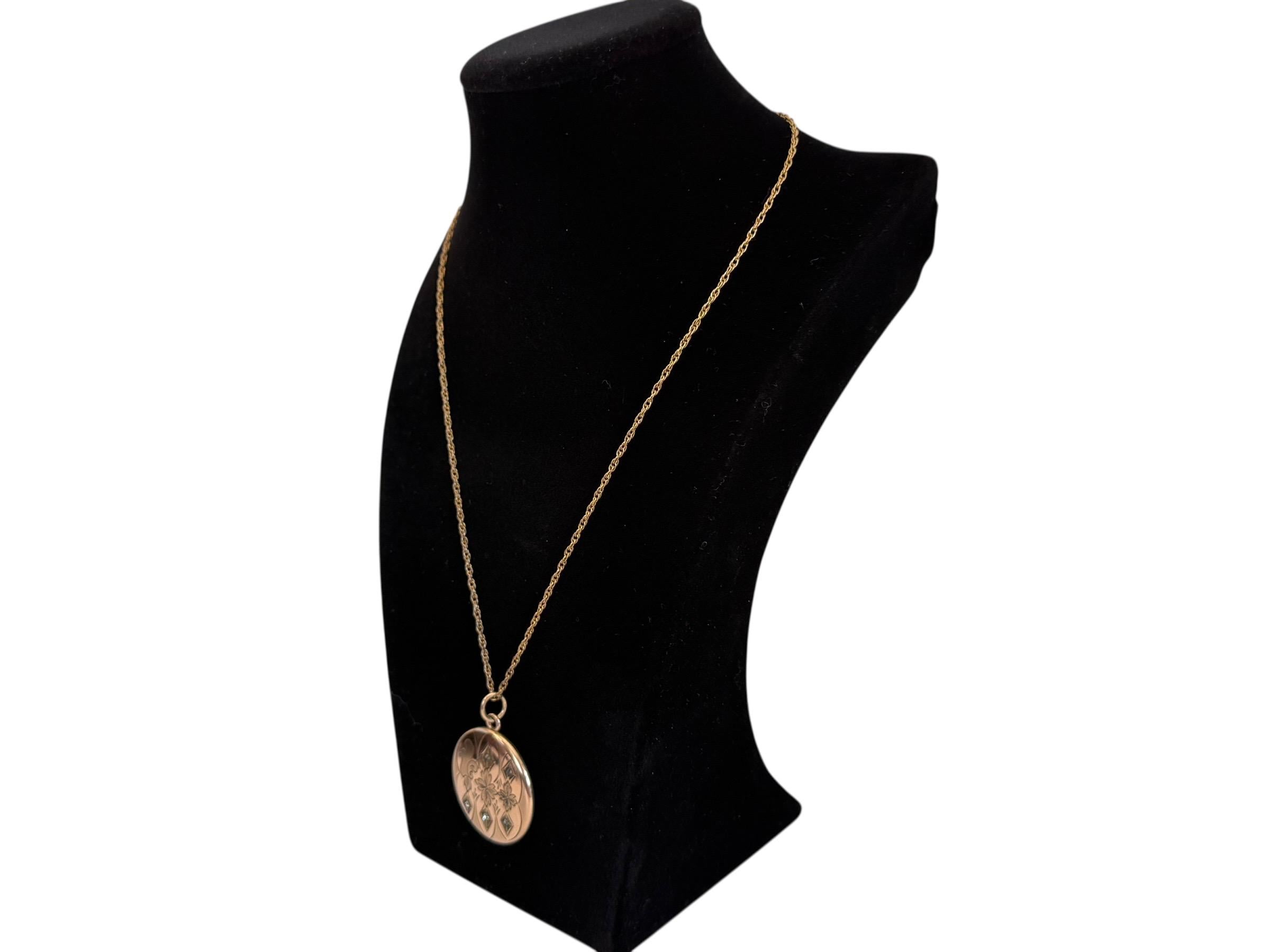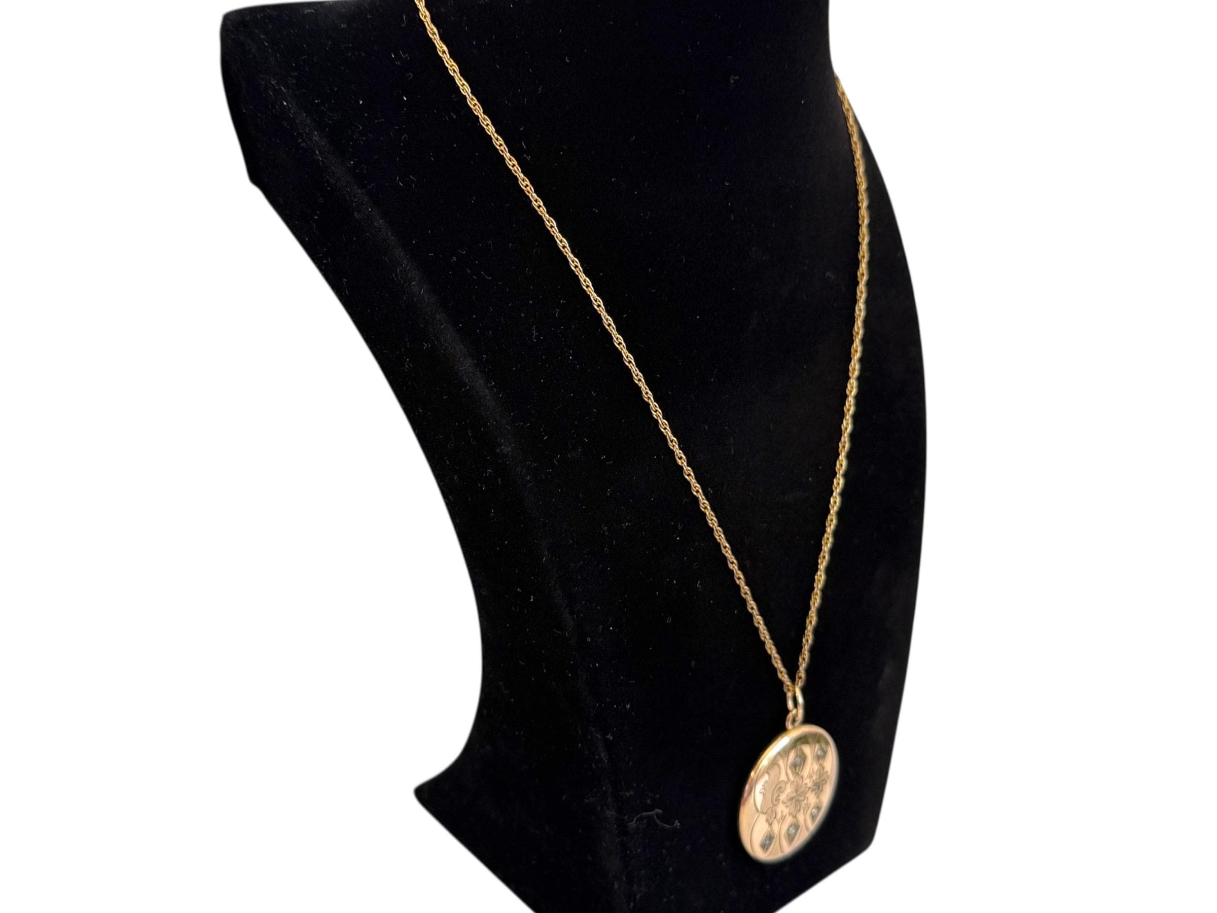 This antique round locket hangs from a vintage 19” long 14K gold filled twisted link chain. The locket, that has its hinge on the bottom, opens easily from the top side, and closes securely. The spring ring clasp on the chain also closes securely.