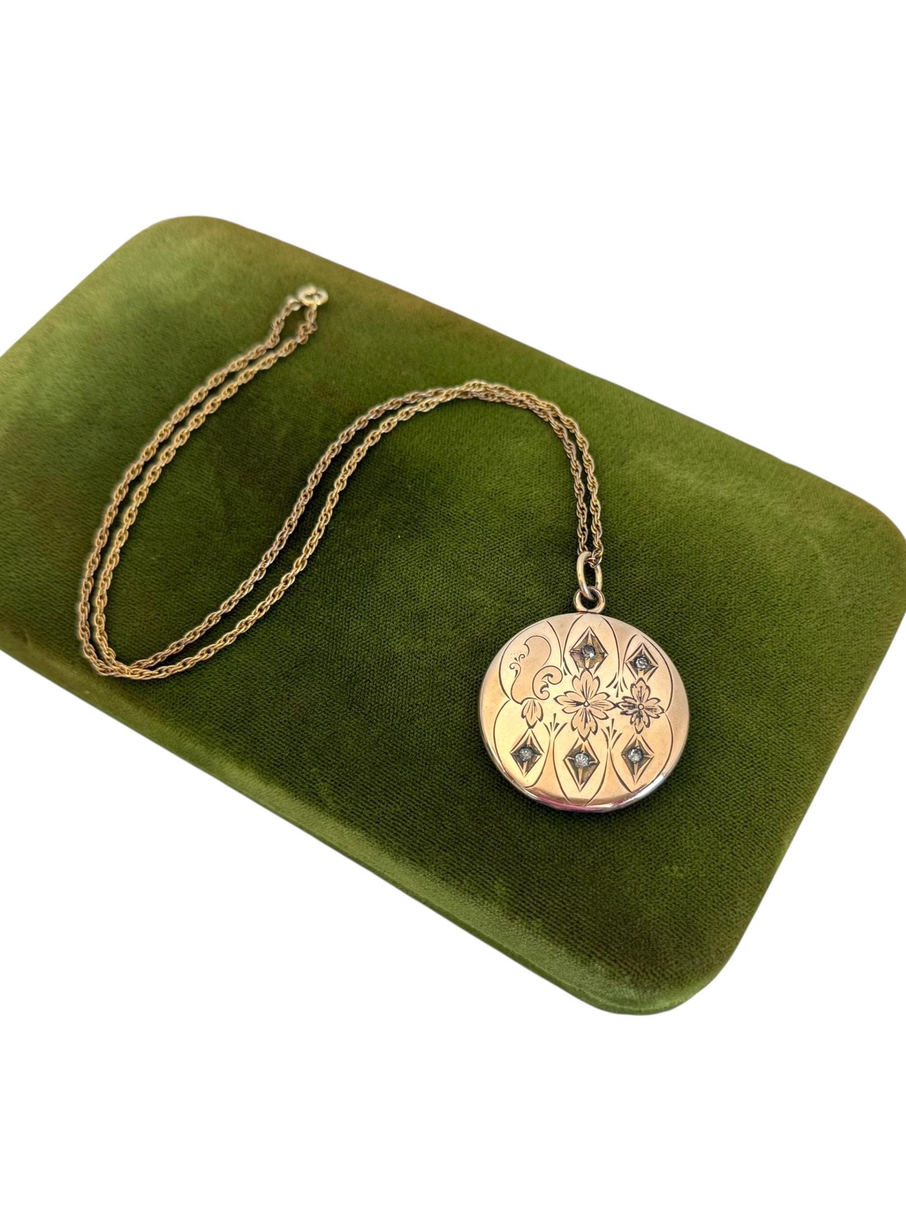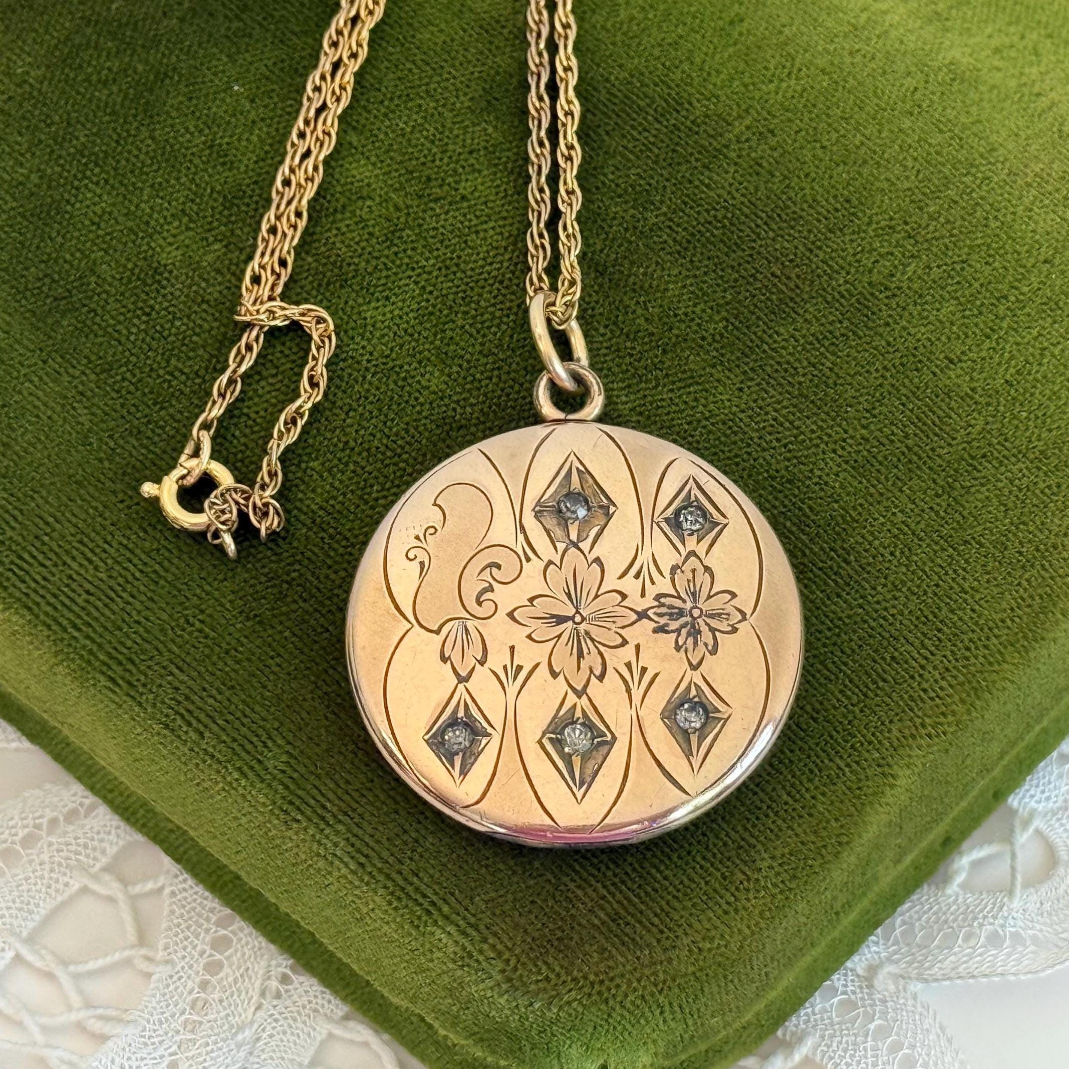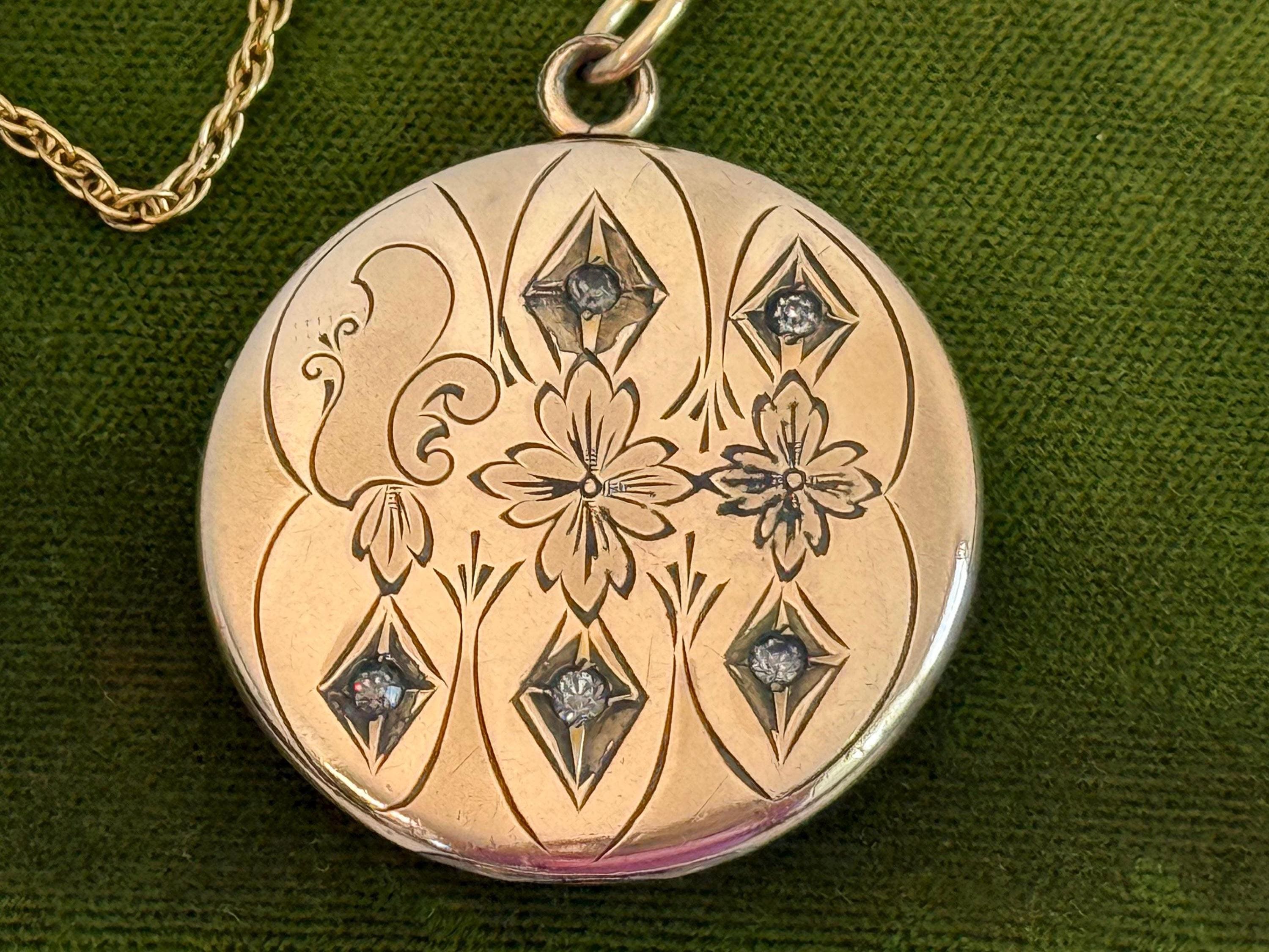 This antique round locket hangs from a vintage 19” long 14K gold filled twisted link chain. The locket, that has its hinge on the bottom, opens easily from the top side, and closes securely. The spring ring clasp on the chain also closes securely.