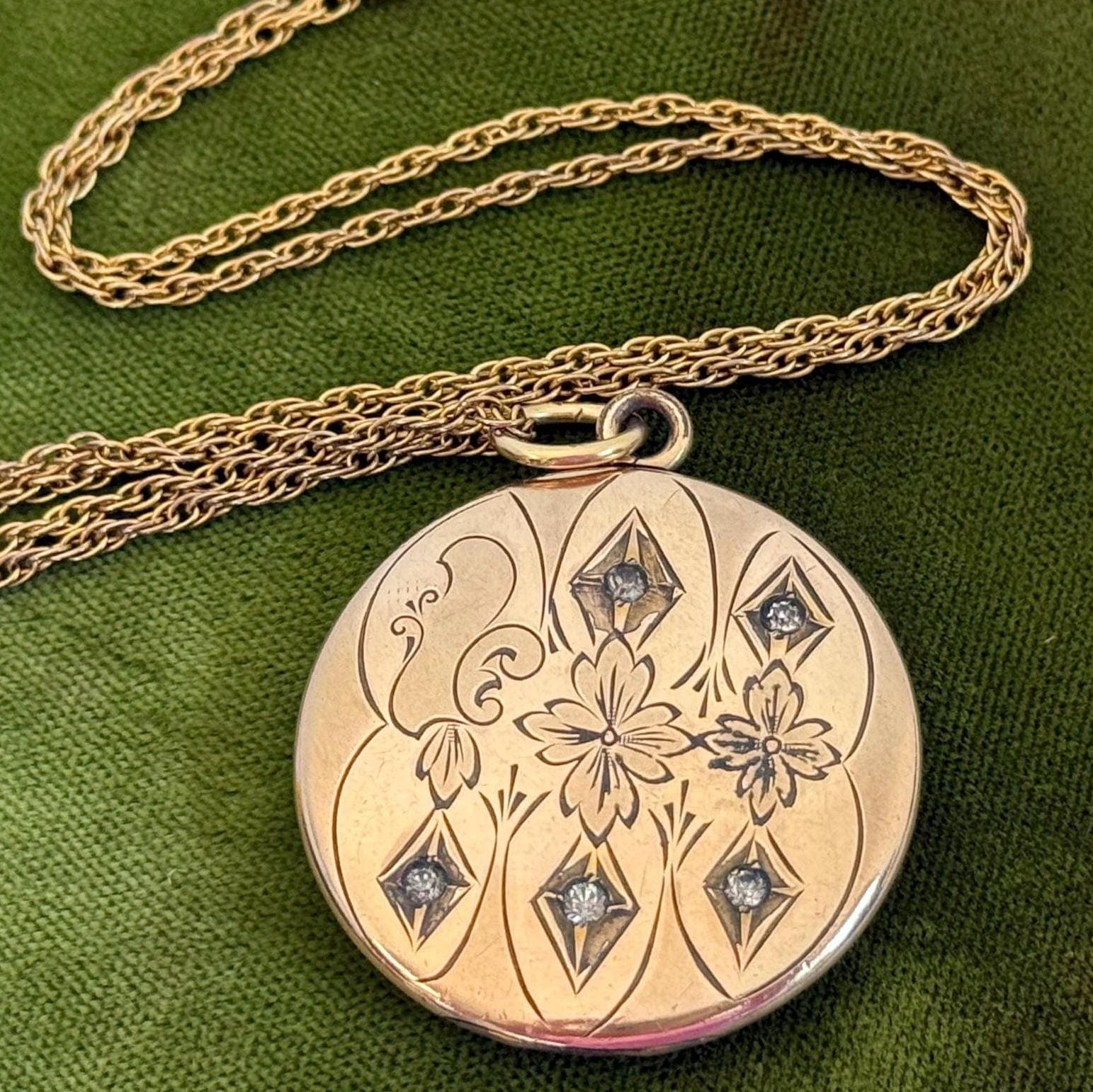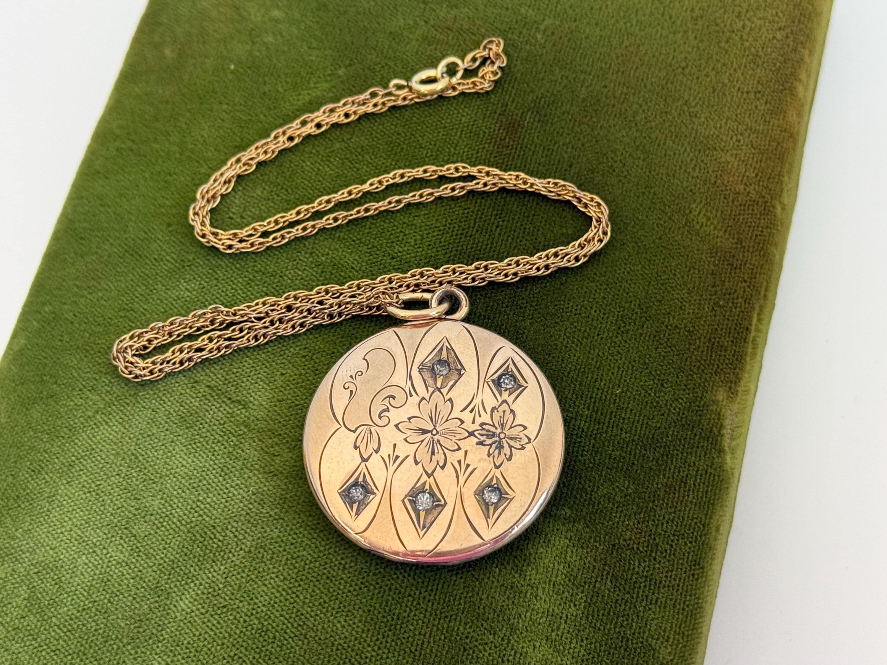 The front of this locket features some darker toned designs on a slightly lighter background. The darker shapes include two flowers, one on the center and one on the right side, a leafy shape on the far left as well as some diamond shapes above and below the two florals. The centers of the five diamond shapes each have a round clear paste or glass stone set inside them.