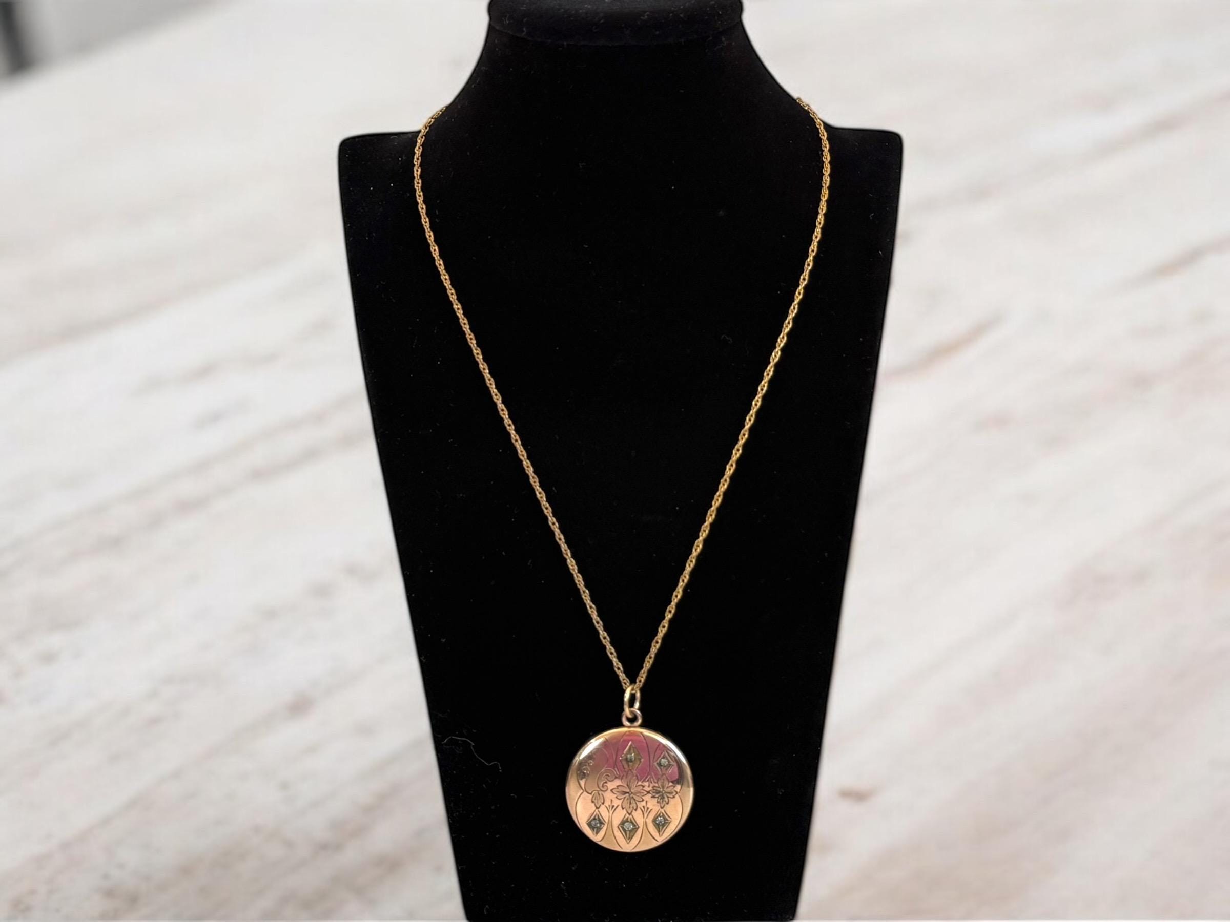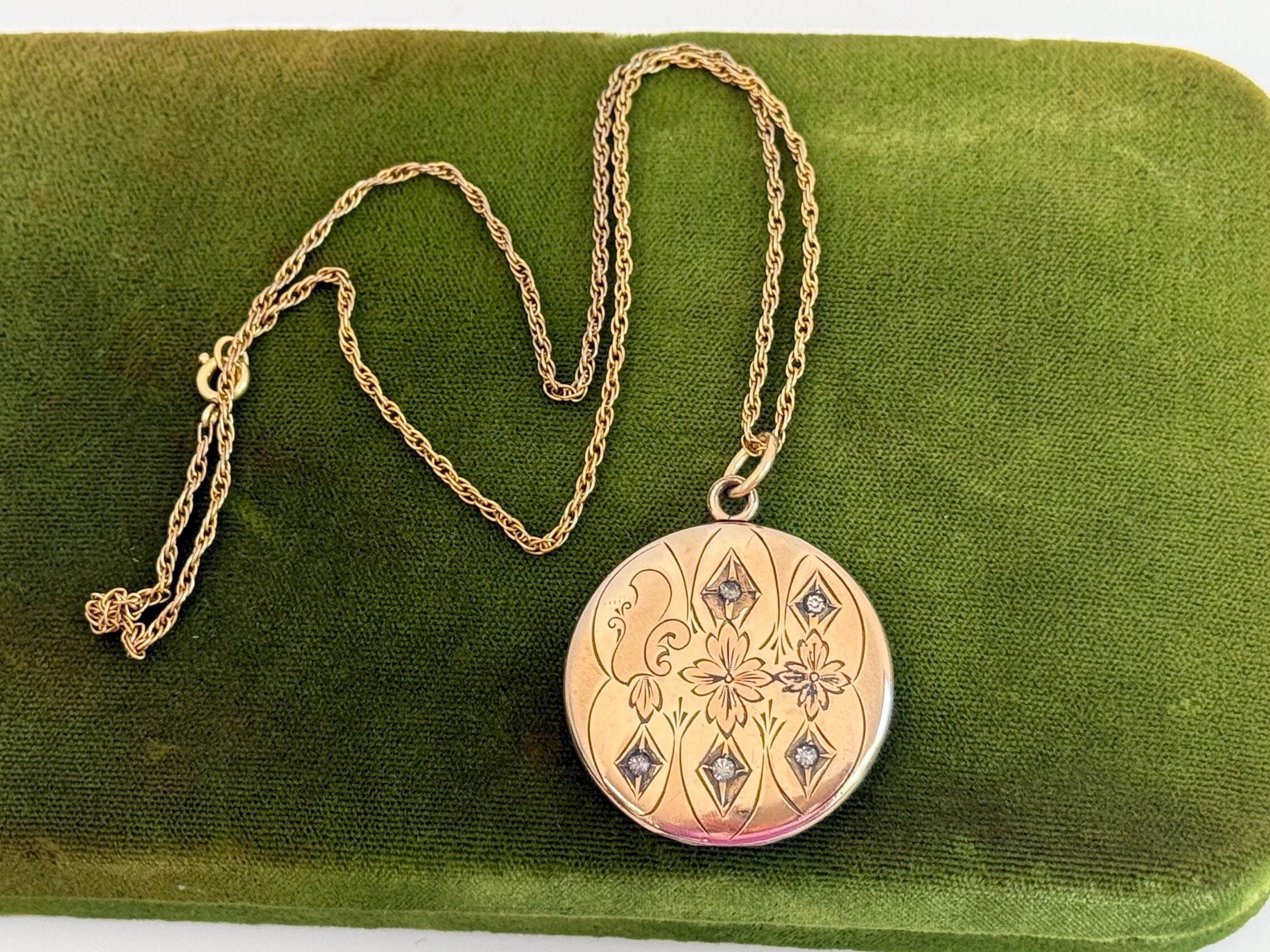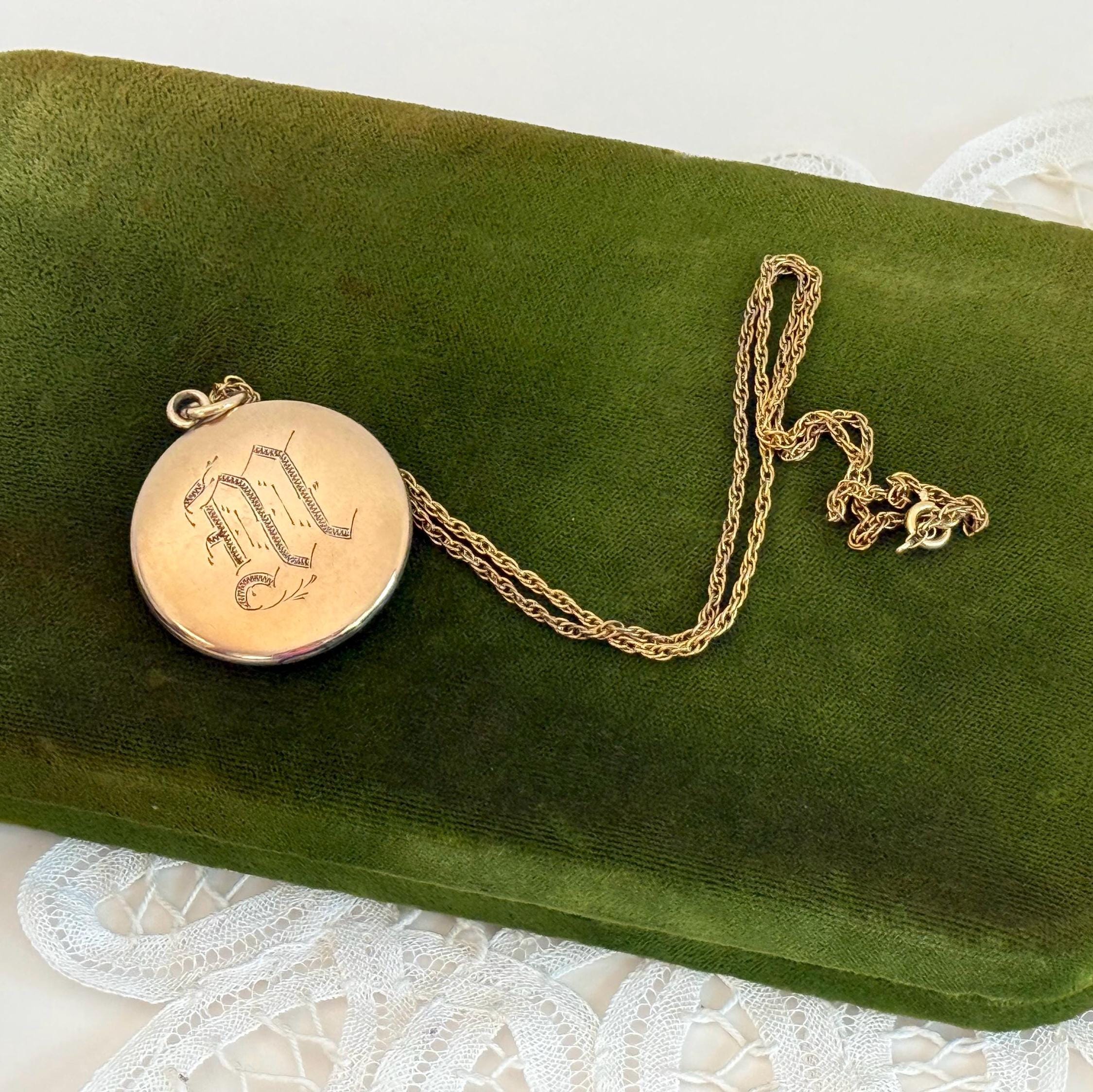 Art Deco Gold Filled Locket Necklace: Two-tone Etched Floral Monogram, 14K GF Chain