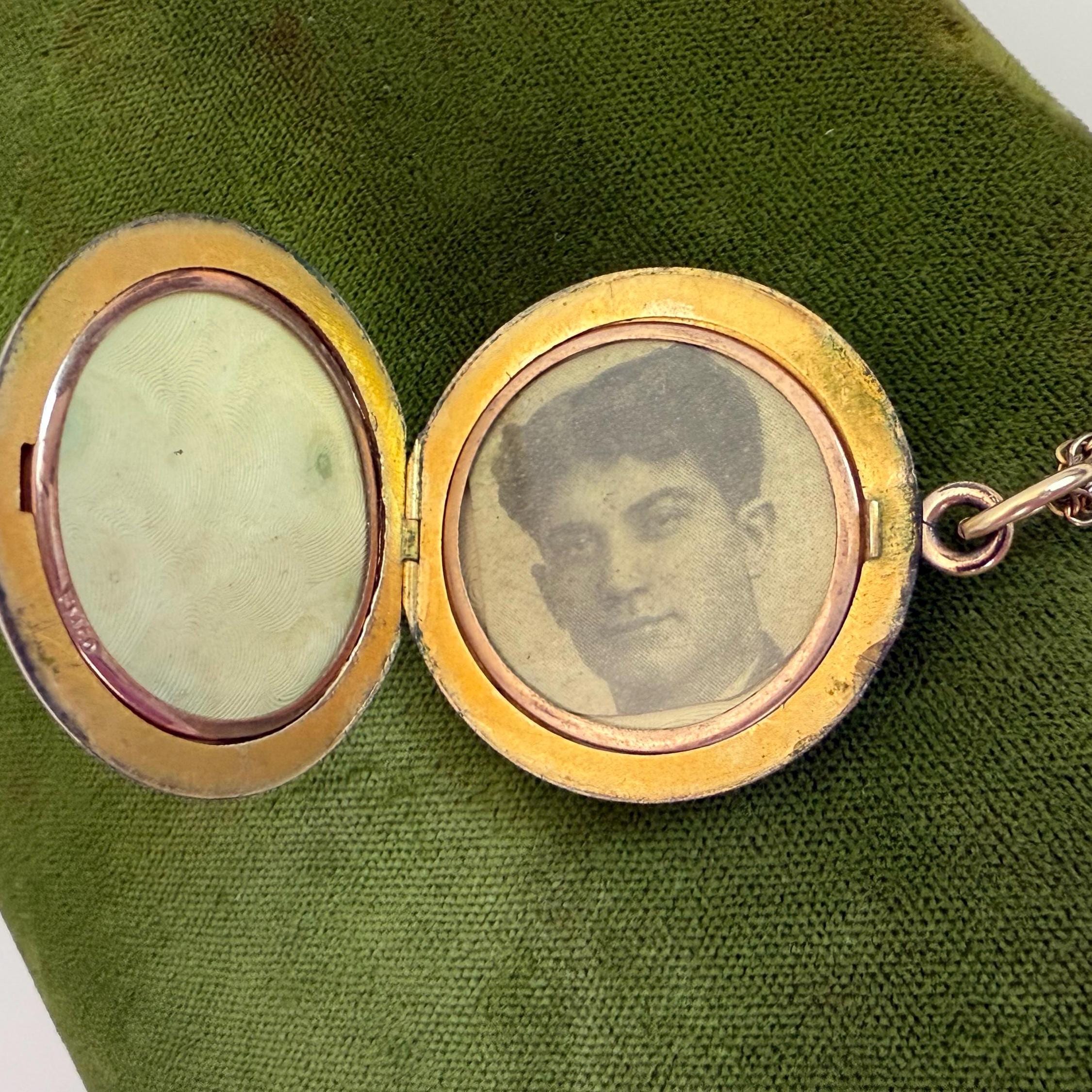 This Art Deco locket, which is circa 1920s, has two frames and two covers inside. Currently there is one old sepia tone photo of a young man with a full head of dark hair in one side, and a paper backing on the other side. The locket can fit two photos inside, one on each side.