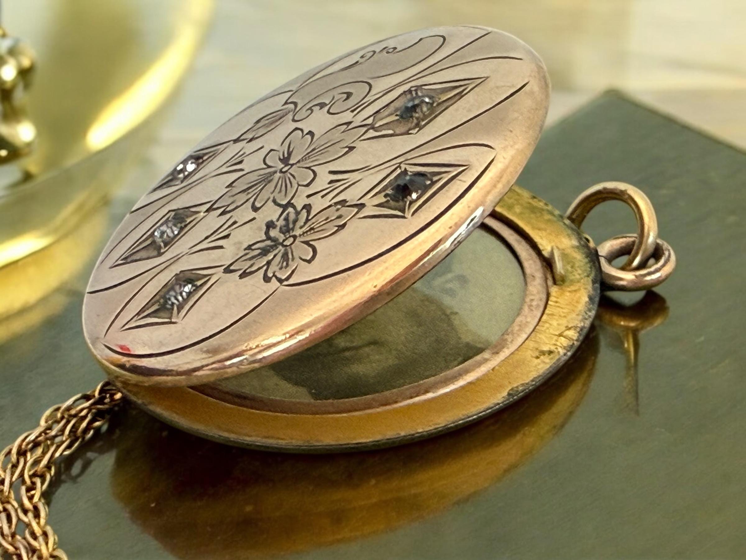 The locket is in nice antique condition with light wear on both sides as would be expected an antique item that is circa early 1900s. Some of the paste stones have darkened with age. The vintage chain has age appropriate patina - see photos and video for detail.