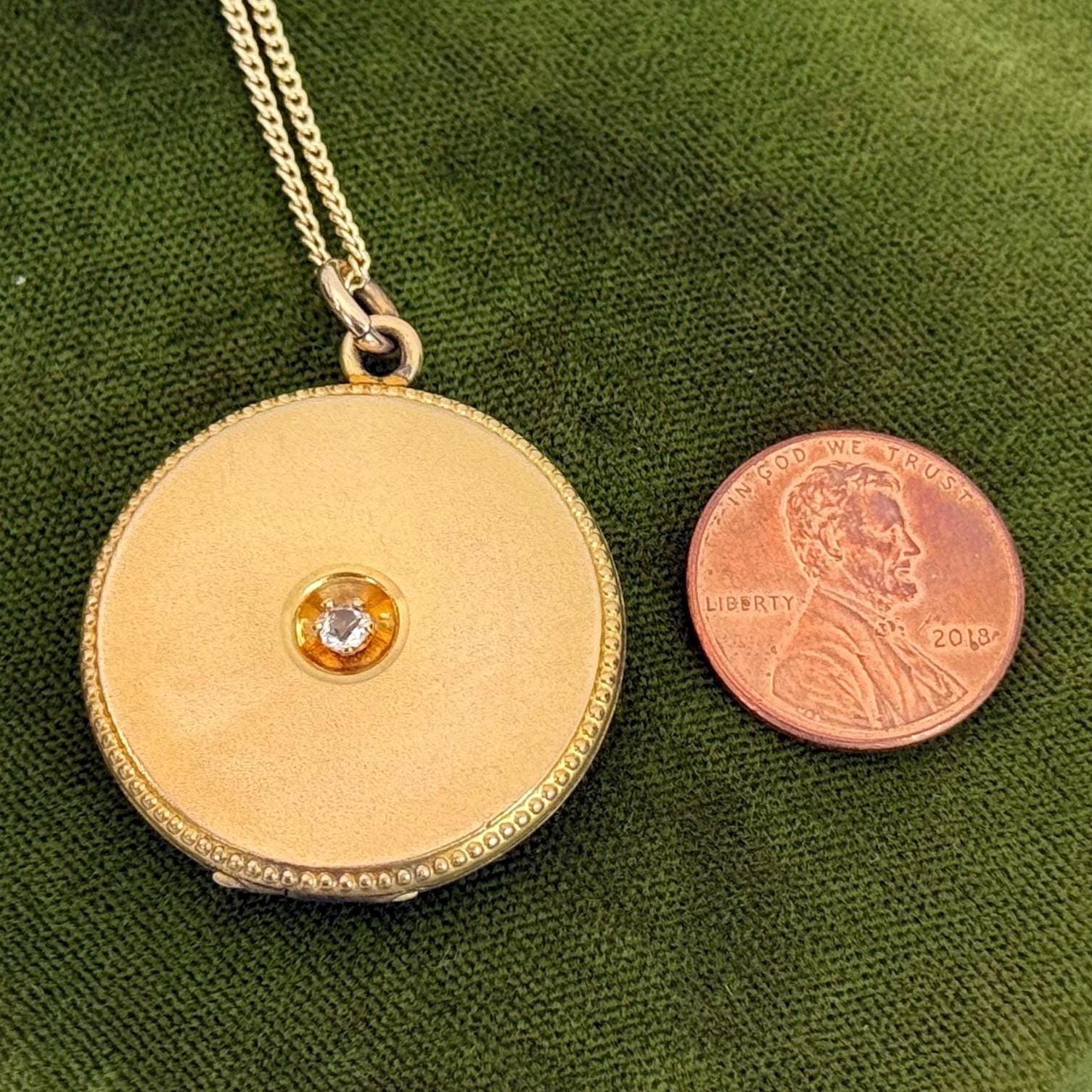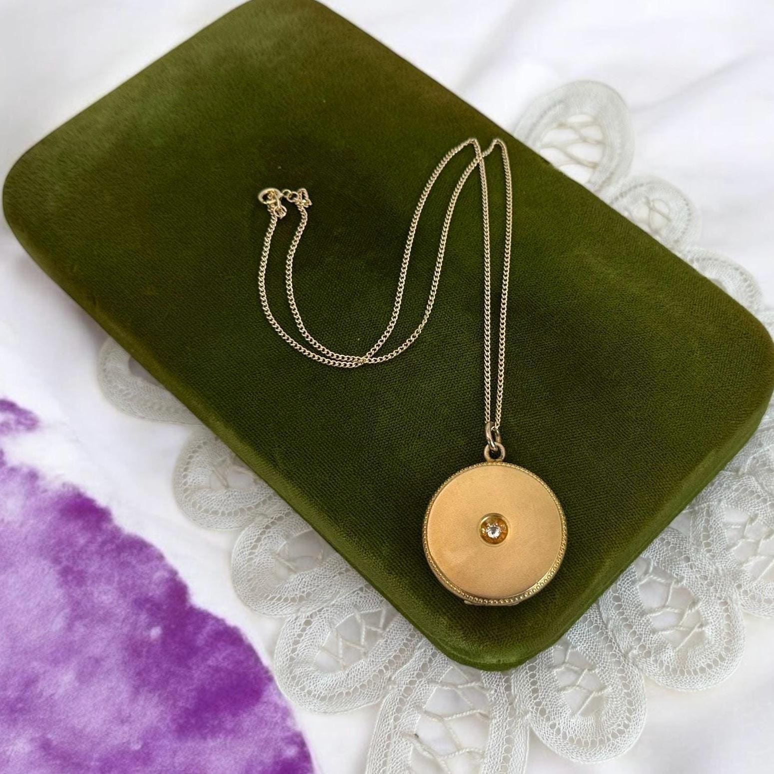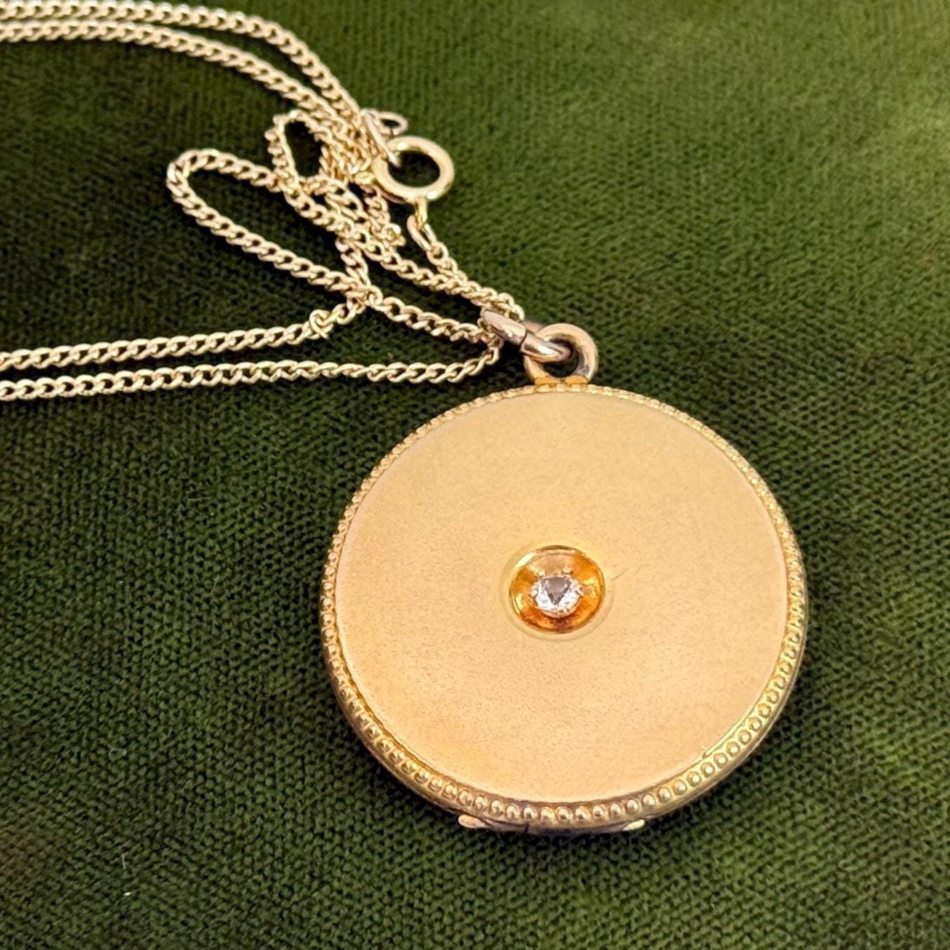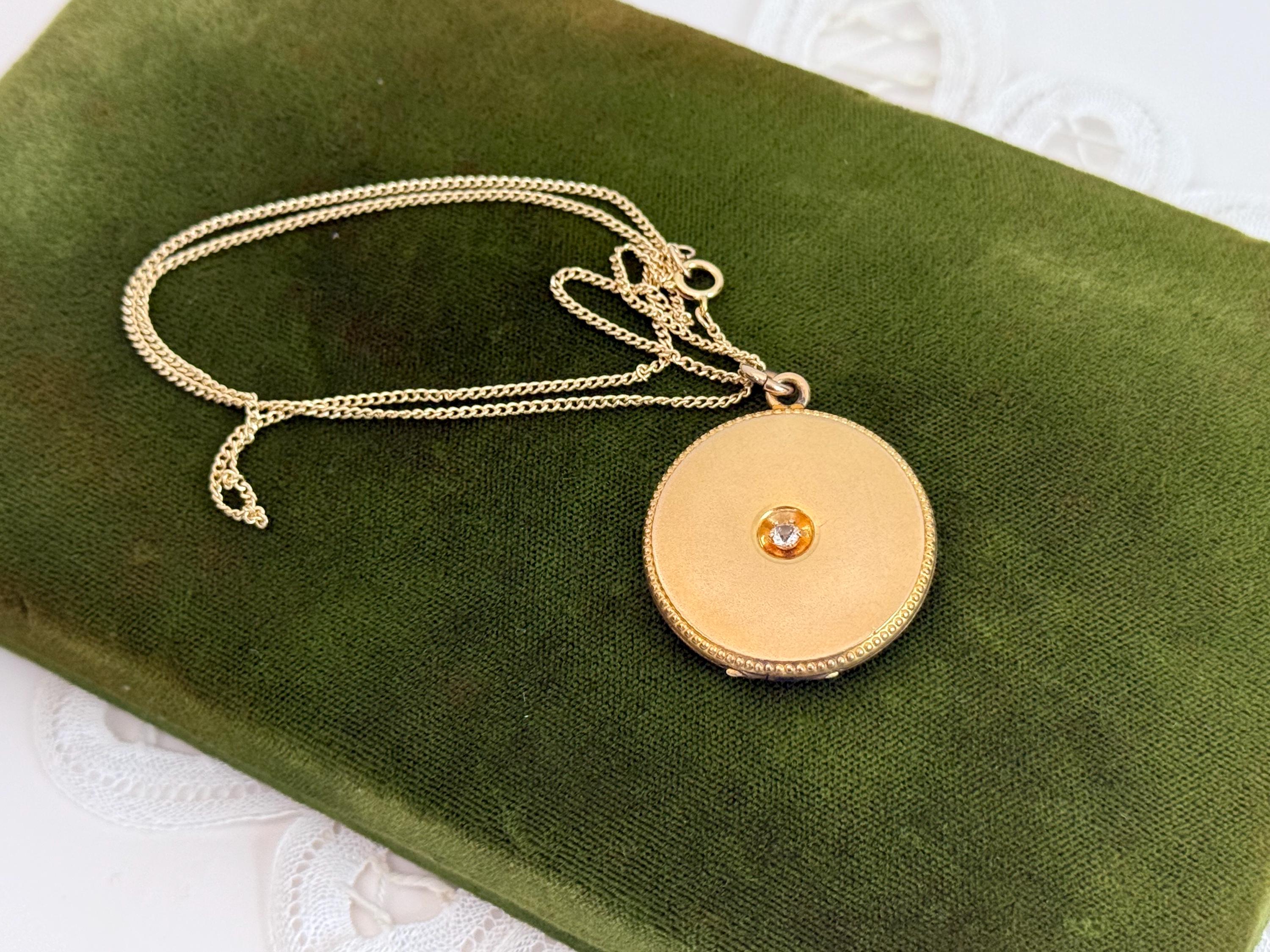 Lovely antique Art Nouveau gold filled round photo locket on a new 14K gold filled chain. The front features a central faceted glass stone and a decorative outer edge. The center glass gem is prong set. Around the outer edges of this round locket is a frame of tiny round dots giving the 1920s era locket more texture around the edges. (See NOTE below about paste stones). The back has a satin finish with no design - it is plain.