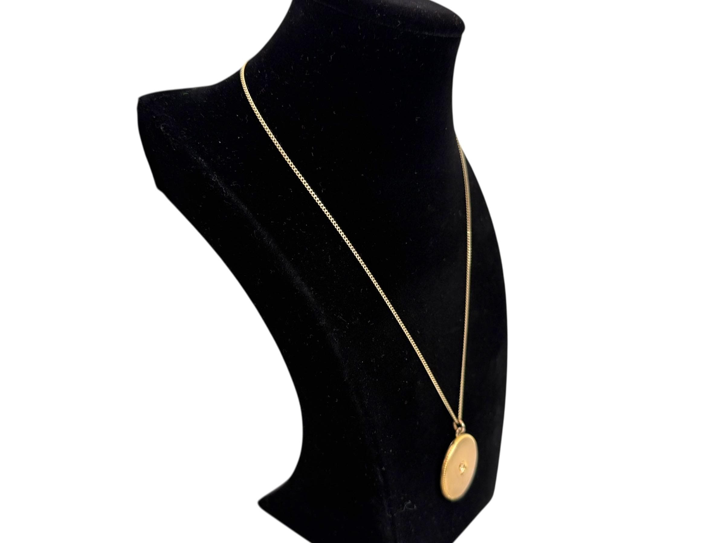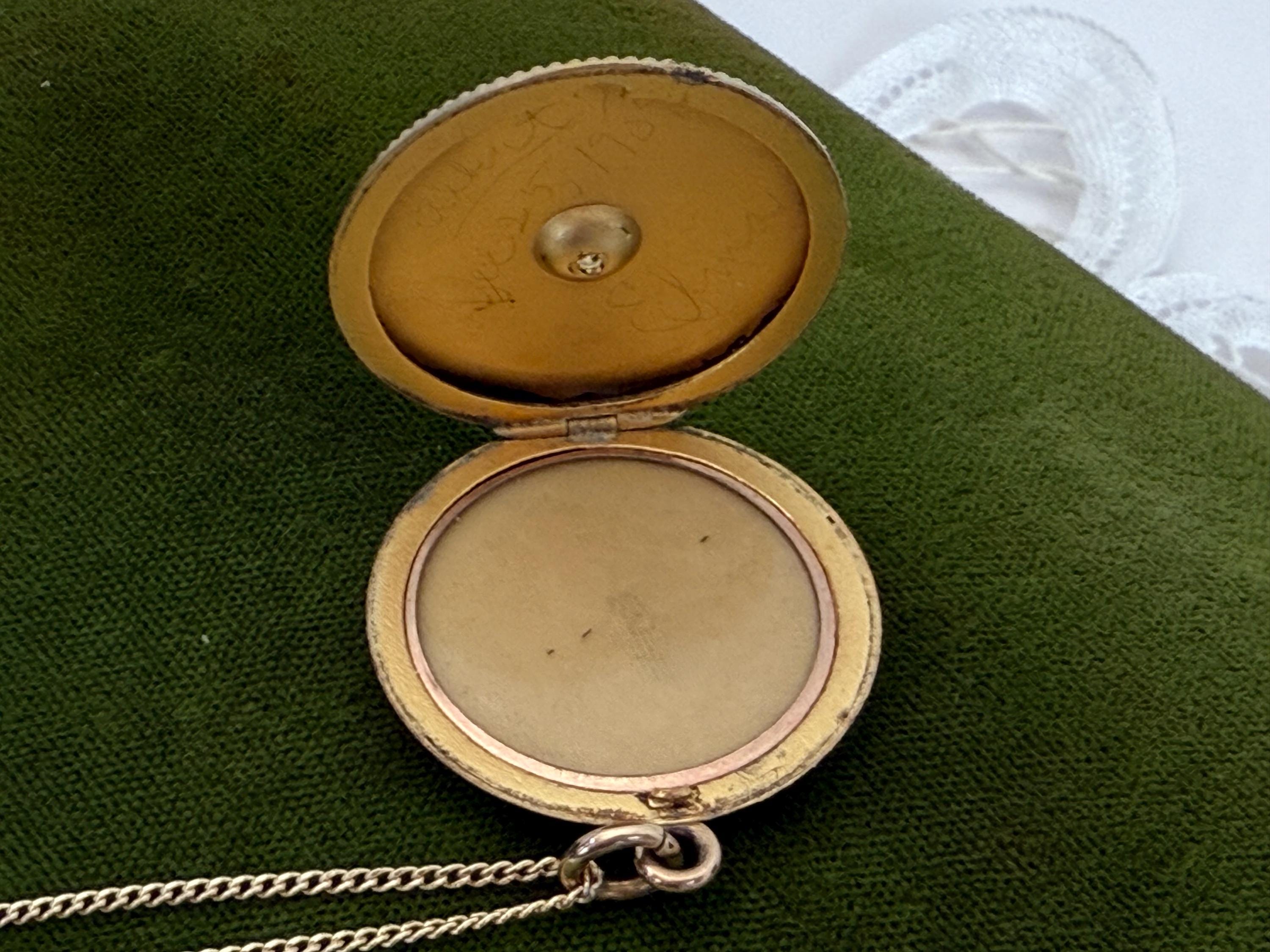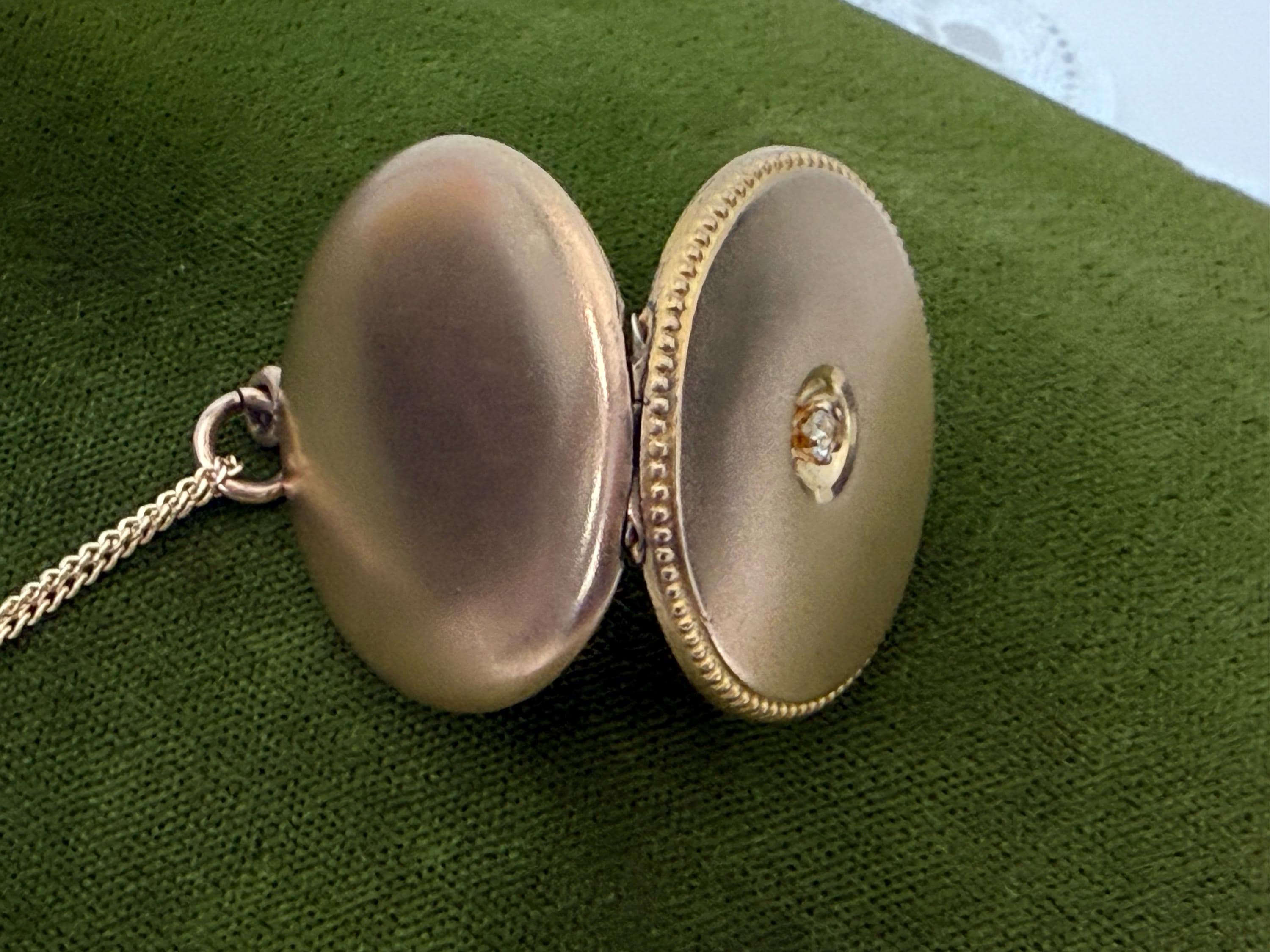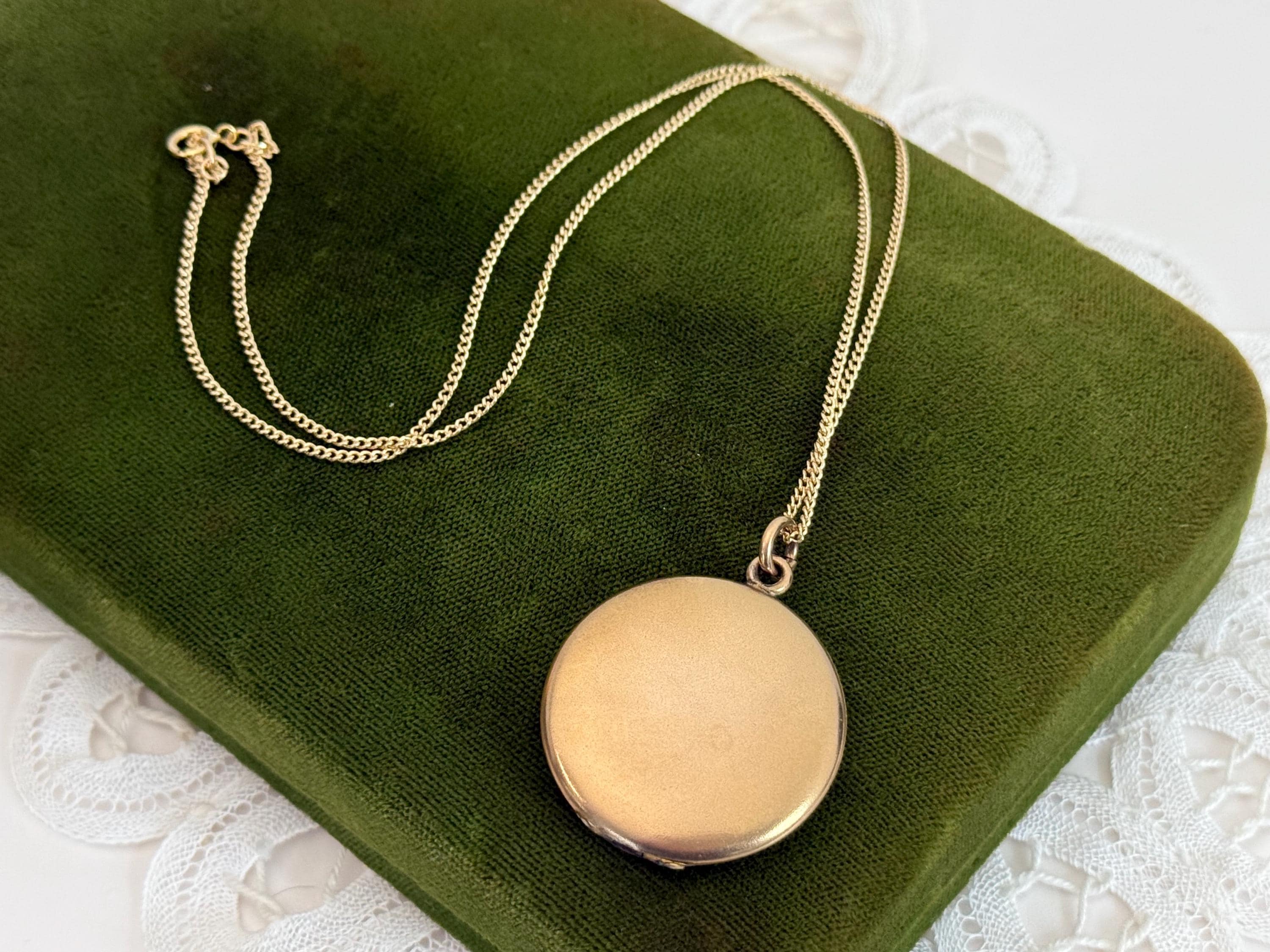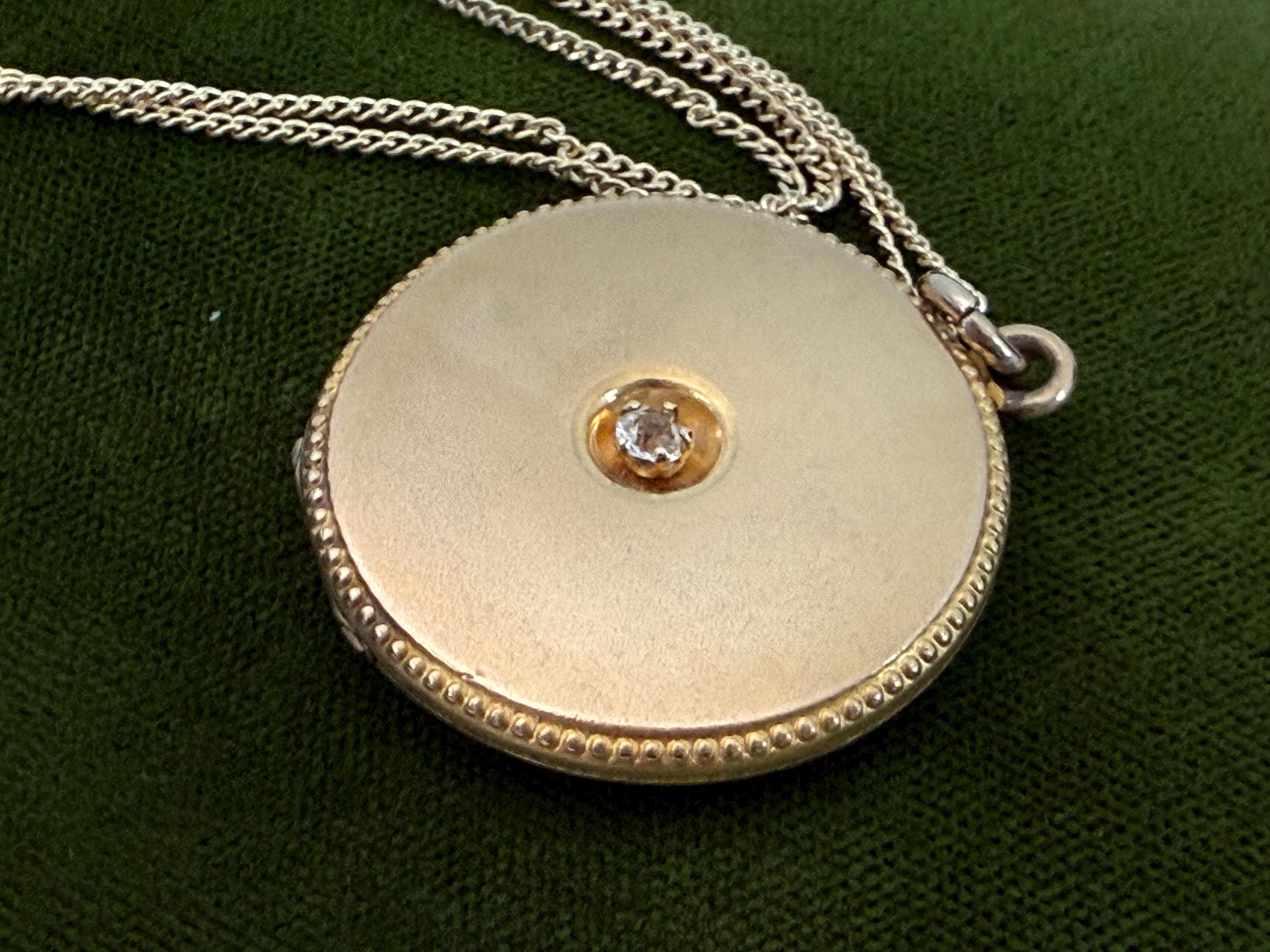 Lovely antique Art Nouveau gold filled round photo locket on a new 14K gold filled chain. The front features a central faceted glass stone and a decorative outer edge. The center glass gem is prong set. Around the outer edges of this round locket is a frame of tiny round dots giving the 1920s era locket more texture around the edges. (See NOTE below about paste stones). The back has a satin finish with no design - it is plain.