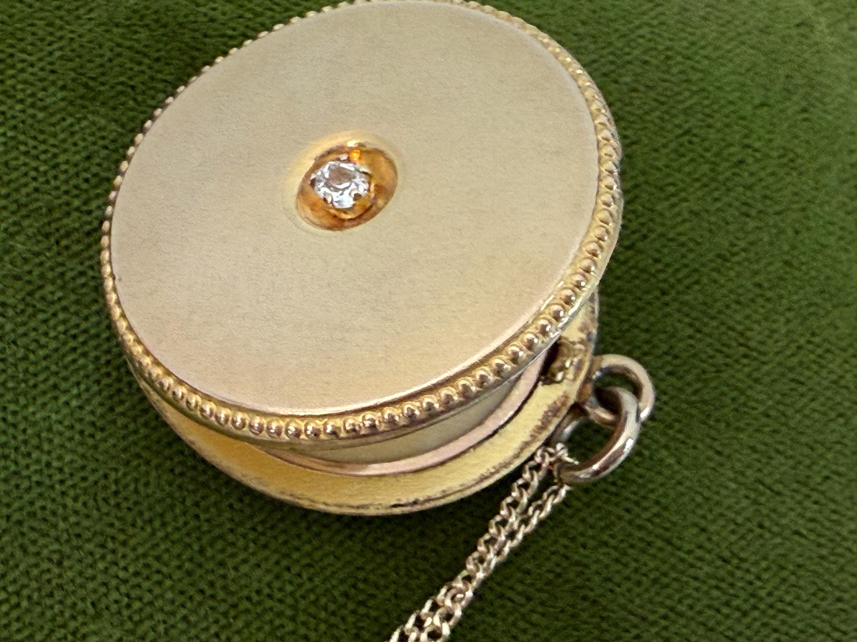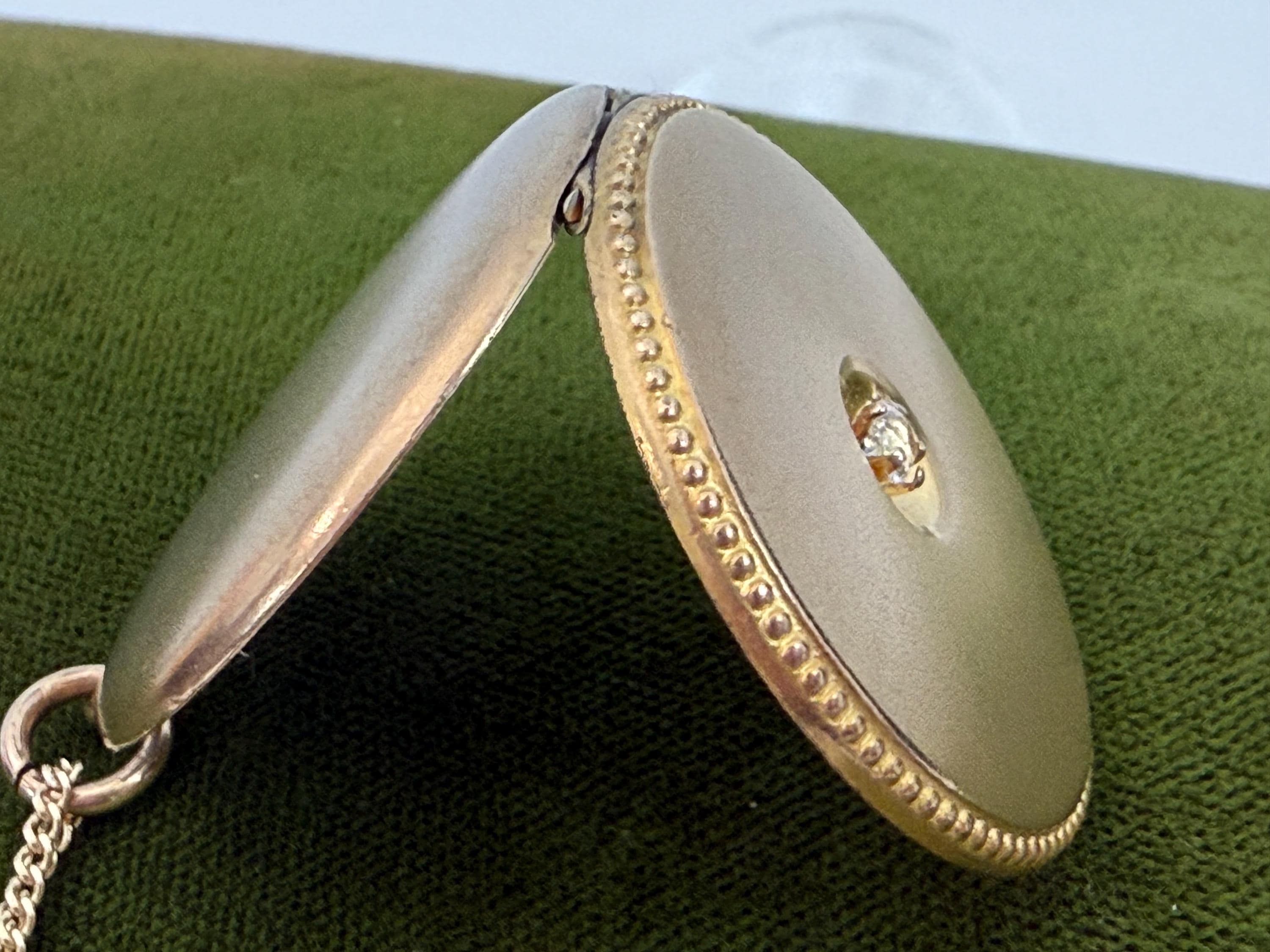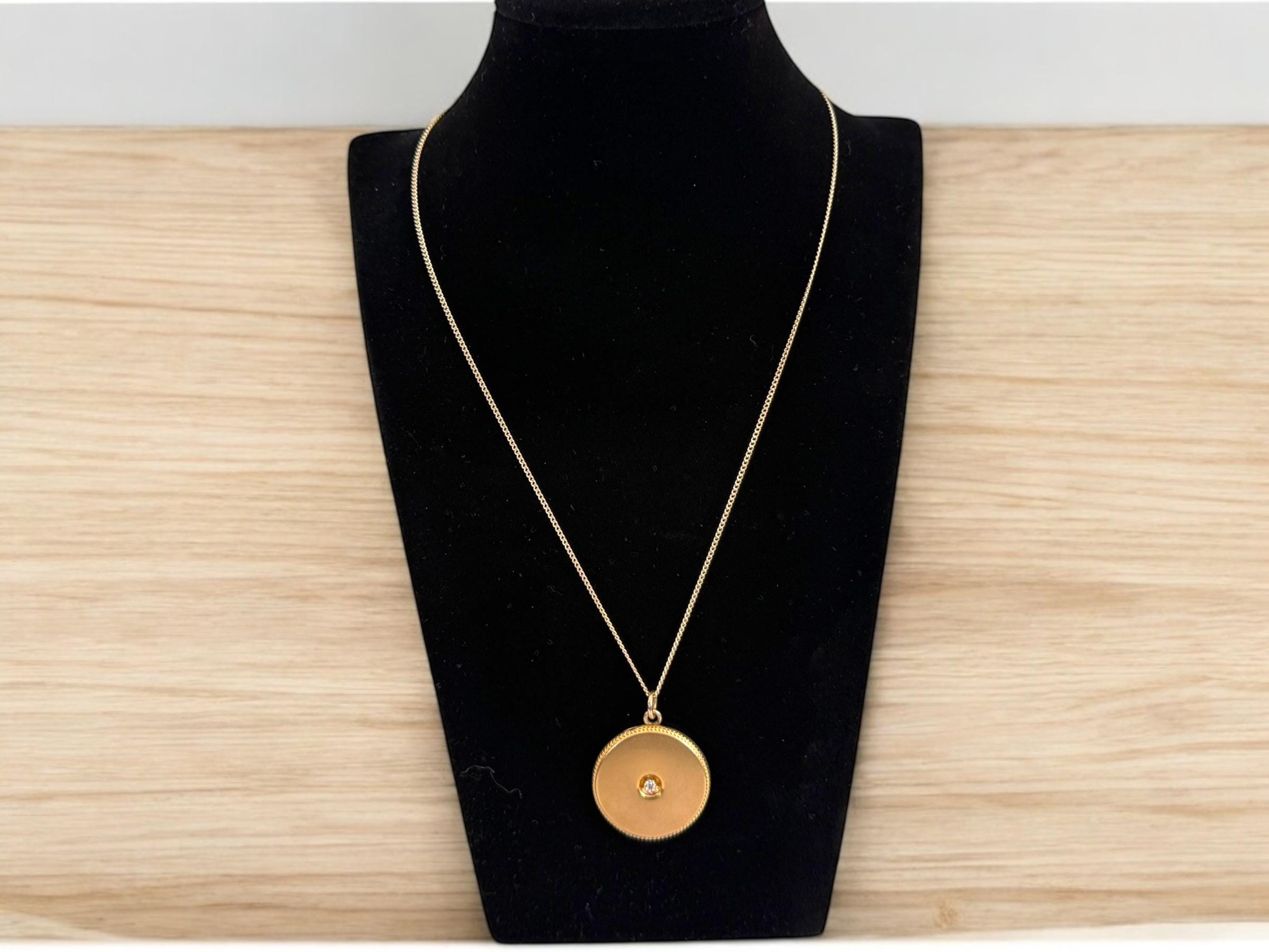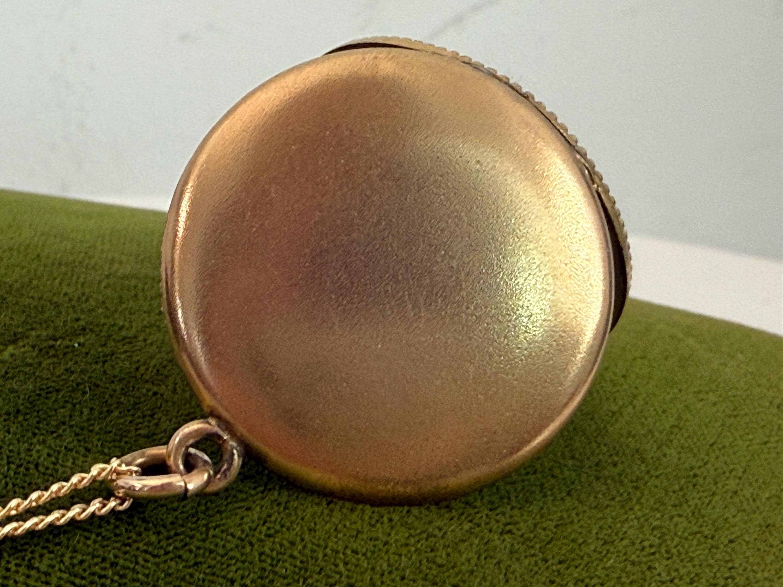 Lovely antique Art Nouveau gold filled round photo locket on a new 14K gold filled chain. The front features a central faceted glass stone and a decorative outer edge. The center glass gem is prong set. Around the outer edges of this round locket is a frame of tiny round dots giving the 1920s era locket more texture around the edges. (See NOTE below about paste stones). The back has a satin finish with no design - it is plain.
