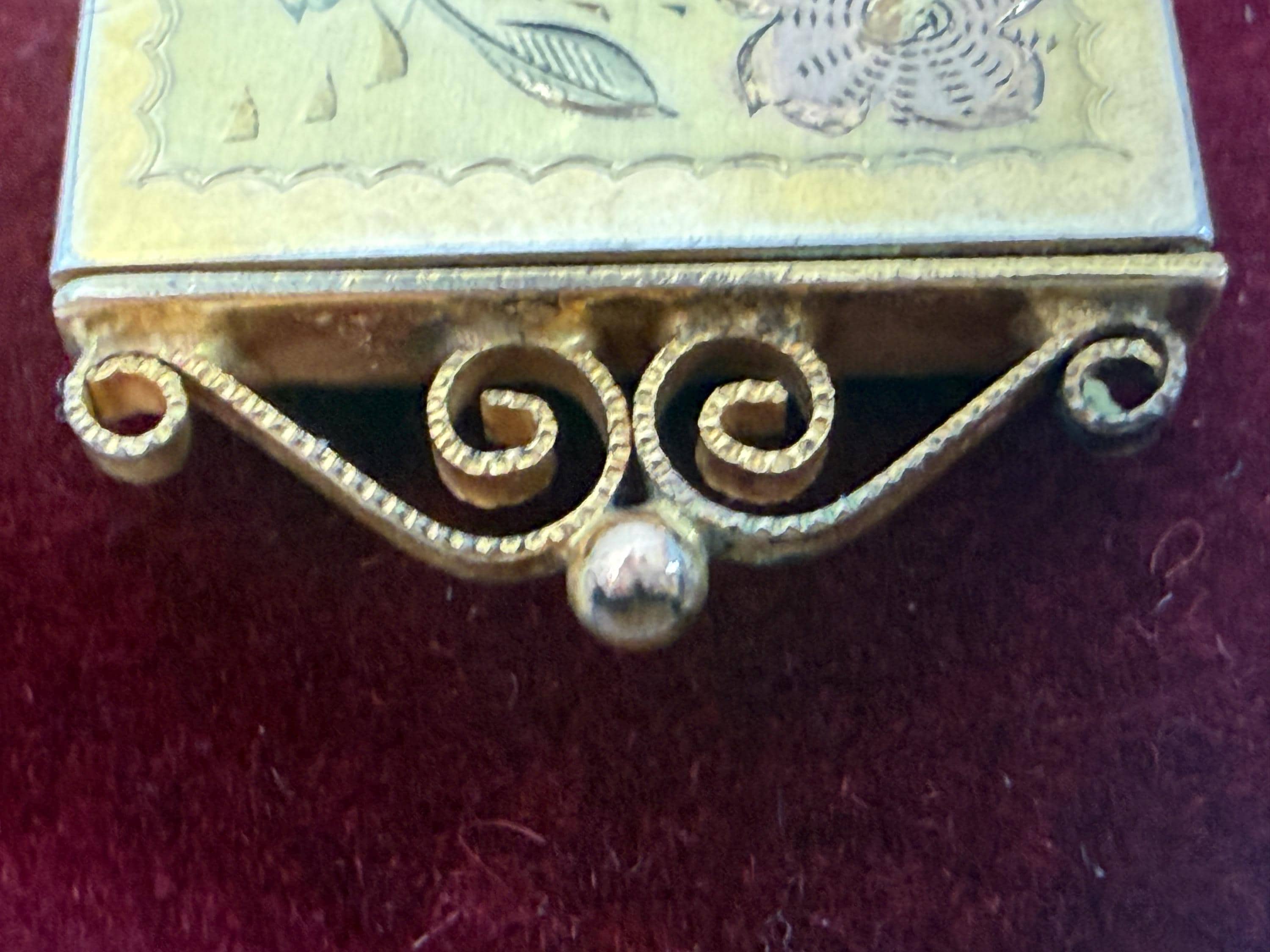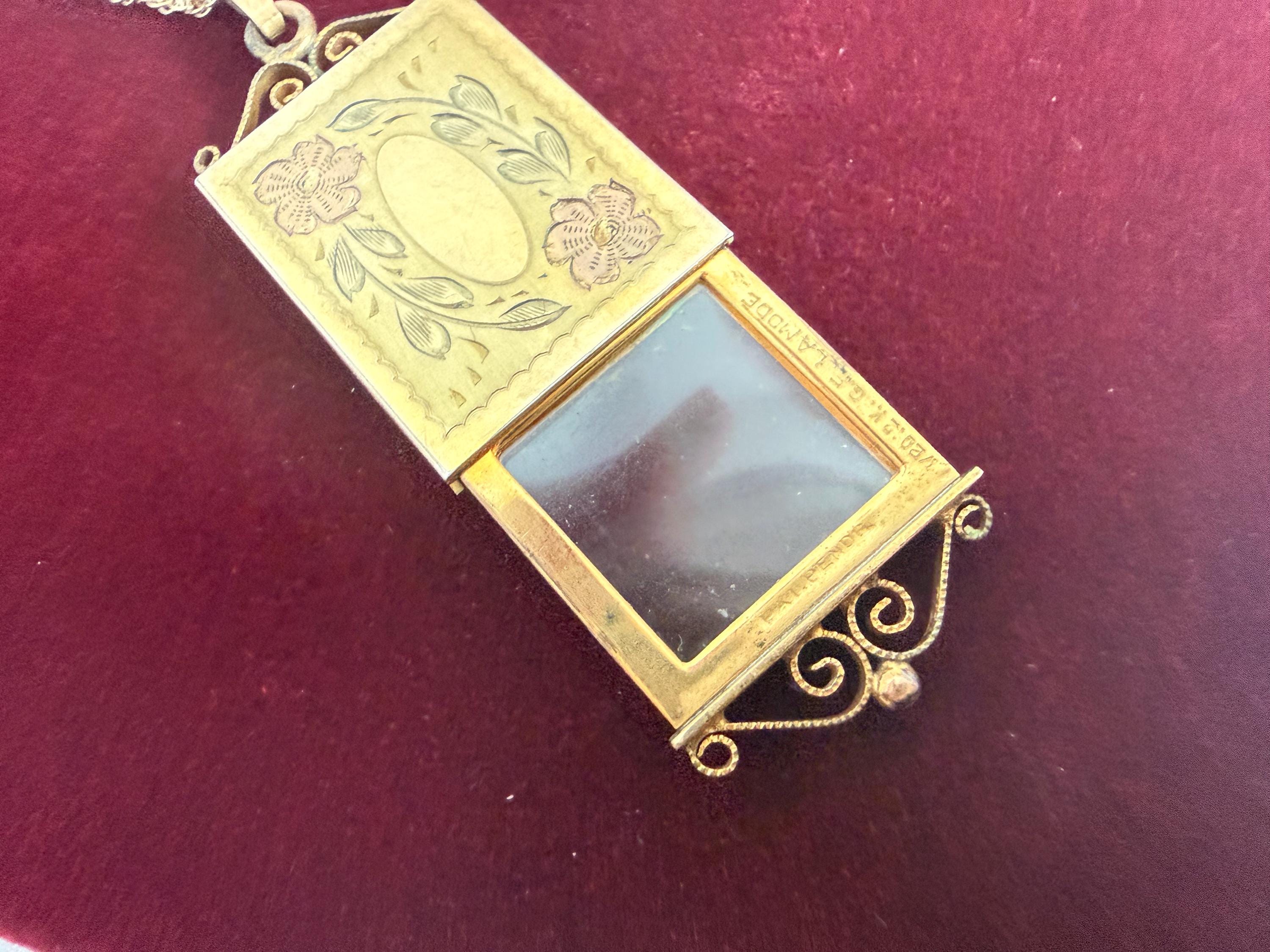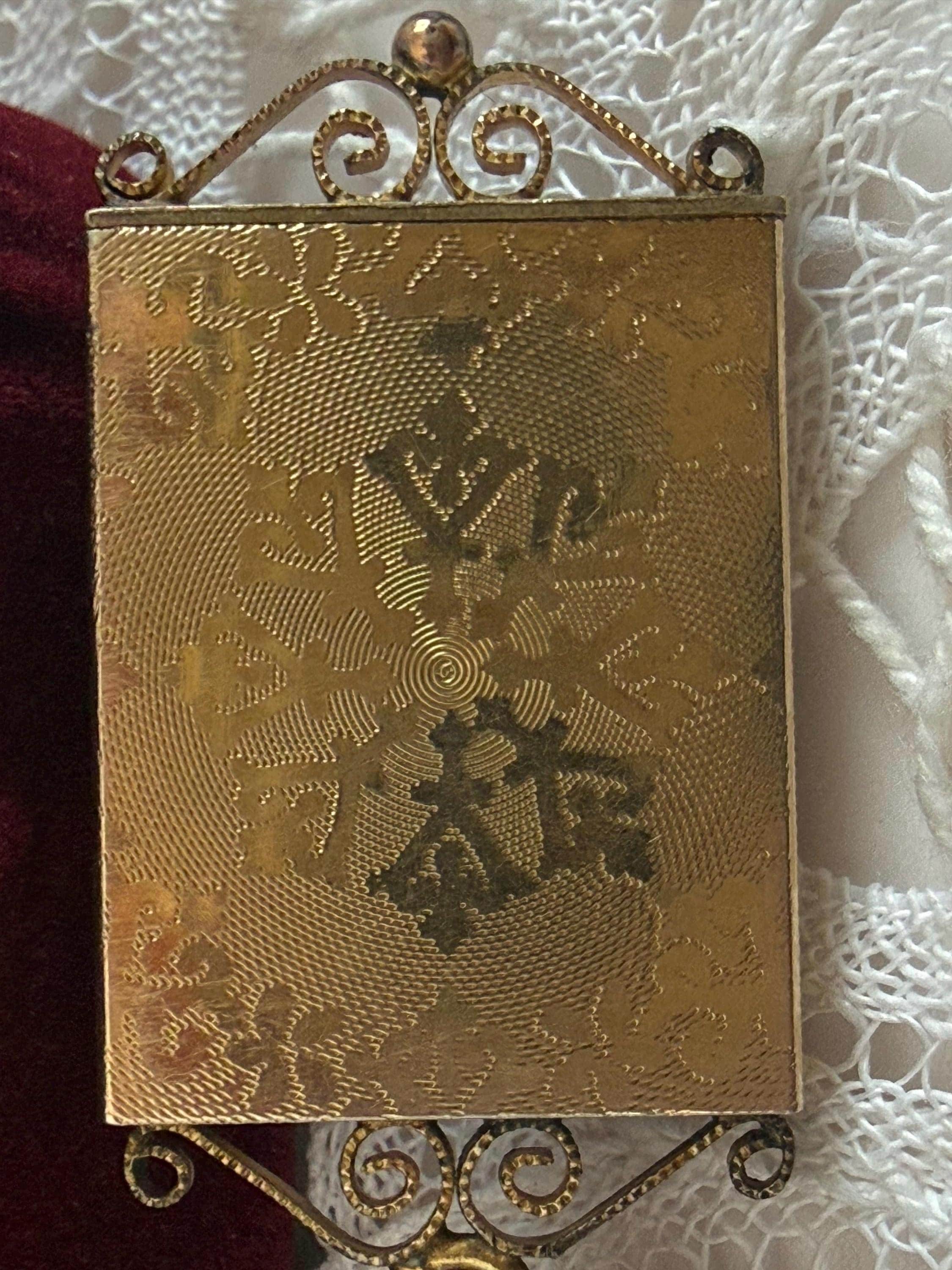This gold filled locket is a La Mode piece. La Mode was a trademark used by Ripley and Gowan of Attleboro, Mass. The company’s history dates back to the 1880s. Ripley and Gowan filed for use of “La Mode” as a trademark in 1924. The company used the trademark for both women’s and men’s jewelry.