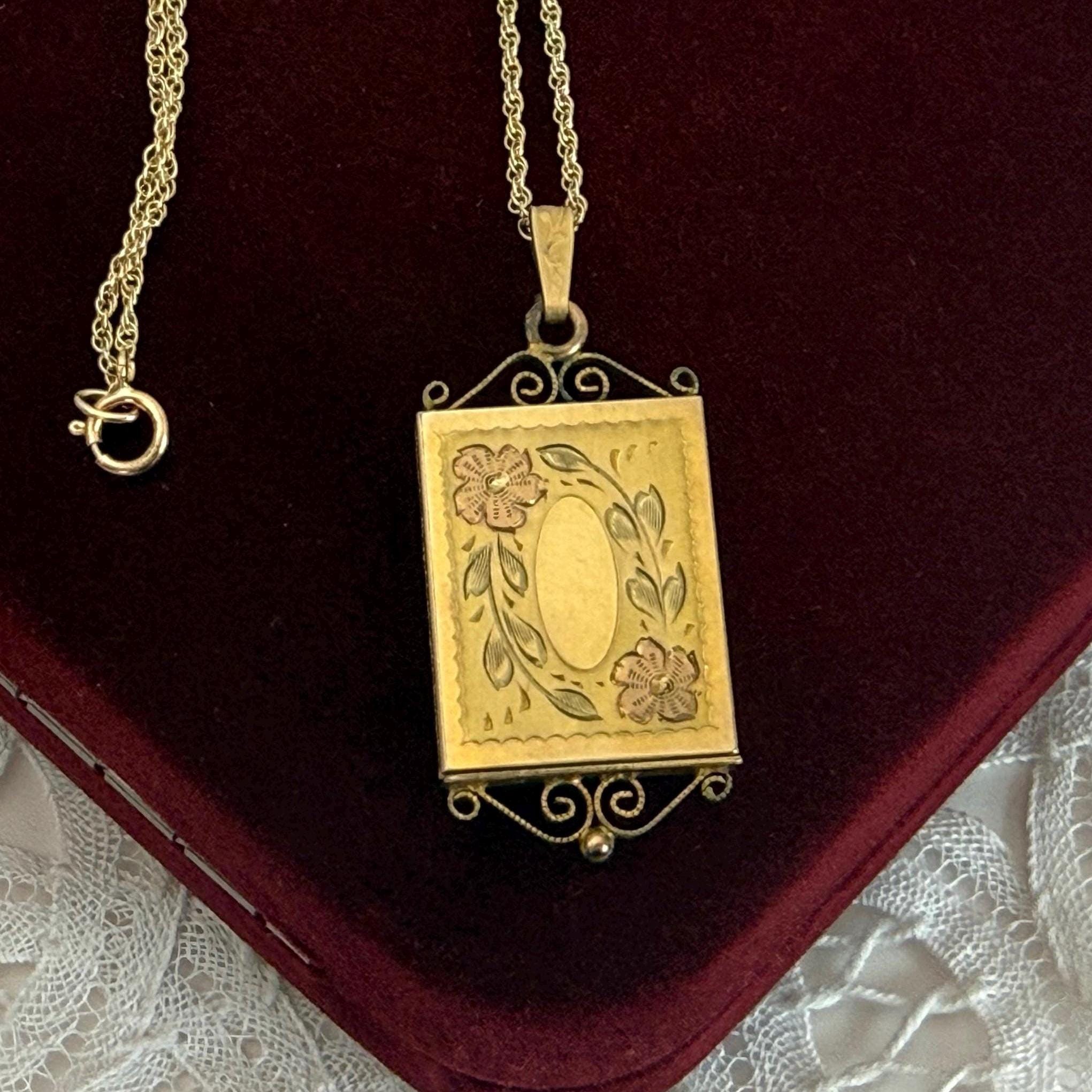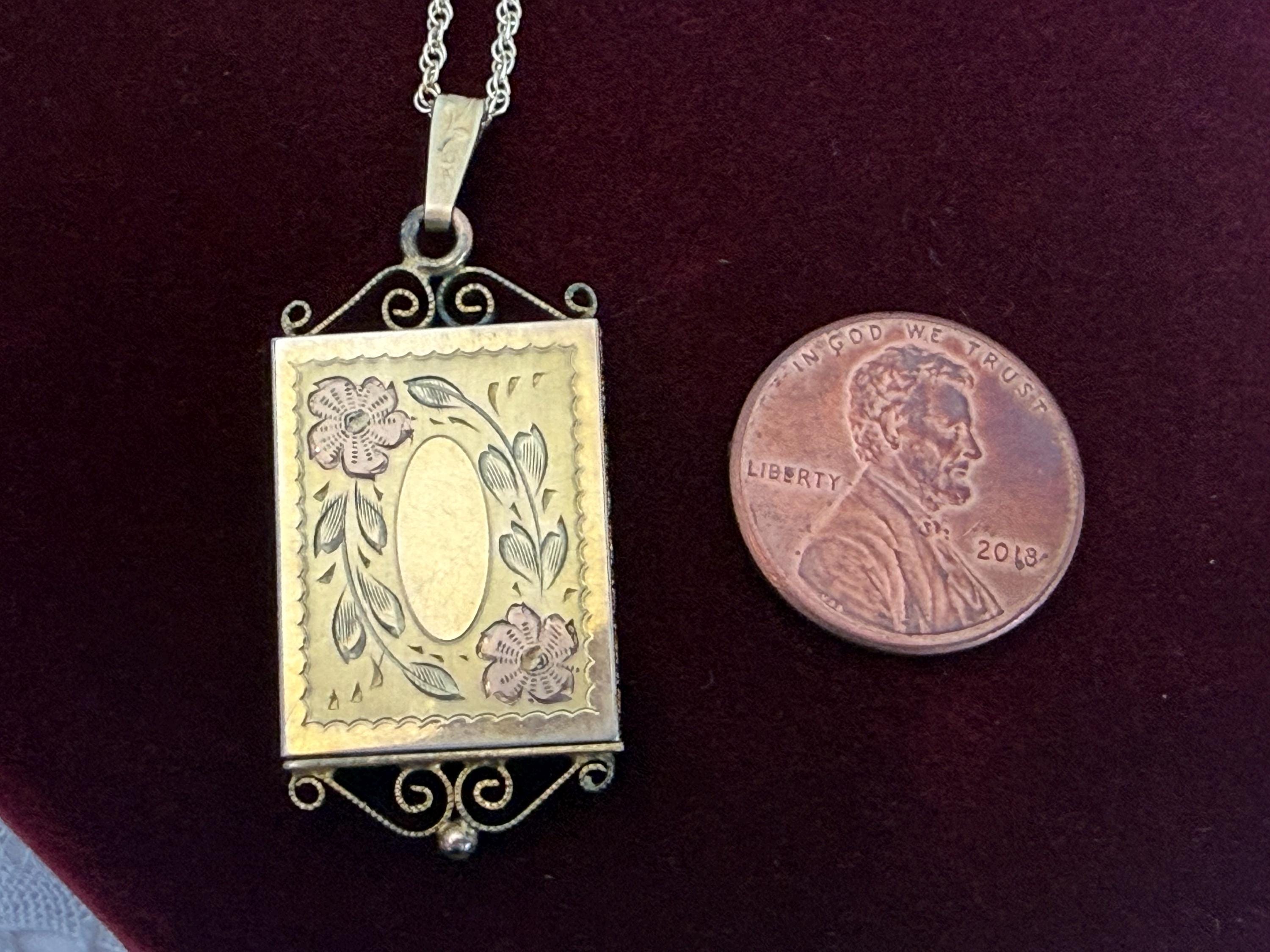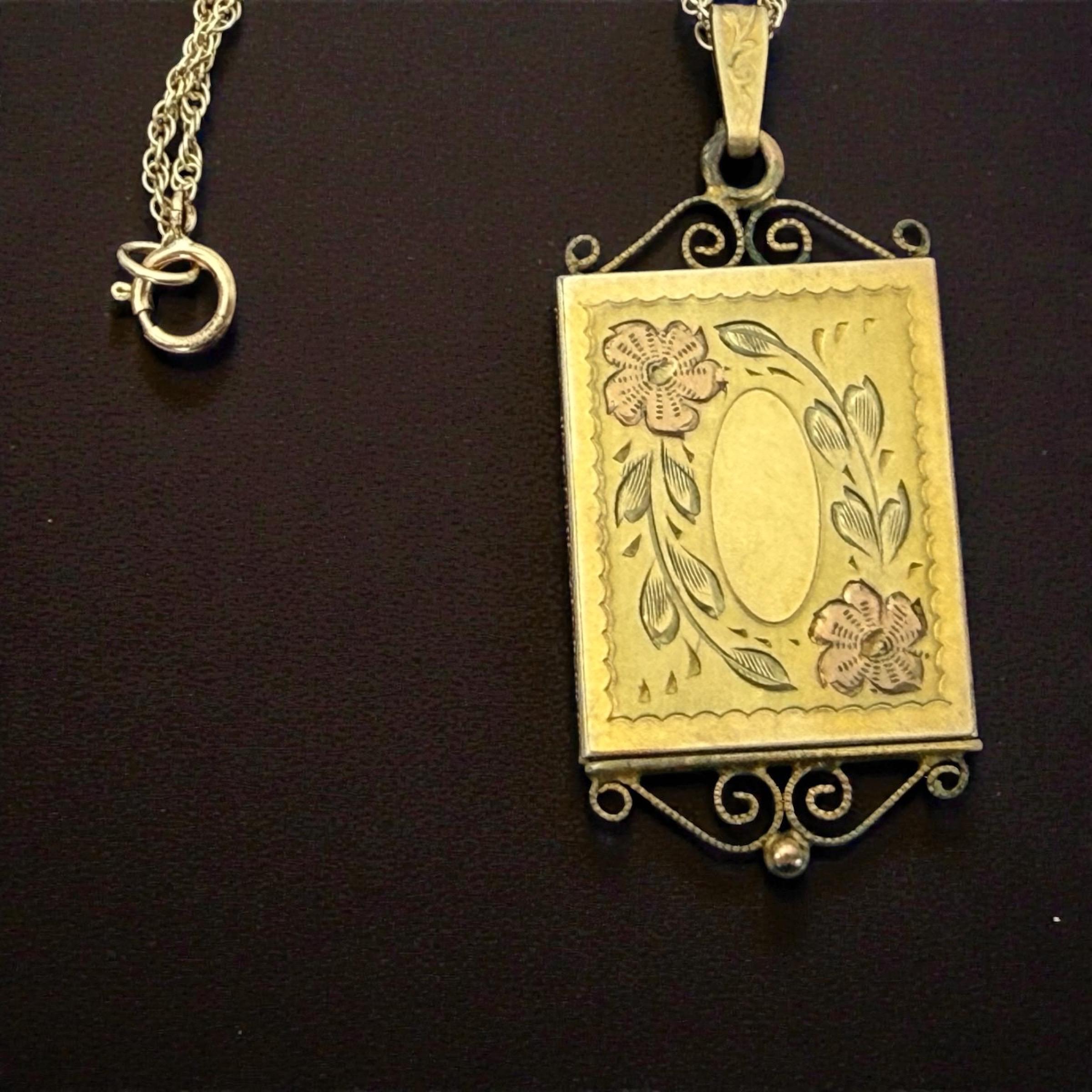 A vintage 12K gold filled rectangular etched locket that hangs from a new 14K gold filled chain. The locket is unique in that it opens from the bottom as a slide window. The front of this rather slender locket has two etched flowers with a pink cast. It hangs on a new 14K gold filled rope chain. The back has a wonderful snowflake design etched on it. The top and bottom have ornate twisted frame designs. You simply pull on the bottom design to slide open the photo window. The frame with a plastic cover inside it is still intact.