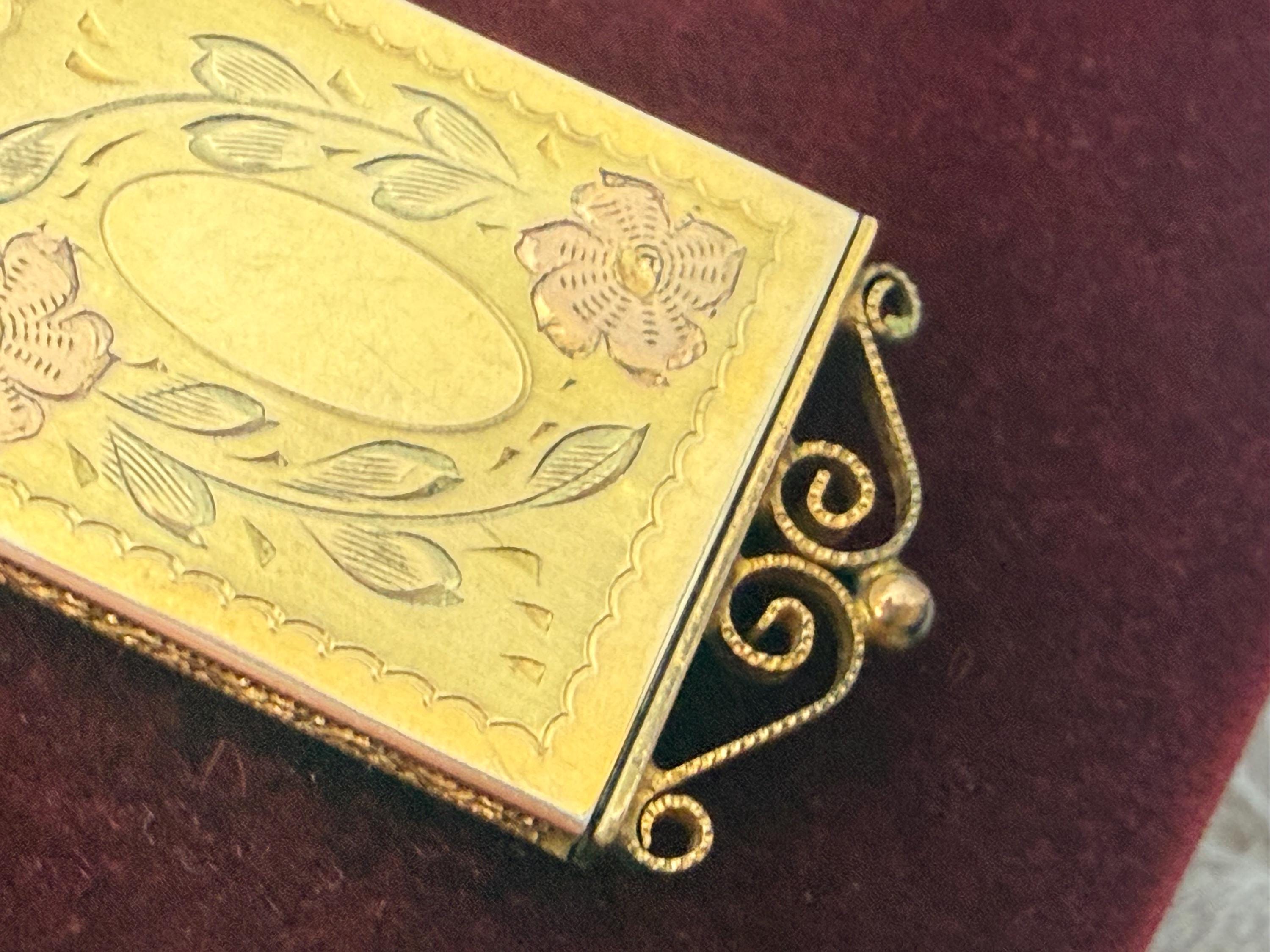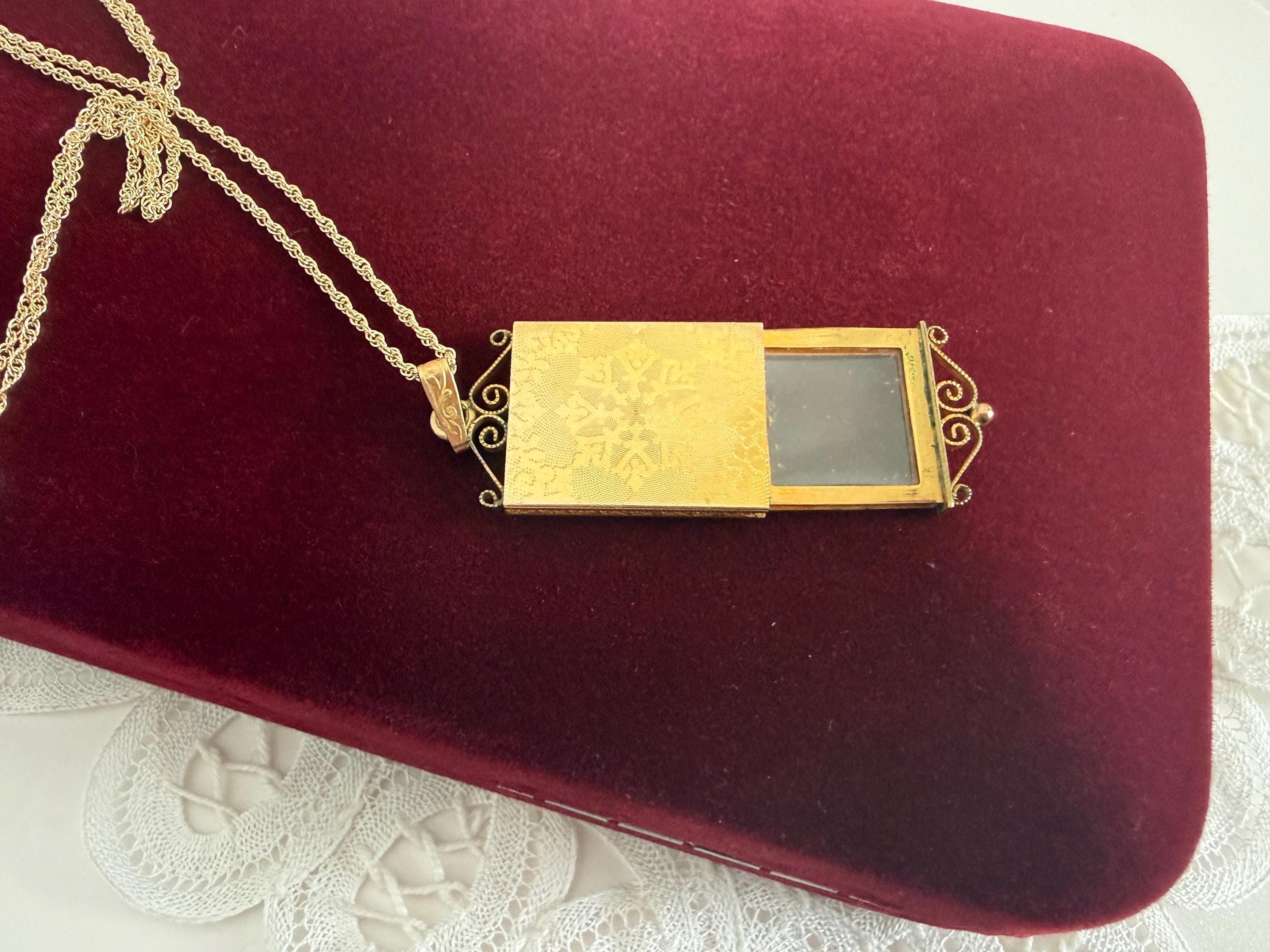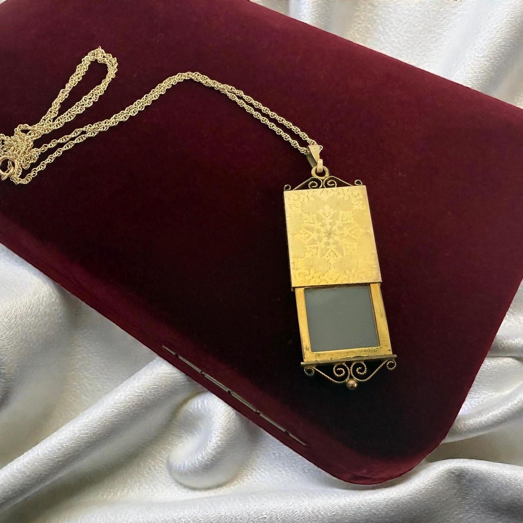 A vintage 12K gold filled rectangular etched locket that hangs from a new 14K gold filled chain. The locket is unique in that it opens from the bottom as a slide window. The front of this rather slender locket has two etched flowers with a pink cast. It hangs on a new 14K gold filled rope chain. The back has a wonderful snowflake design etched on it. The top and bottom have ornate twisted frame designs. You simply pull on the bottom design to slide open the photo window. The frame with a plastic cover inside it is still intact.