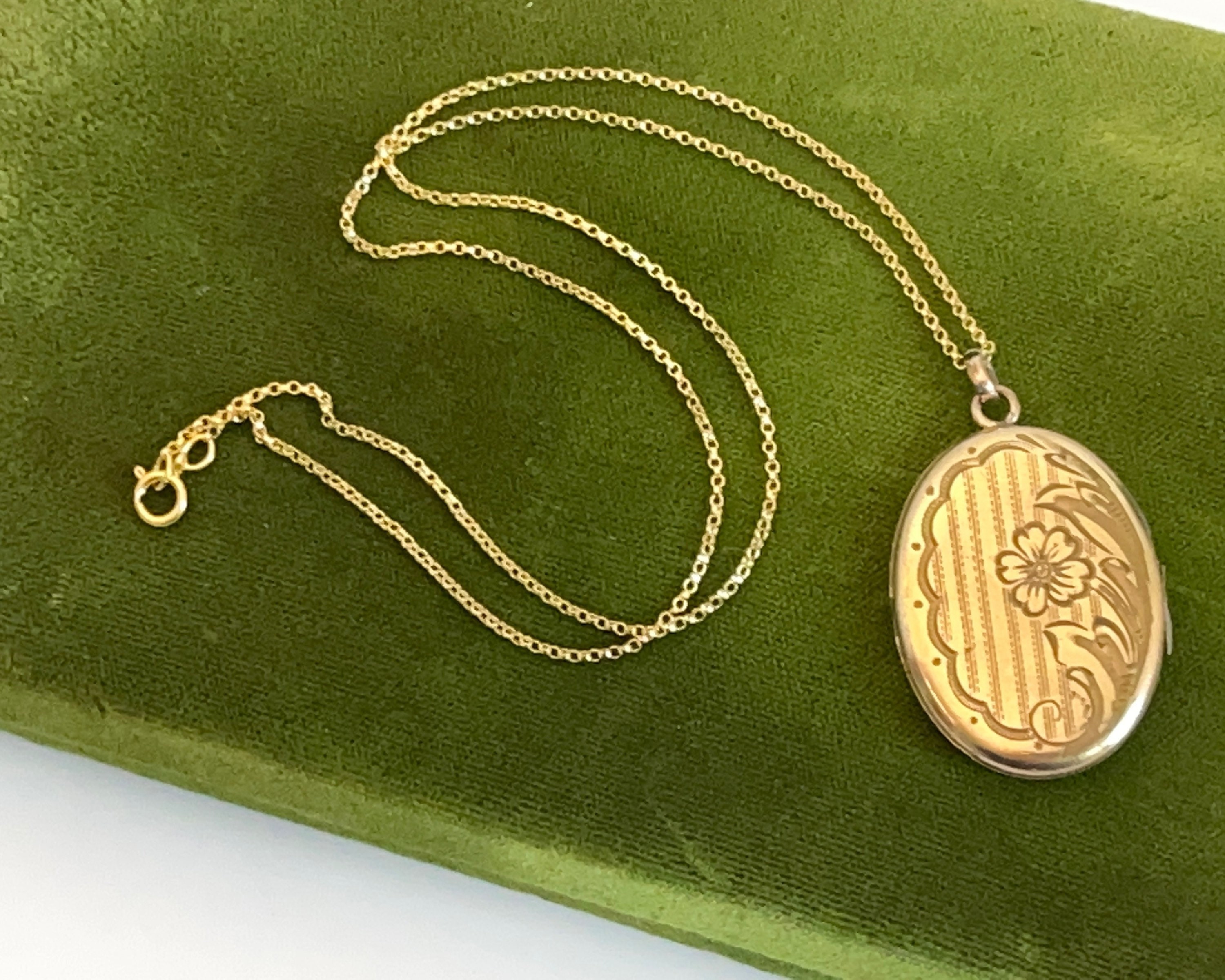 Vintage Etched Floral Locket: Gold Plated Photo Pendant Necklace