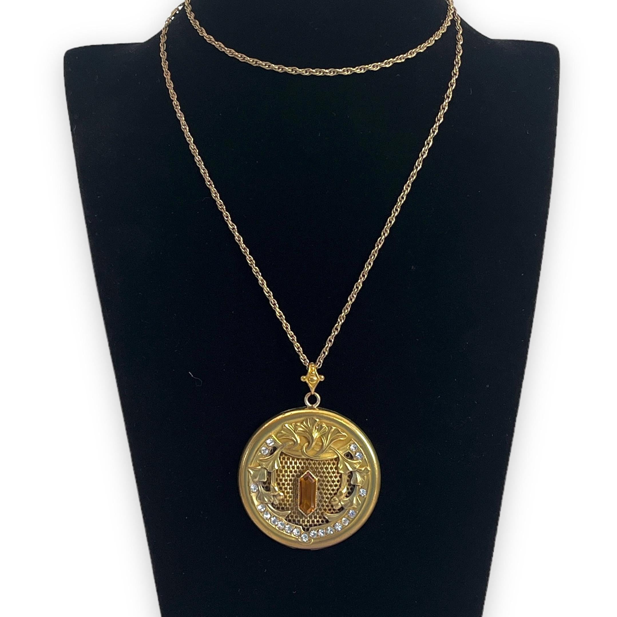 The front of this locket features a central raised light brown faceted glass simulated gemstone in an elongated six-sided shape surrounded by a total of 19 clear round faceted “paste” stones. The clear glass gems are on the top, sides, and at the bottom of the locket front. There is open mesh work all around the large light brown paste stone - the mesh is in a shield shape. There are graceful raised flowers (lilies) and swirls that flow all around the outer edge of the locket and nicely frame the ornate front.