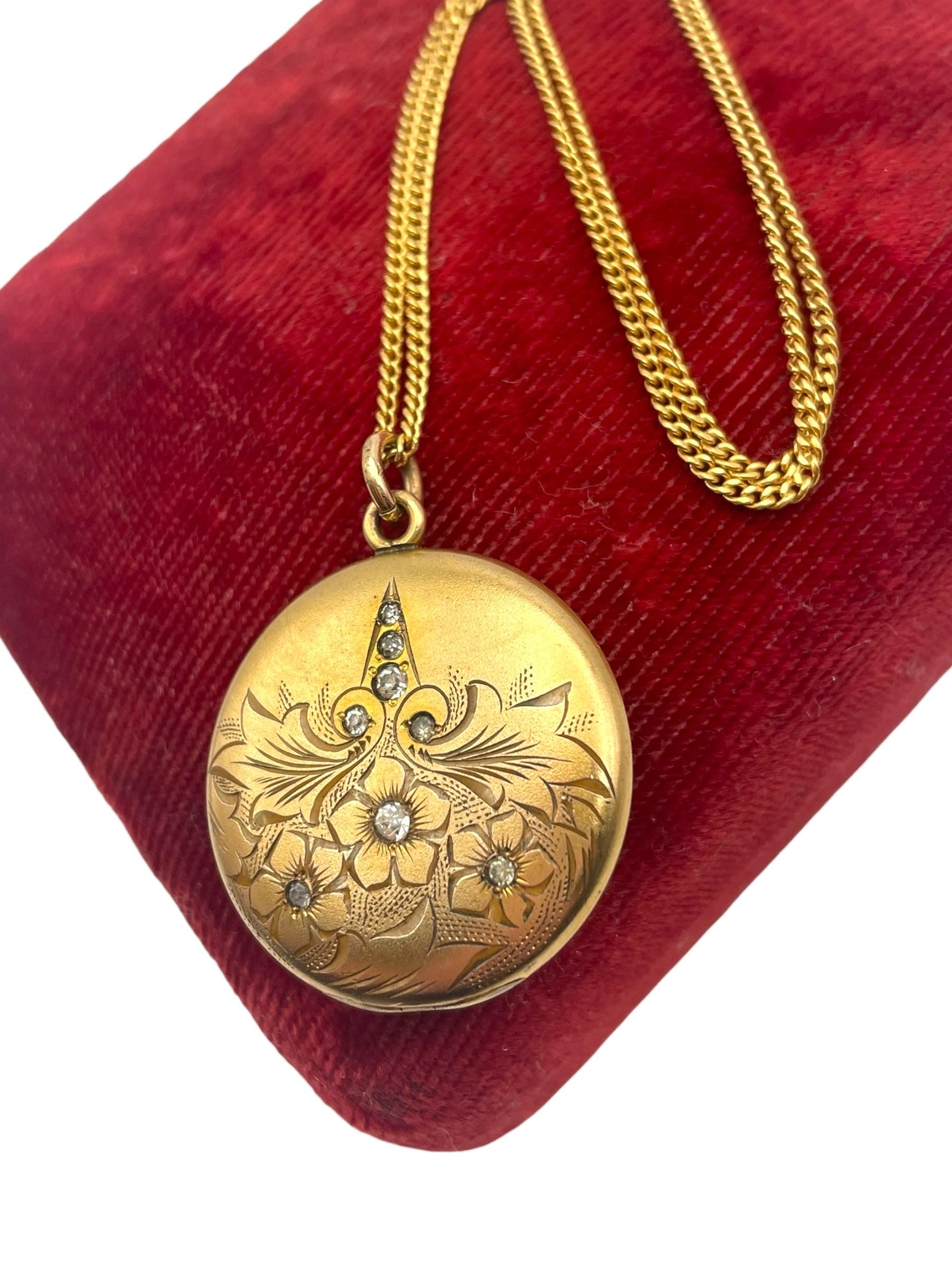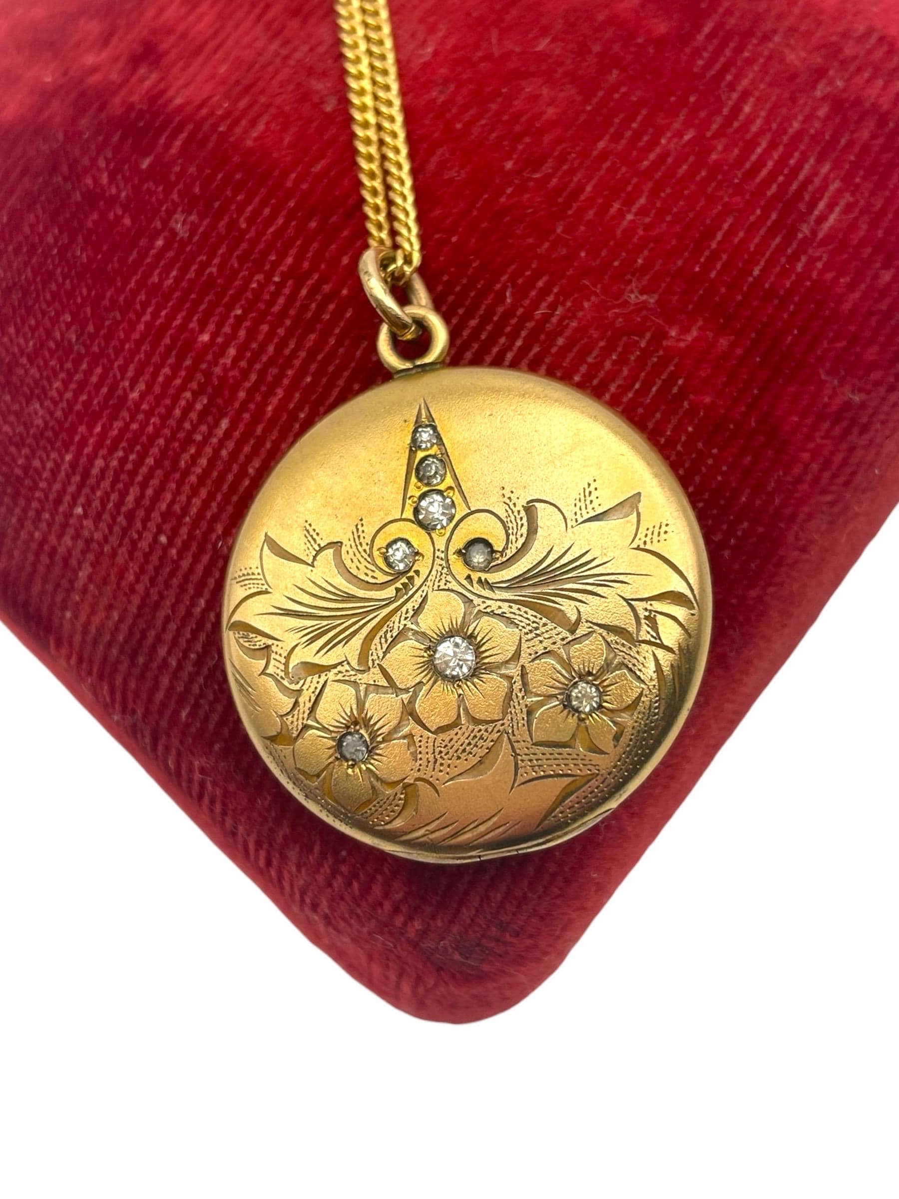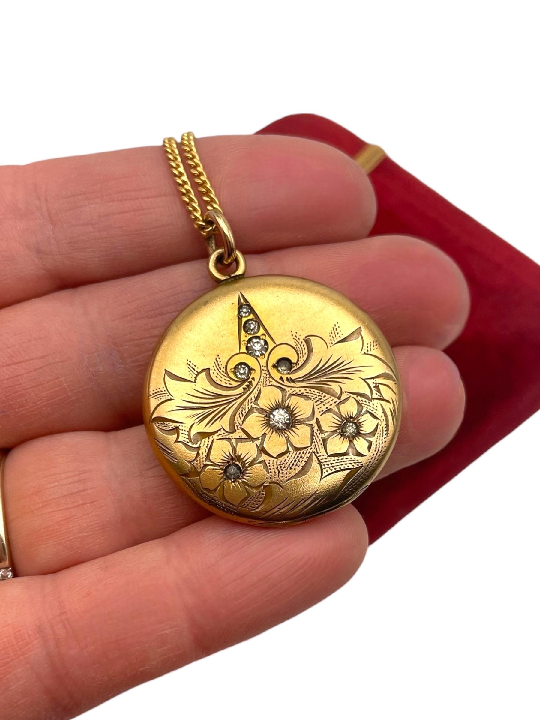 Lovely antique Art Nouveau gold filled round photo locket on a 12K gold filled chain. Beautiful and ornate, this locket was from the early 1900s. The locket front features a matte finish with an etched floral design swirling across it. There are decorative paste stones throughout - 8 in total, ranging in size.