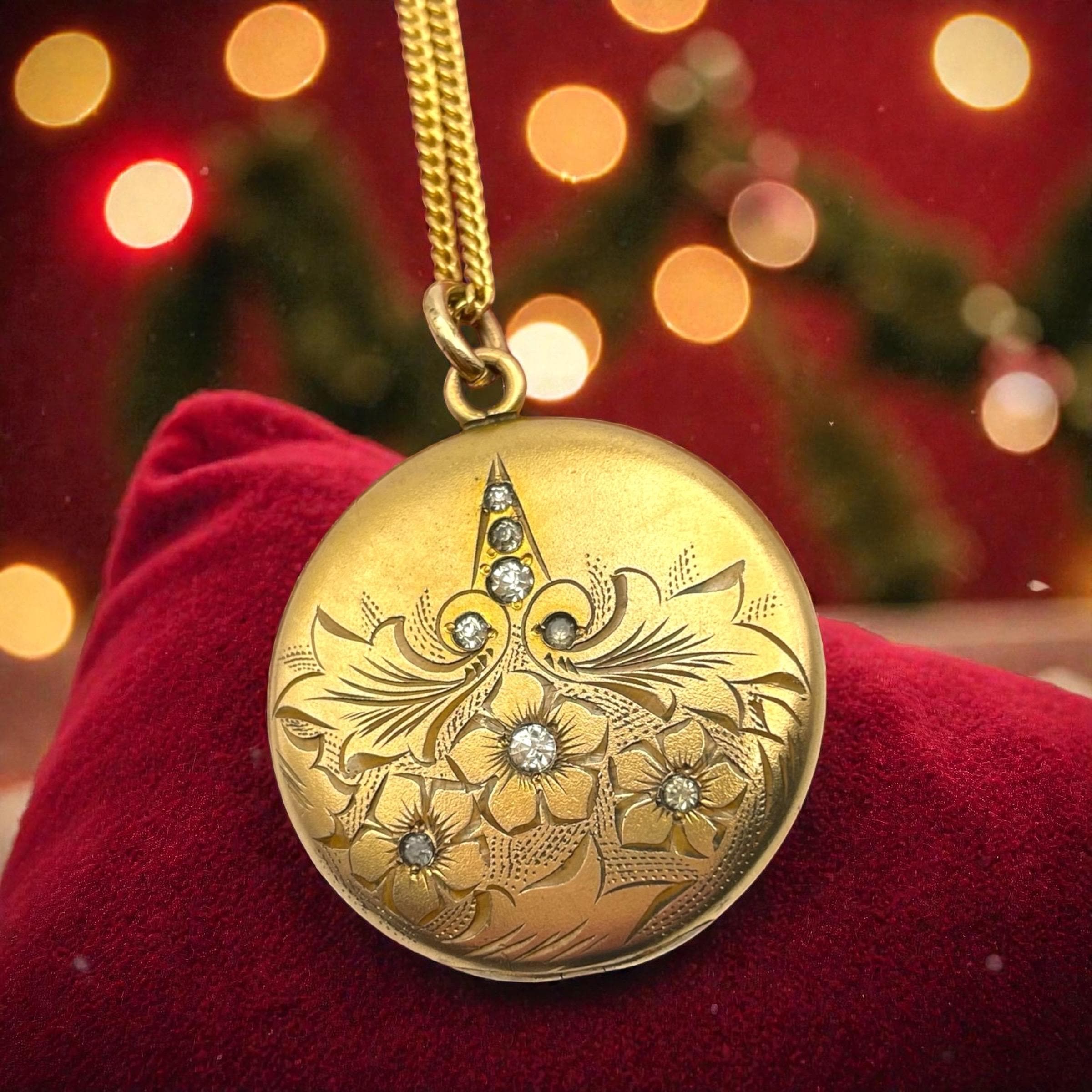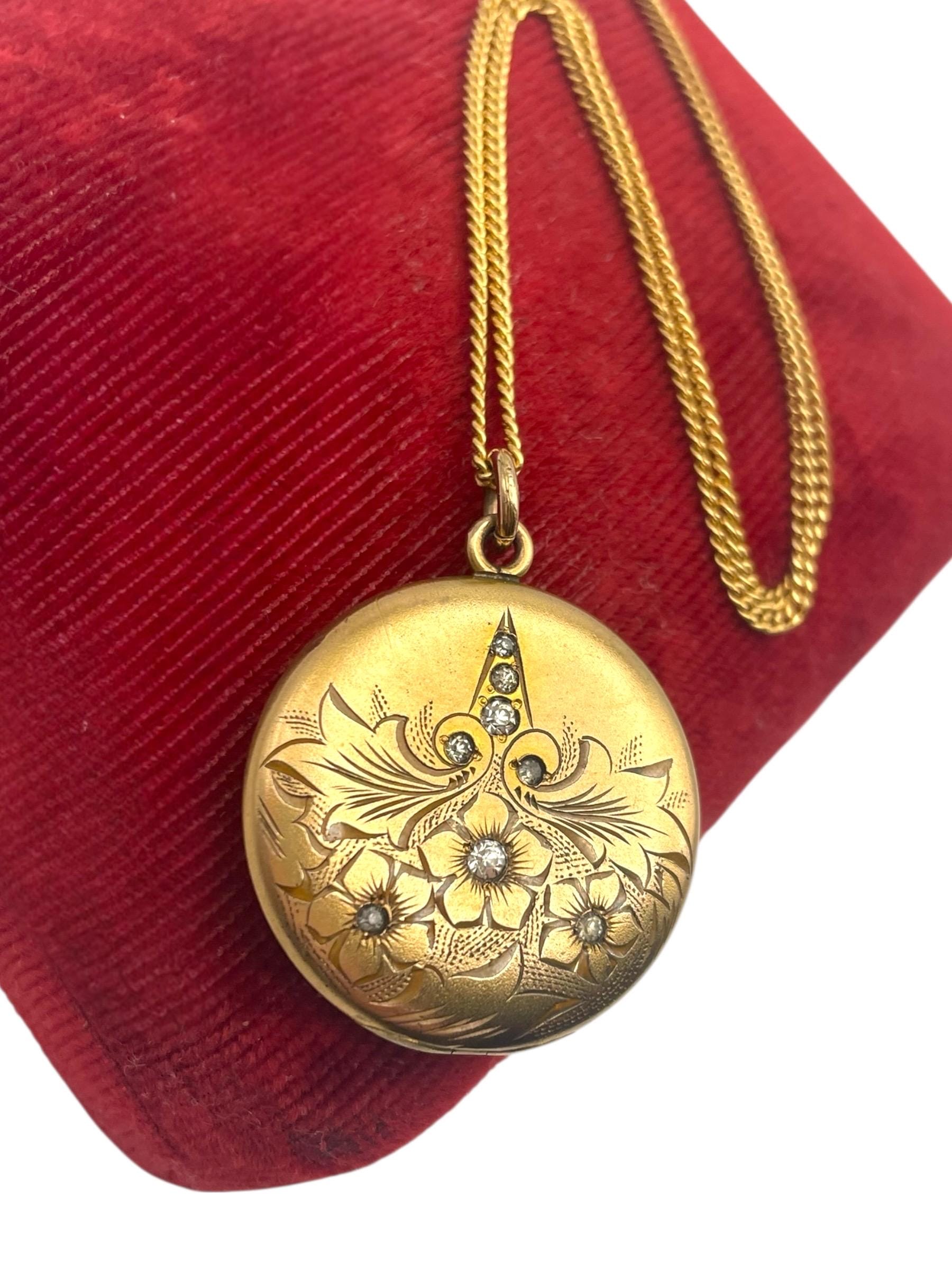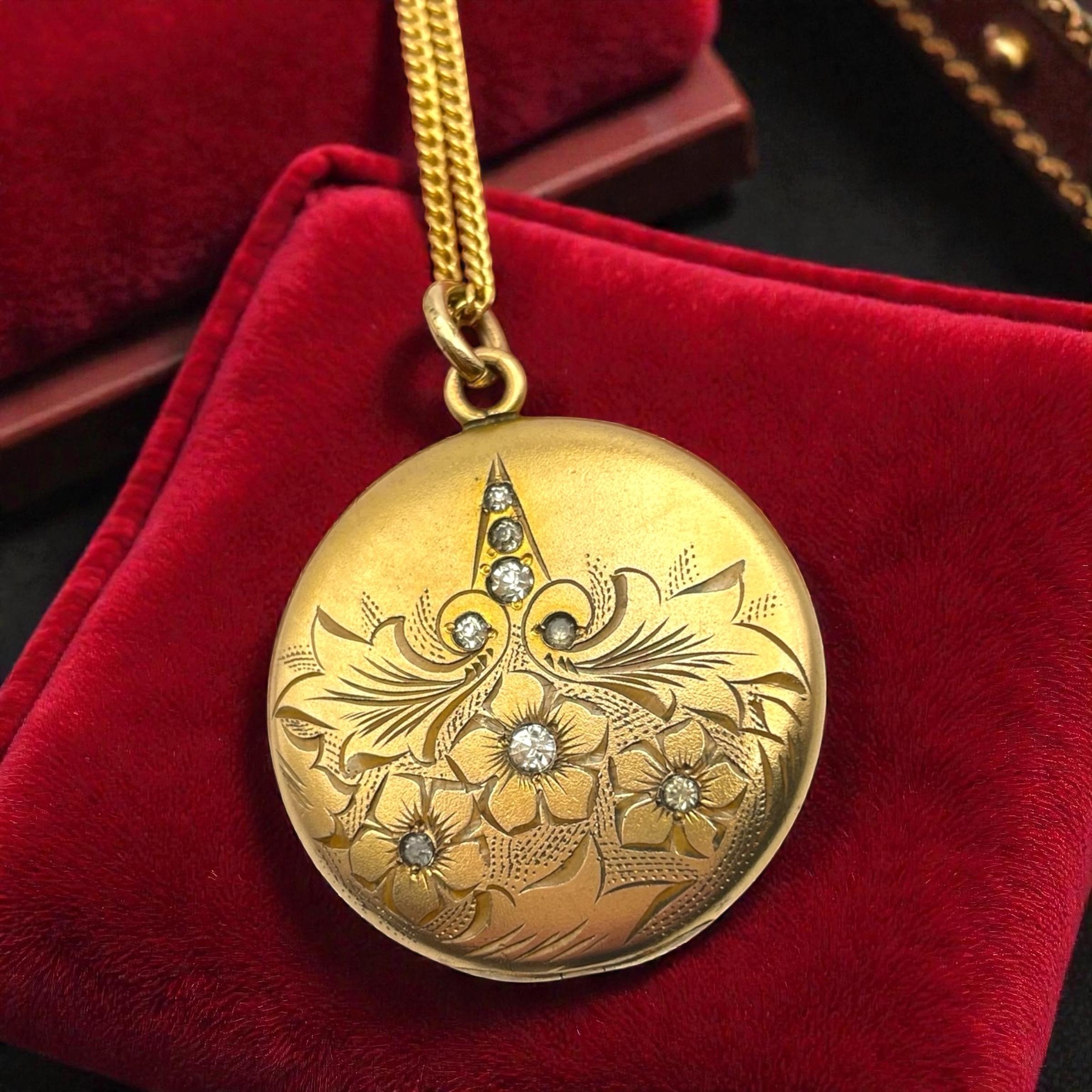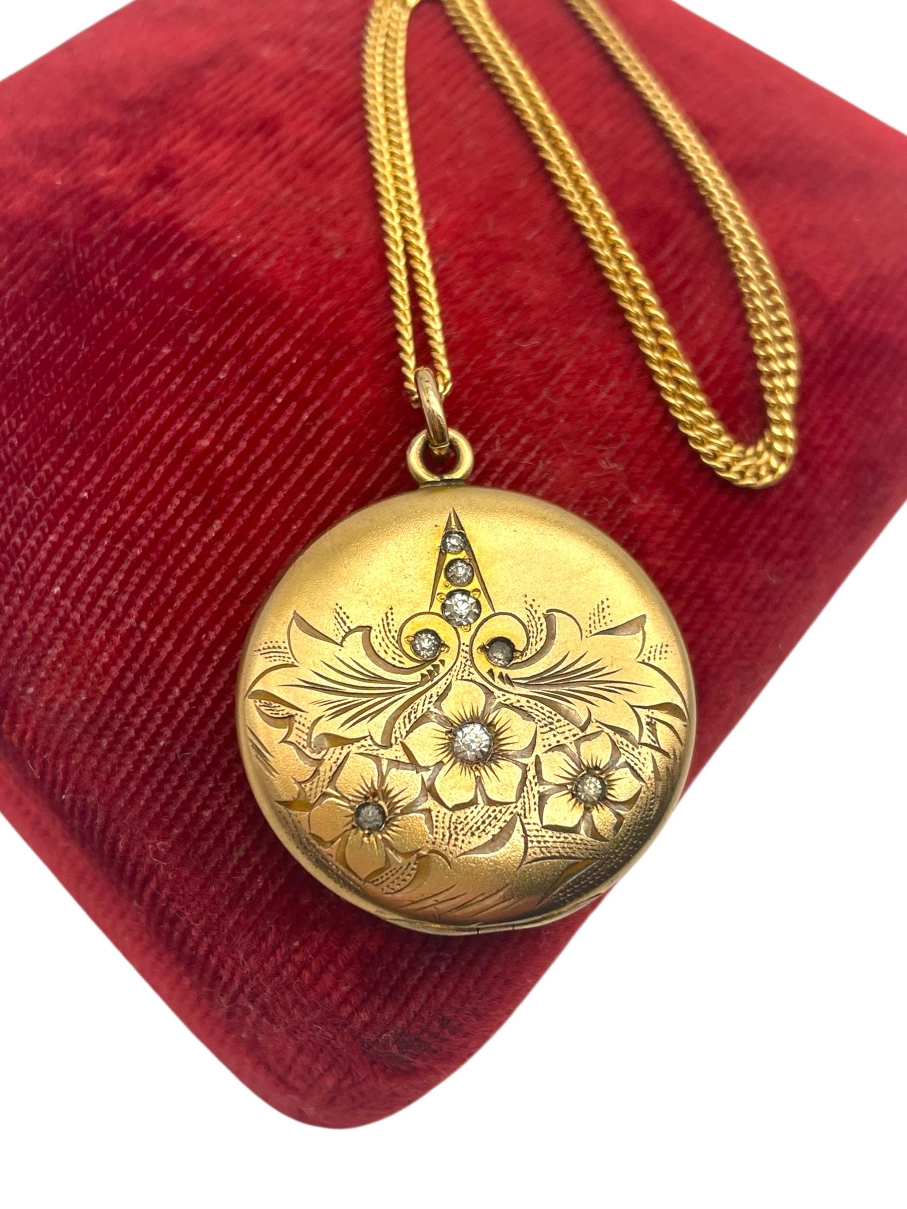 Lovely antique Art Nouveau gold filled round photo locket on a 12K gold filled chain. Beautiful and ornate, this locket was from the early 1900s. The locket front features a matte finish with an etched floral design swirling across it. There are decorative paste stones throughout - 8 in total, ranging in size.