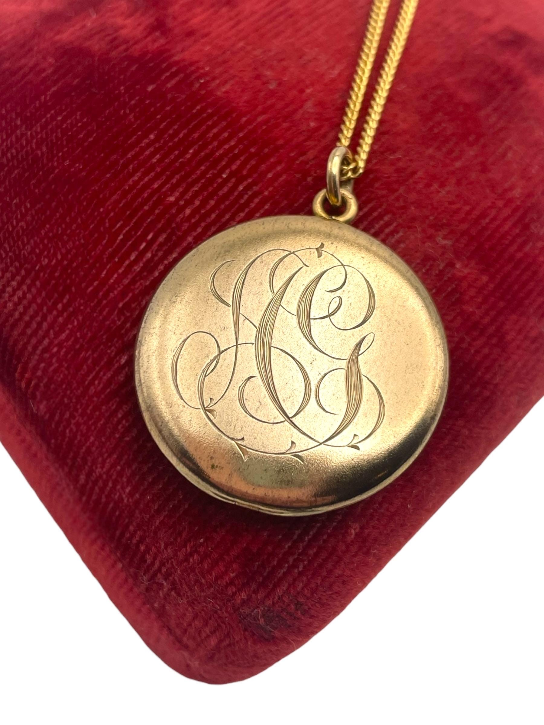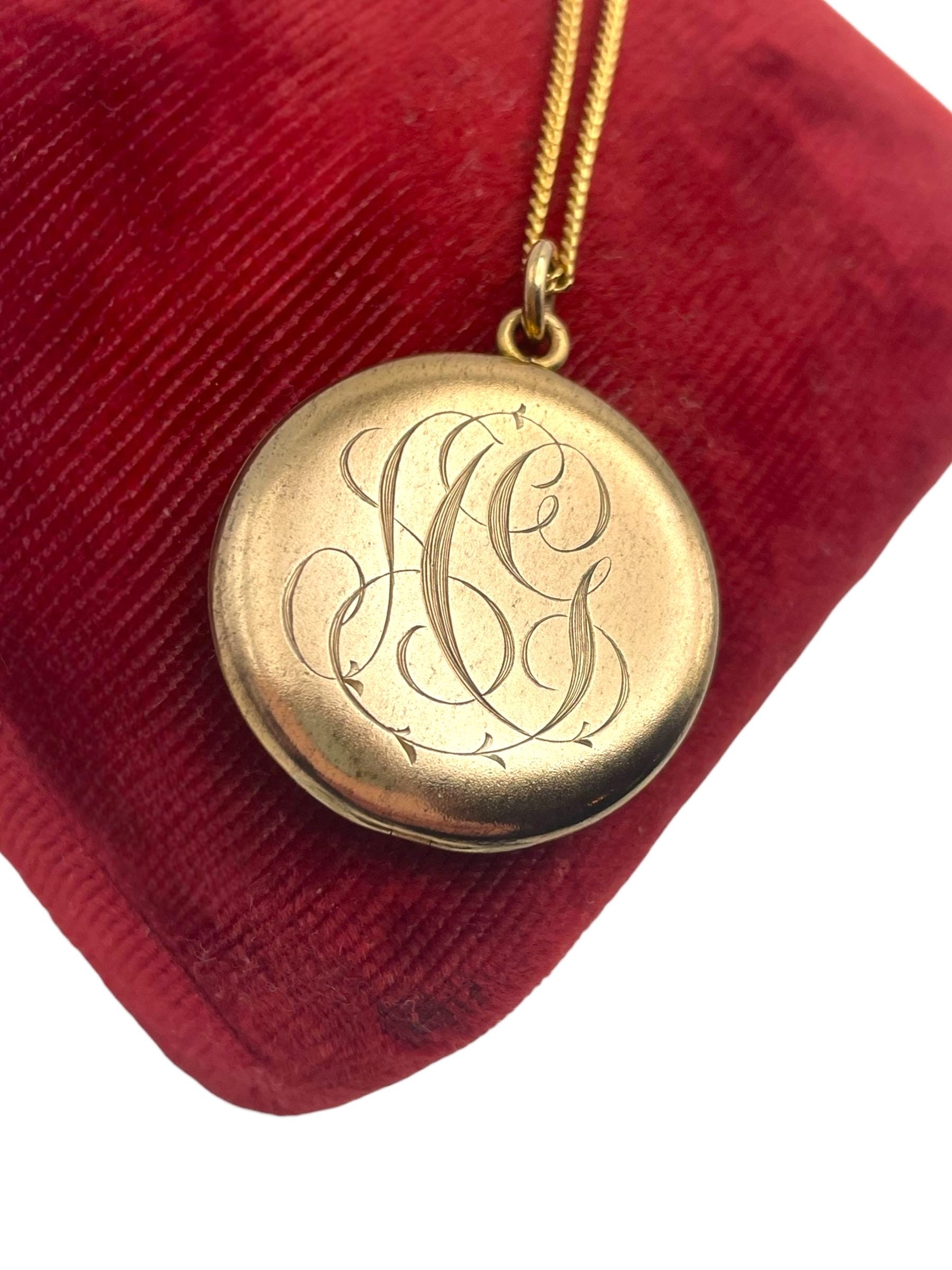 The antique locket no longer has the inner frames intact. It closes with a snap (and very securely). This antique round locket hangs from a new old stock 24” long 12K gold filled oval link chain.