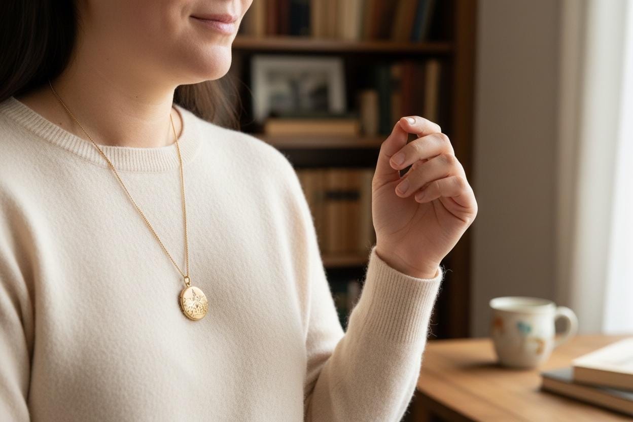 The locket hangs from a long and heavy 12K gold filled chain. The spring ring clasp on the link chain opens and closes securely.