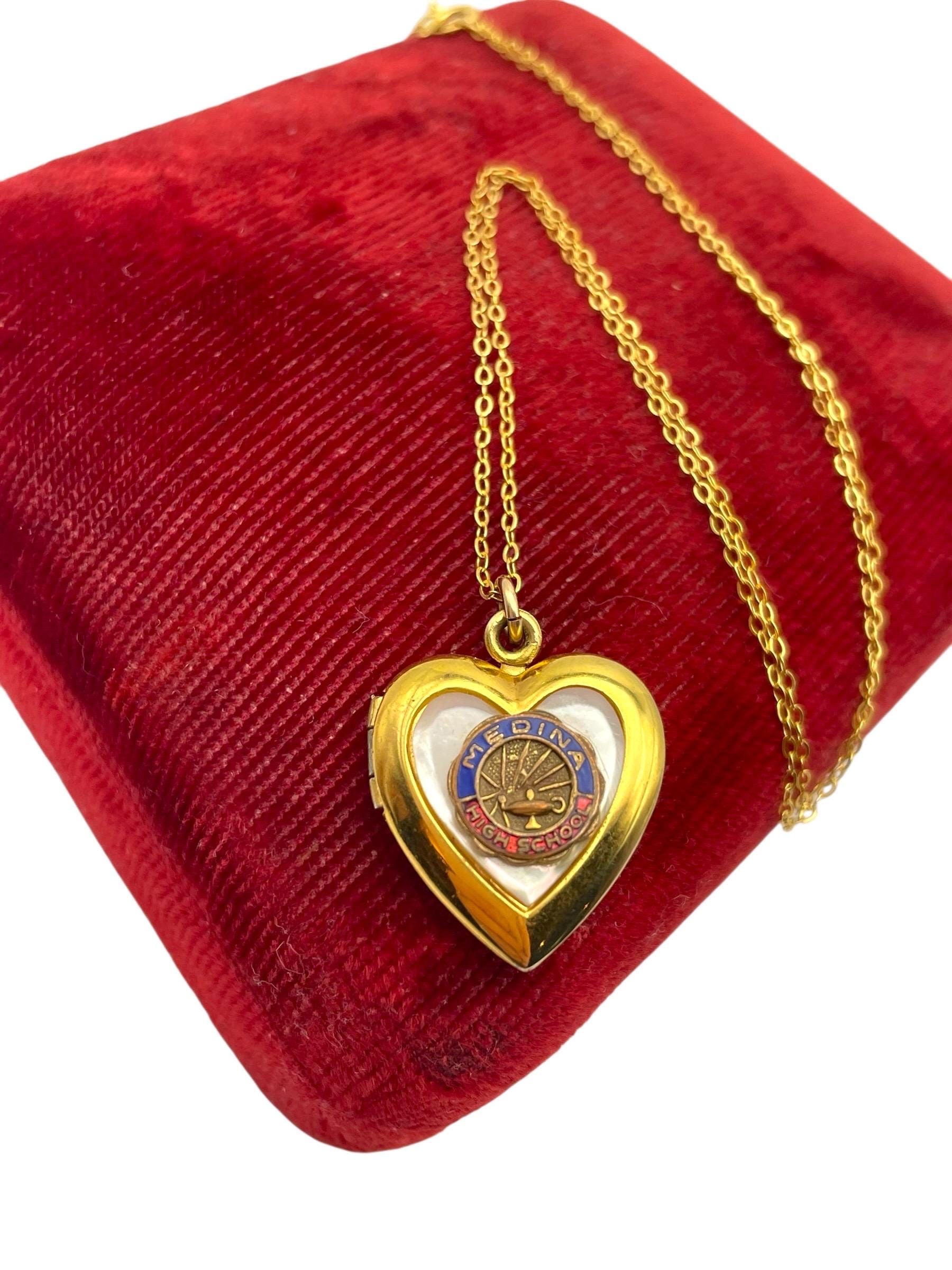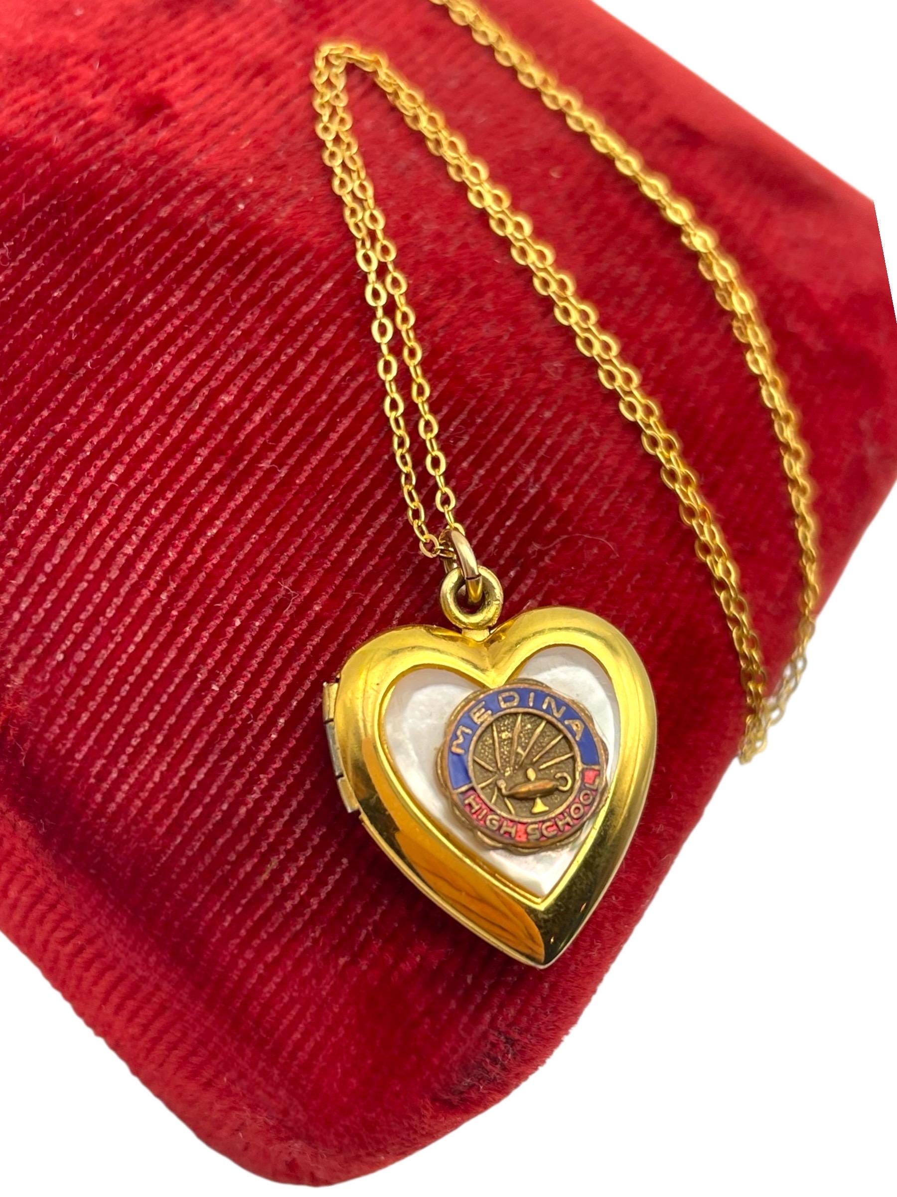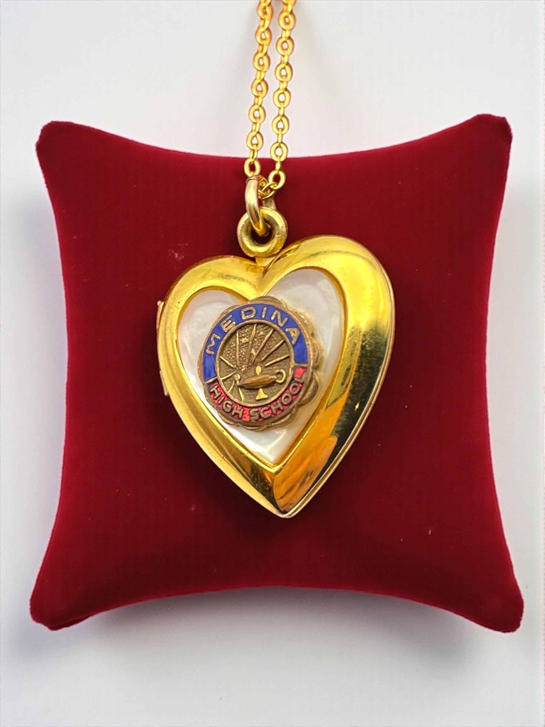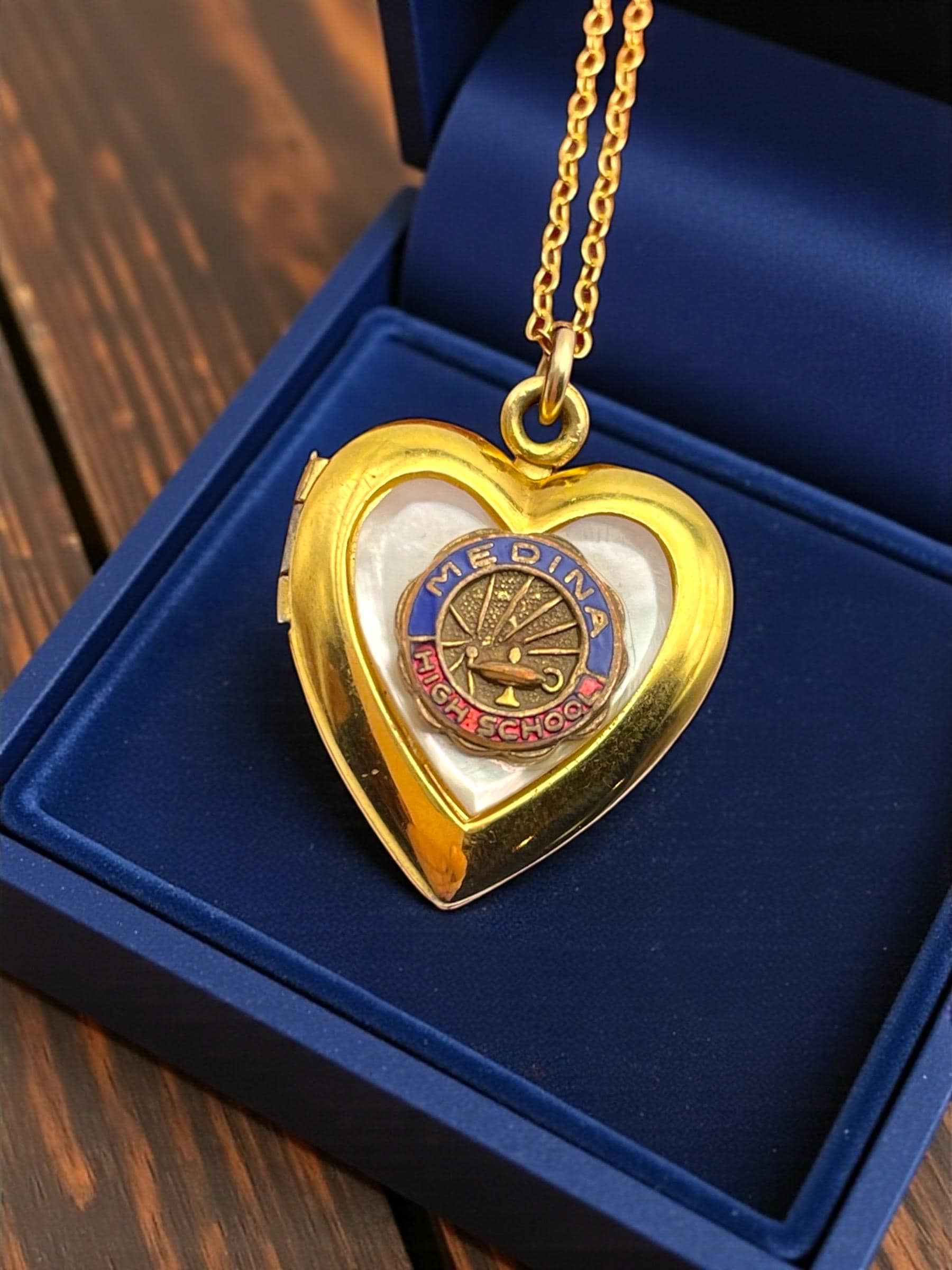 A classic vintage gold filled heart shaped locket necklace with a mother of pearl background that features a raised insignia from Medina High School.