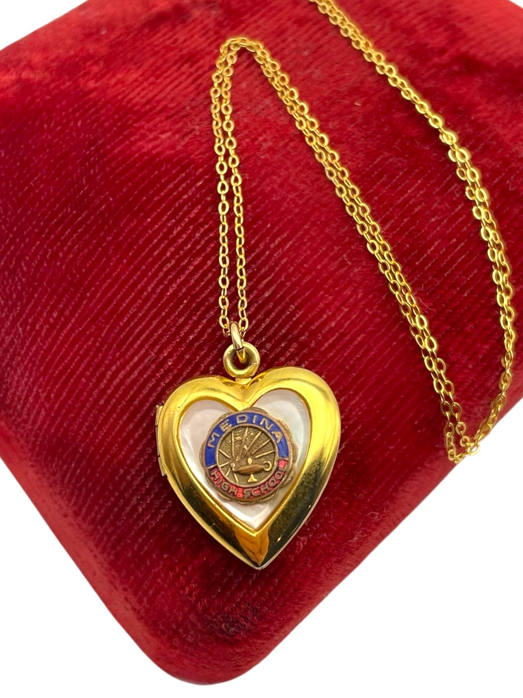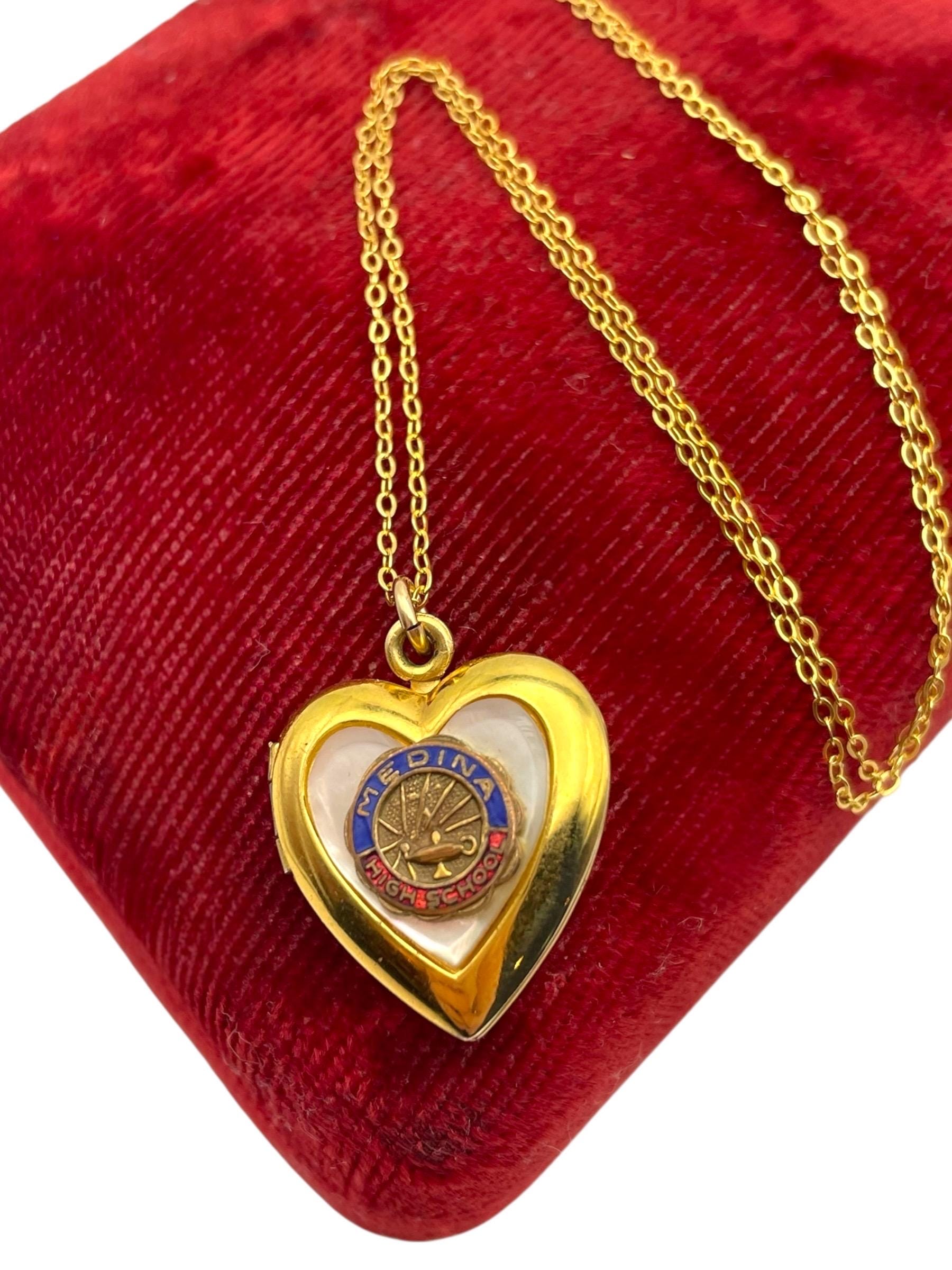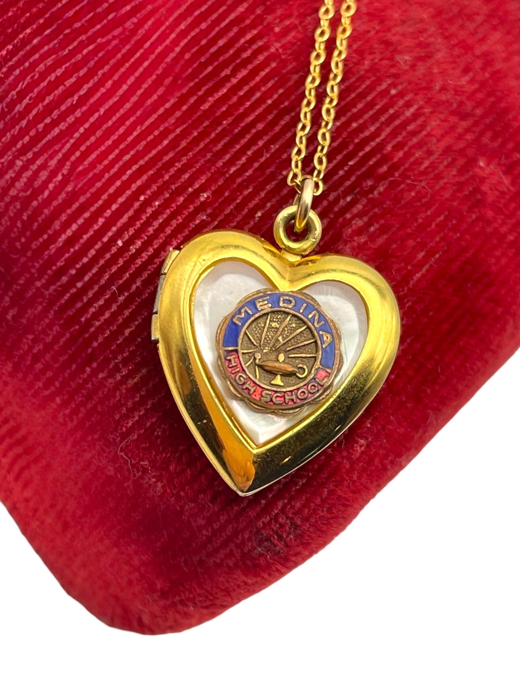 Vintage Gold Filled Heart Locket Necklace: Mother of Pearl Medina High School '40