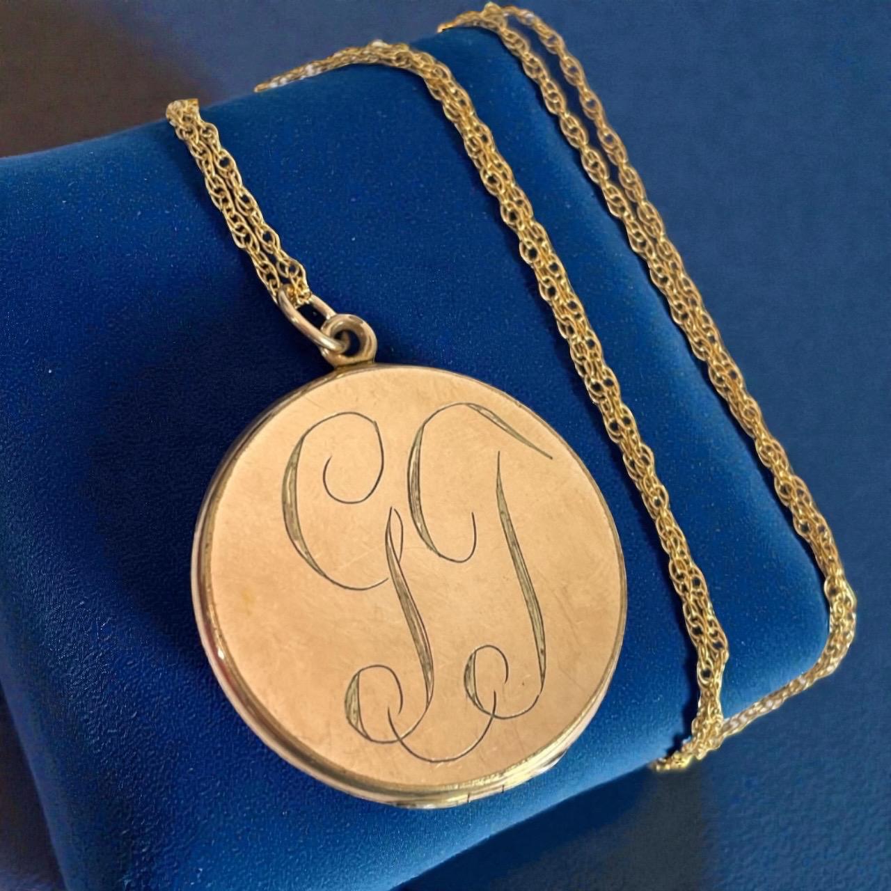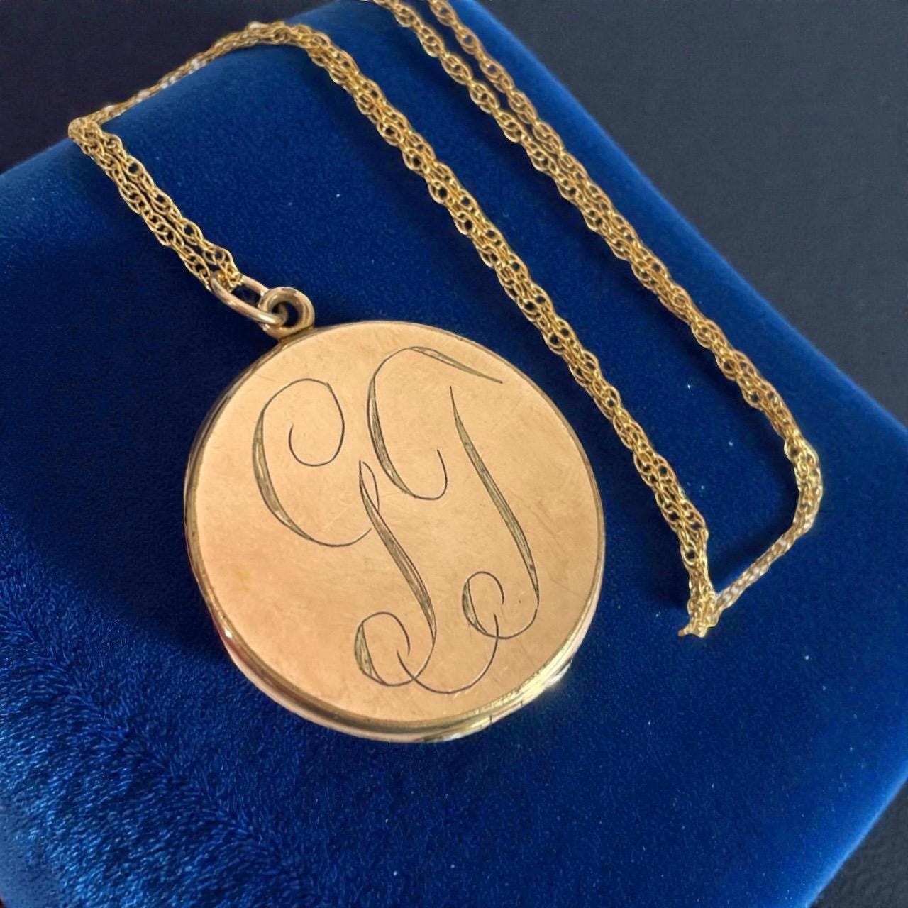The front of this vintage locket features the initials "GT" in a cursive old font. The other side, the back, is plain.