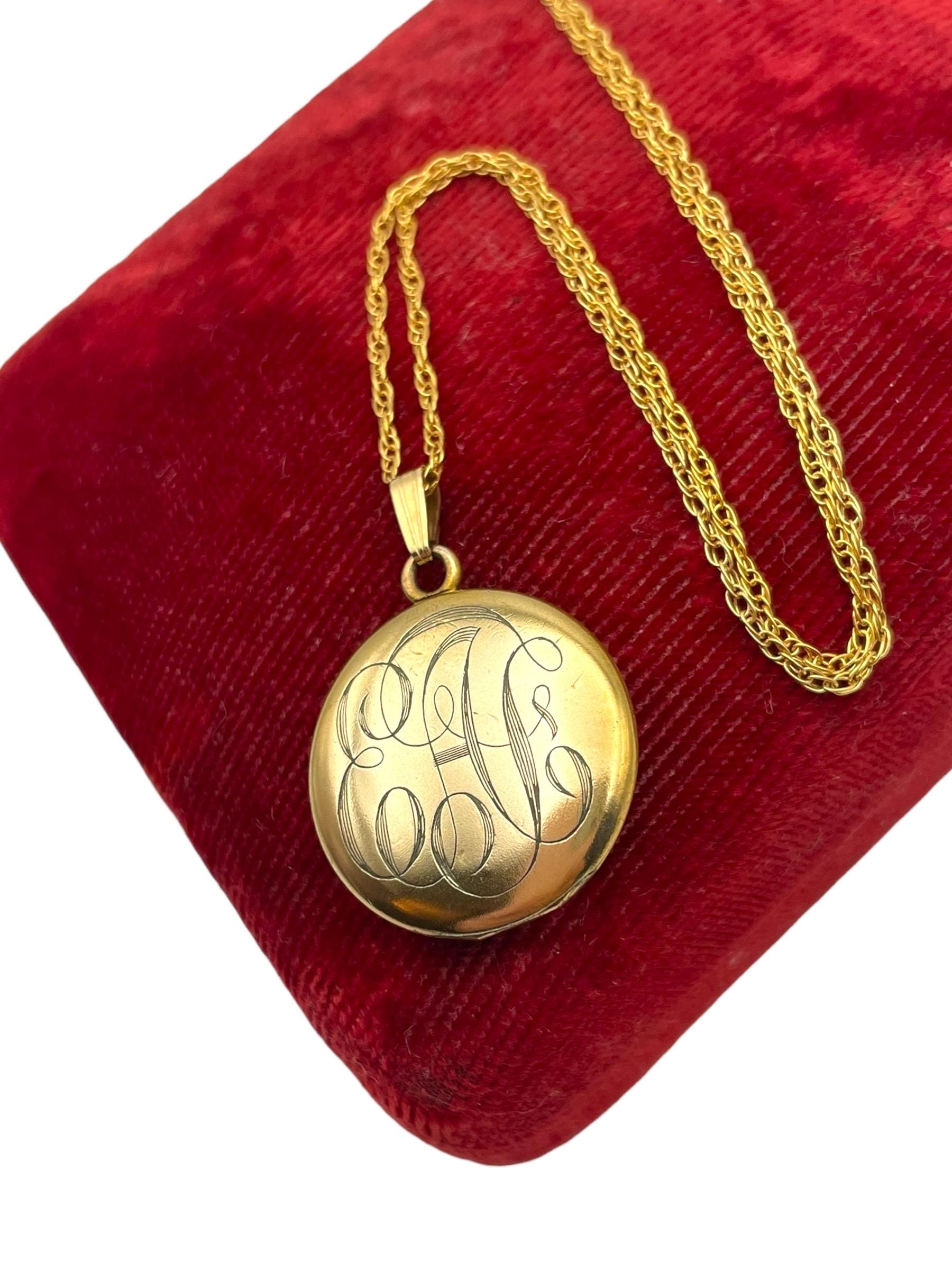 This antique round locket hangs from a new 20" long 14K gold filled rope chain.