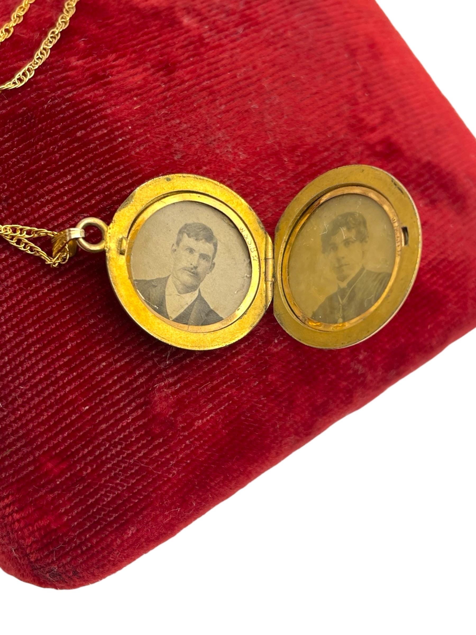 Inside the locket there are two places for photos and both have the original frames and one has a clear covers intact. Currently there are old photos inside. They appear to be the original photos - both black and white. One of a man and the other a woman.