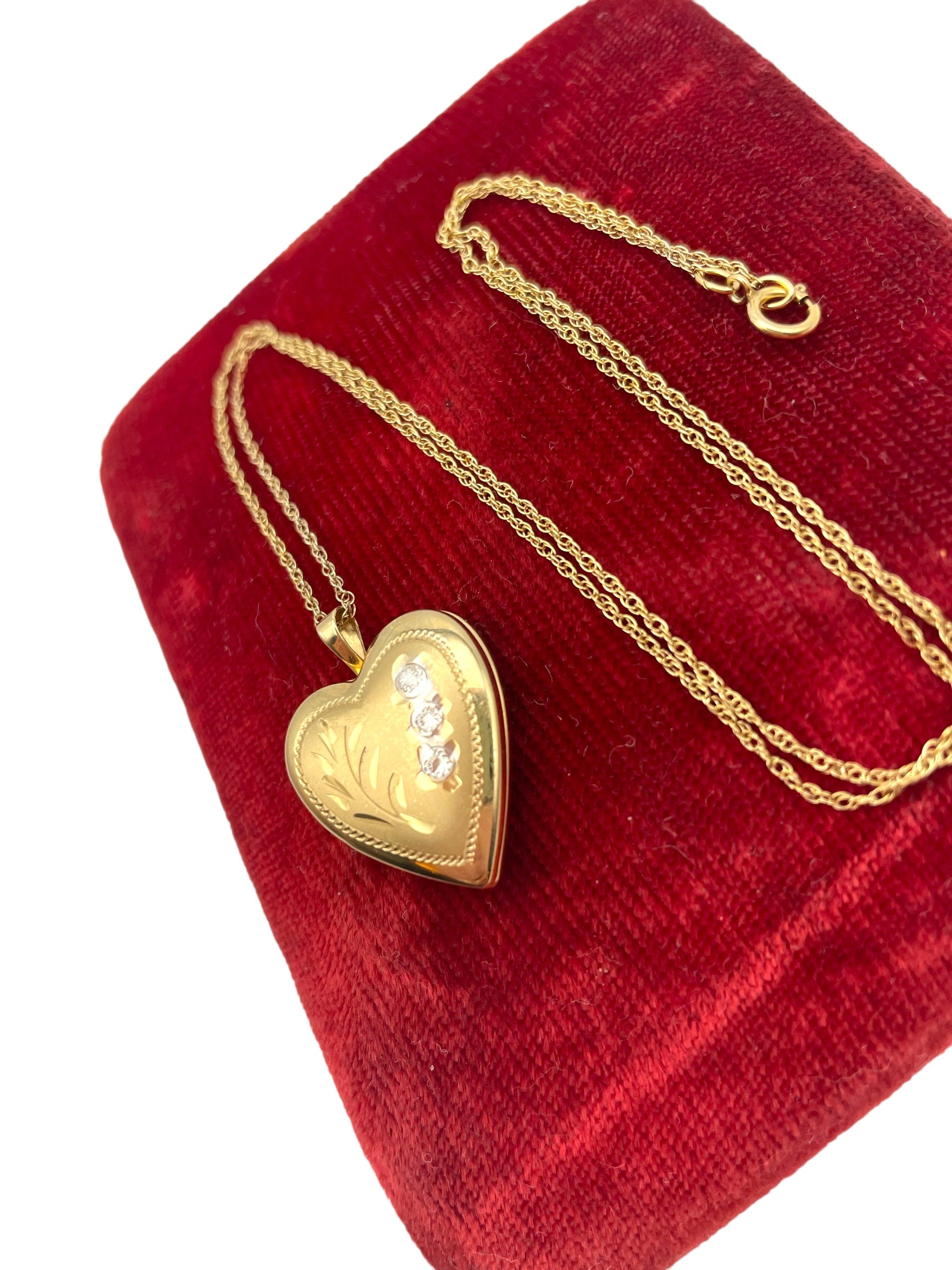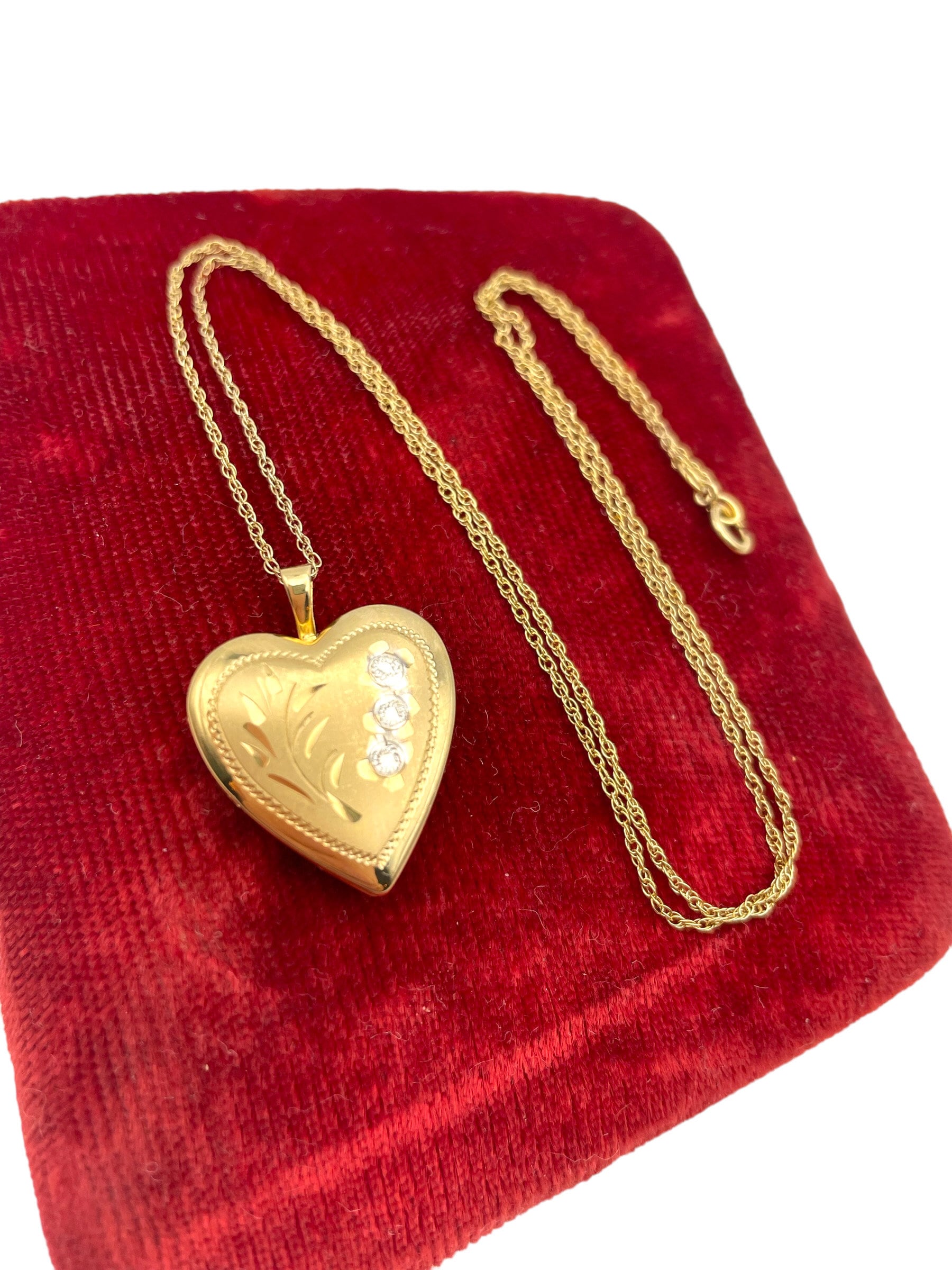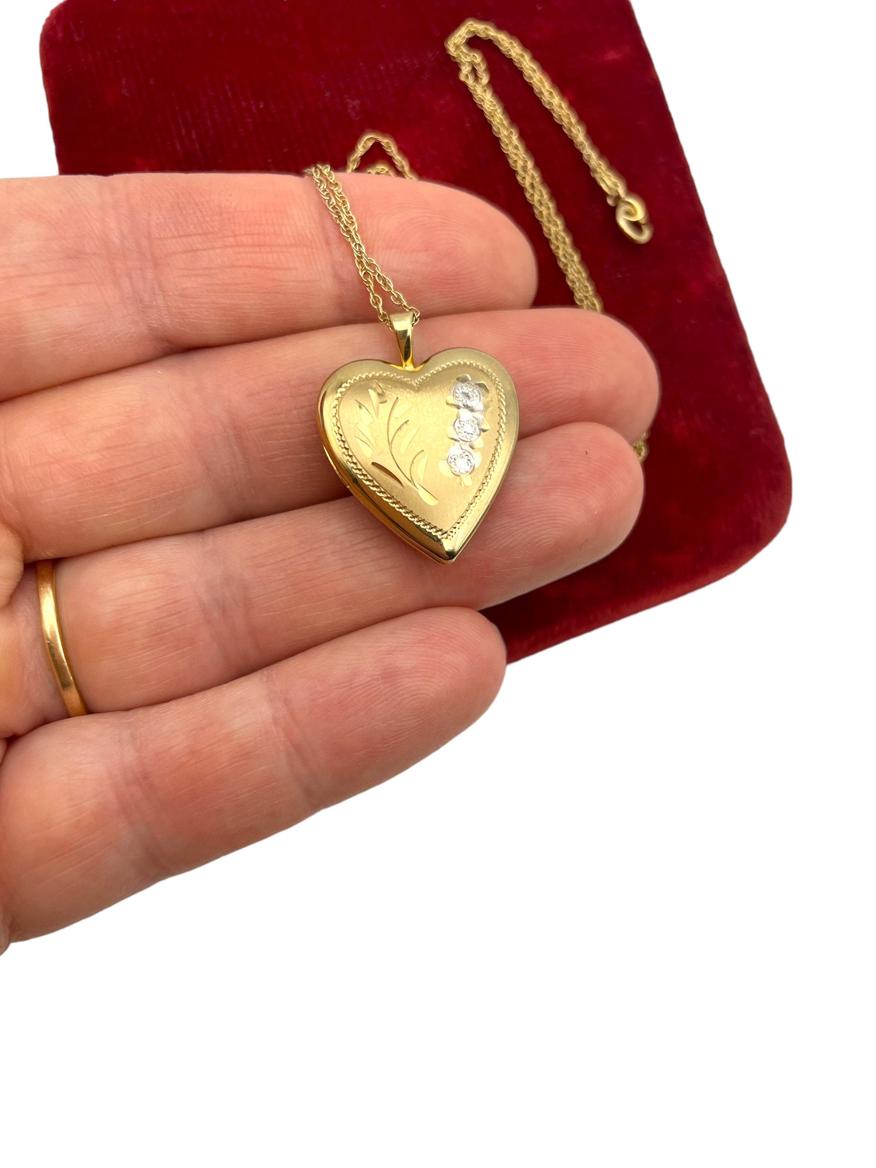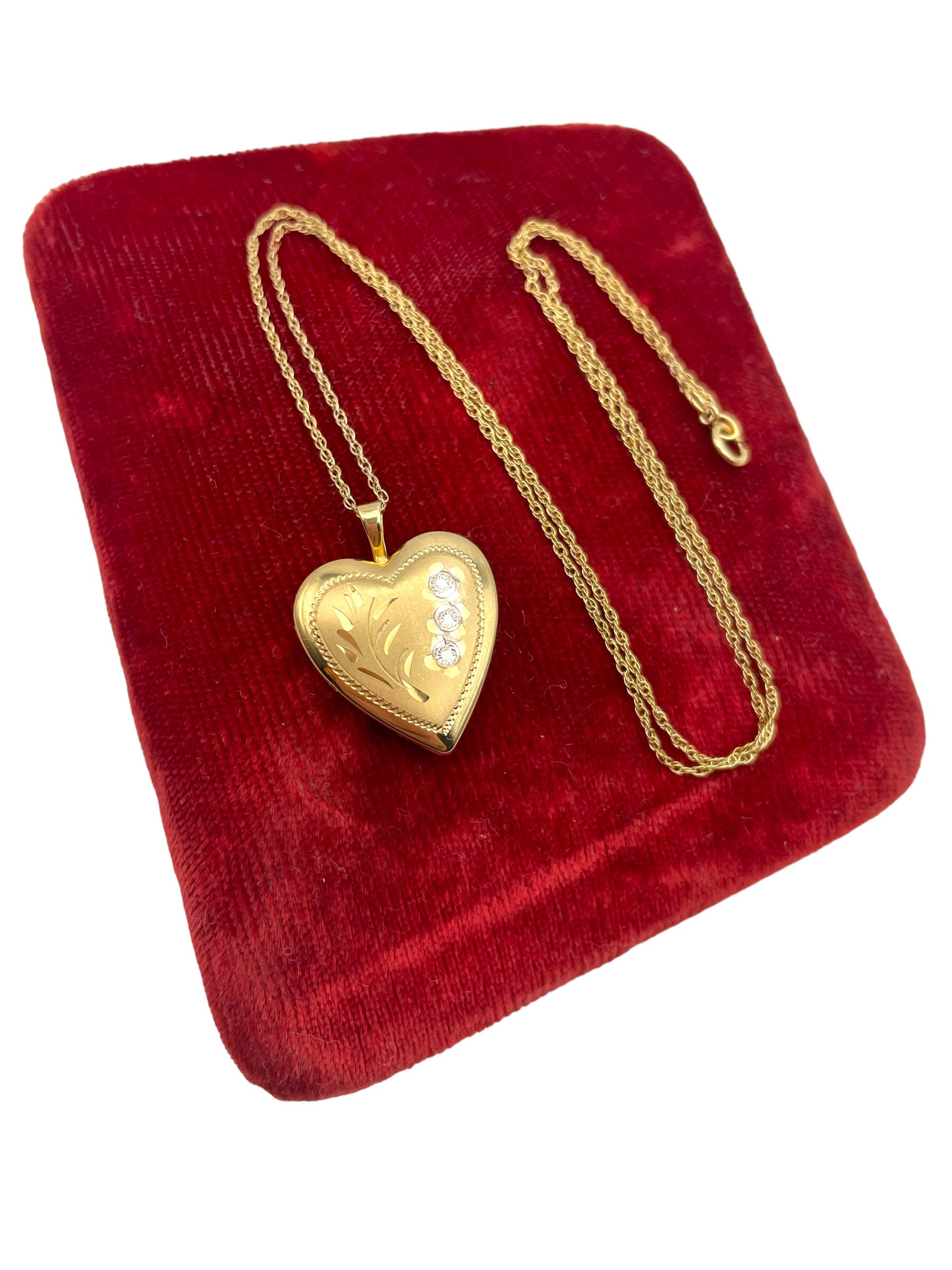 Adorable and dainty classic vintage 14K gold filled heart shaped locket necklace. The sweet and feminine piece has a gold heart with a floral design (three flowers) etched on the right side with a leaf pattern on the left side. The interior of the locket is completely empty and can hold two photos (one on each side). Both of the original frames are intact.