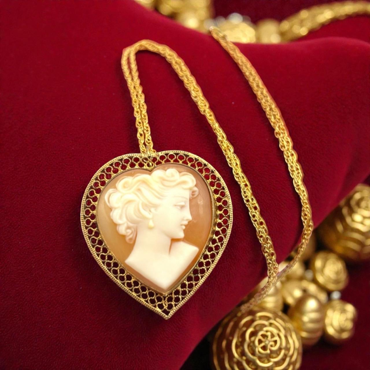 A vintage cameo converter pendant and brooch pin with an ornate and gold filled frame done in a fine openwork all around it. This heart shaped cameo pendant and/or brooch hangs on a 14K GF rope chain that is 22” long. It is a converter pendant and brooch that can be worn as a pendant or as a pin.