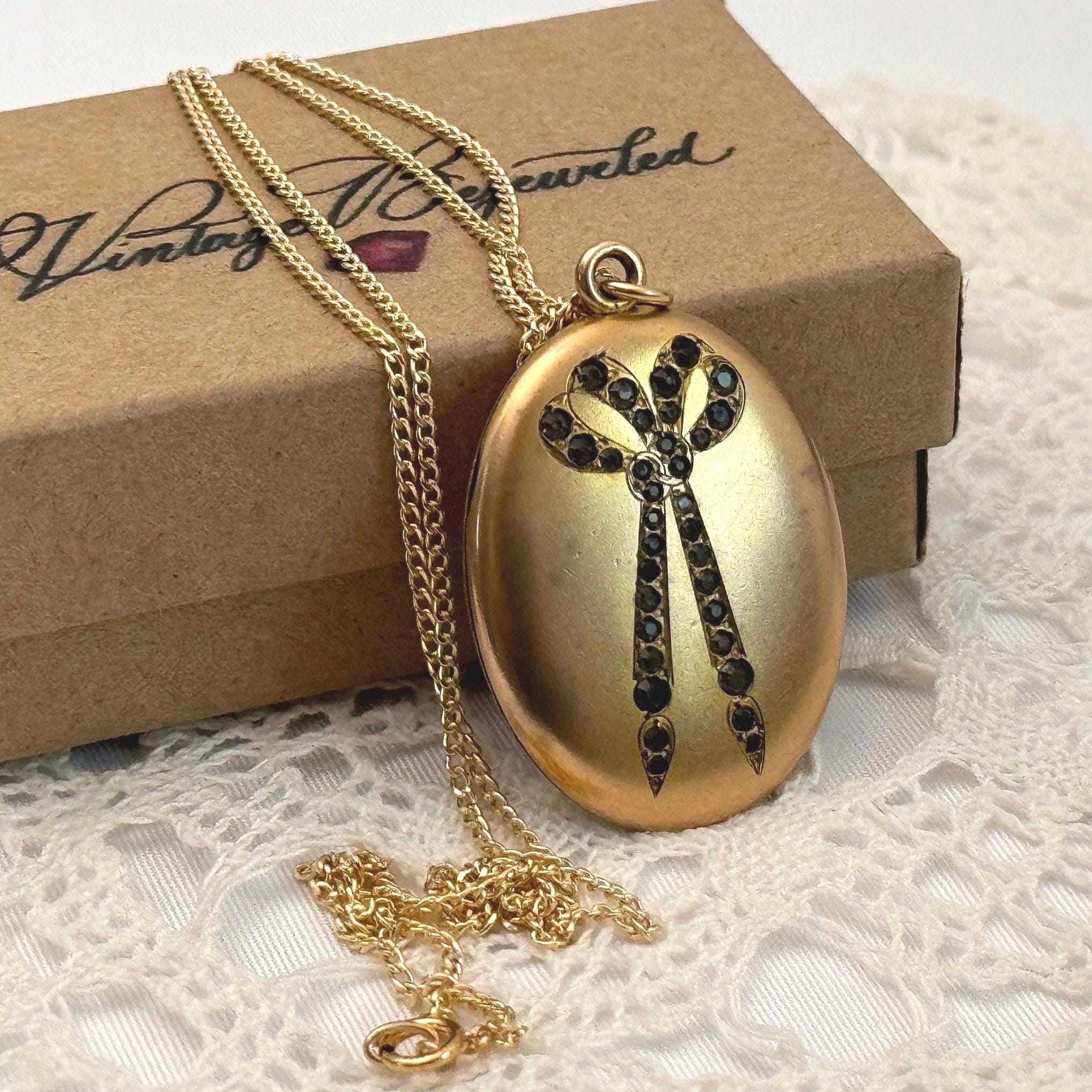 Antique Gold Filled Oval Locket: Ornate Bow, Paste Gems, 14K GF Chain