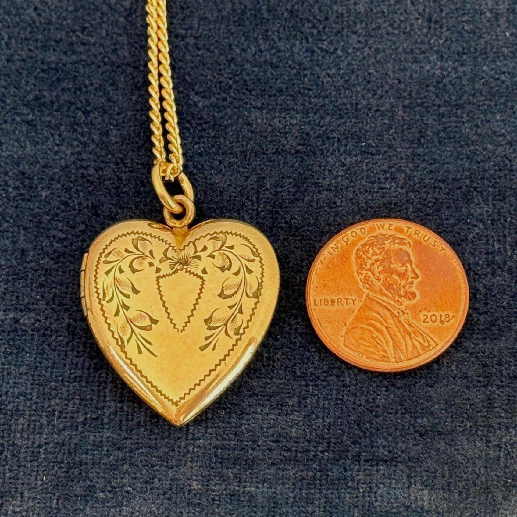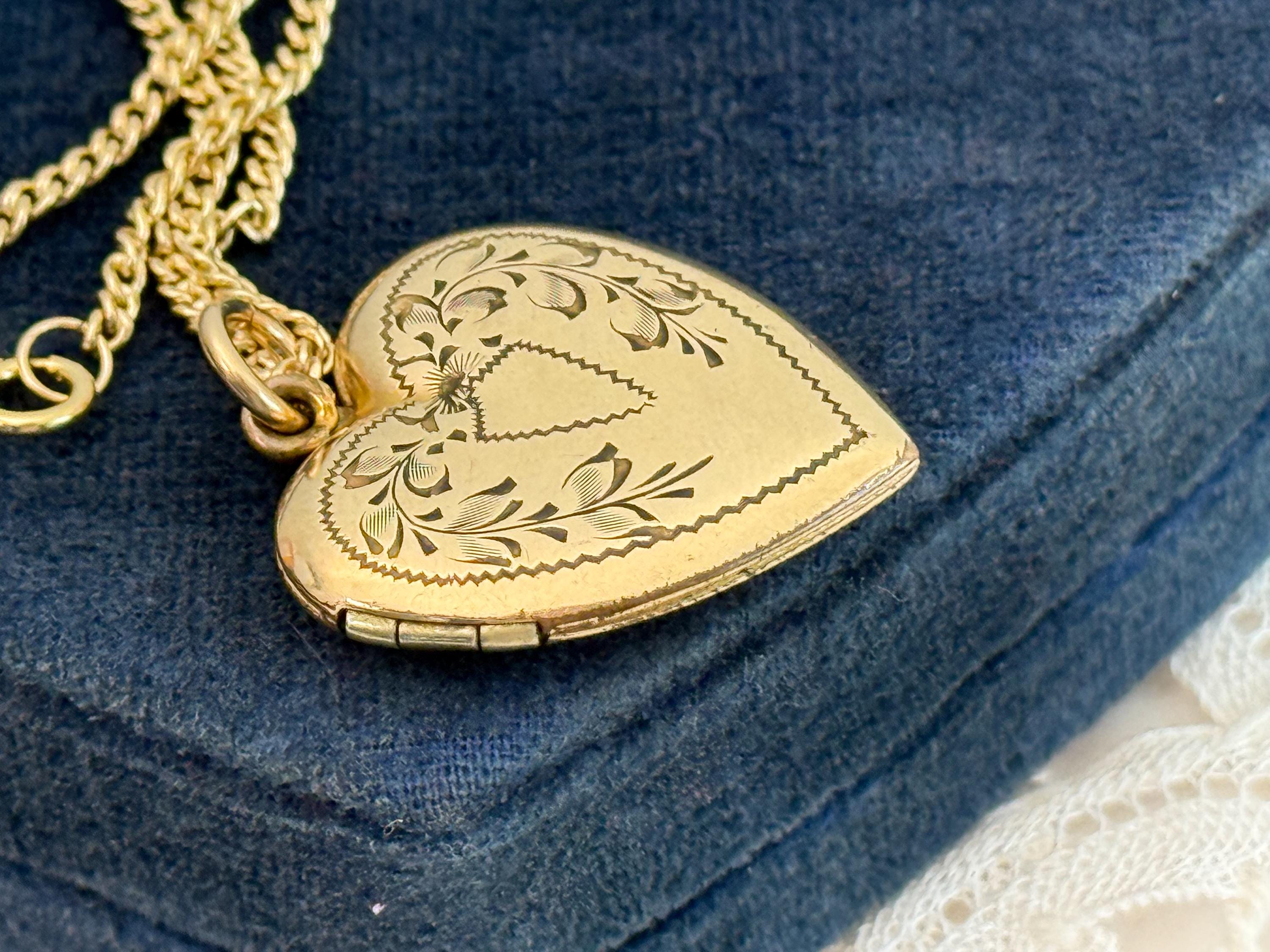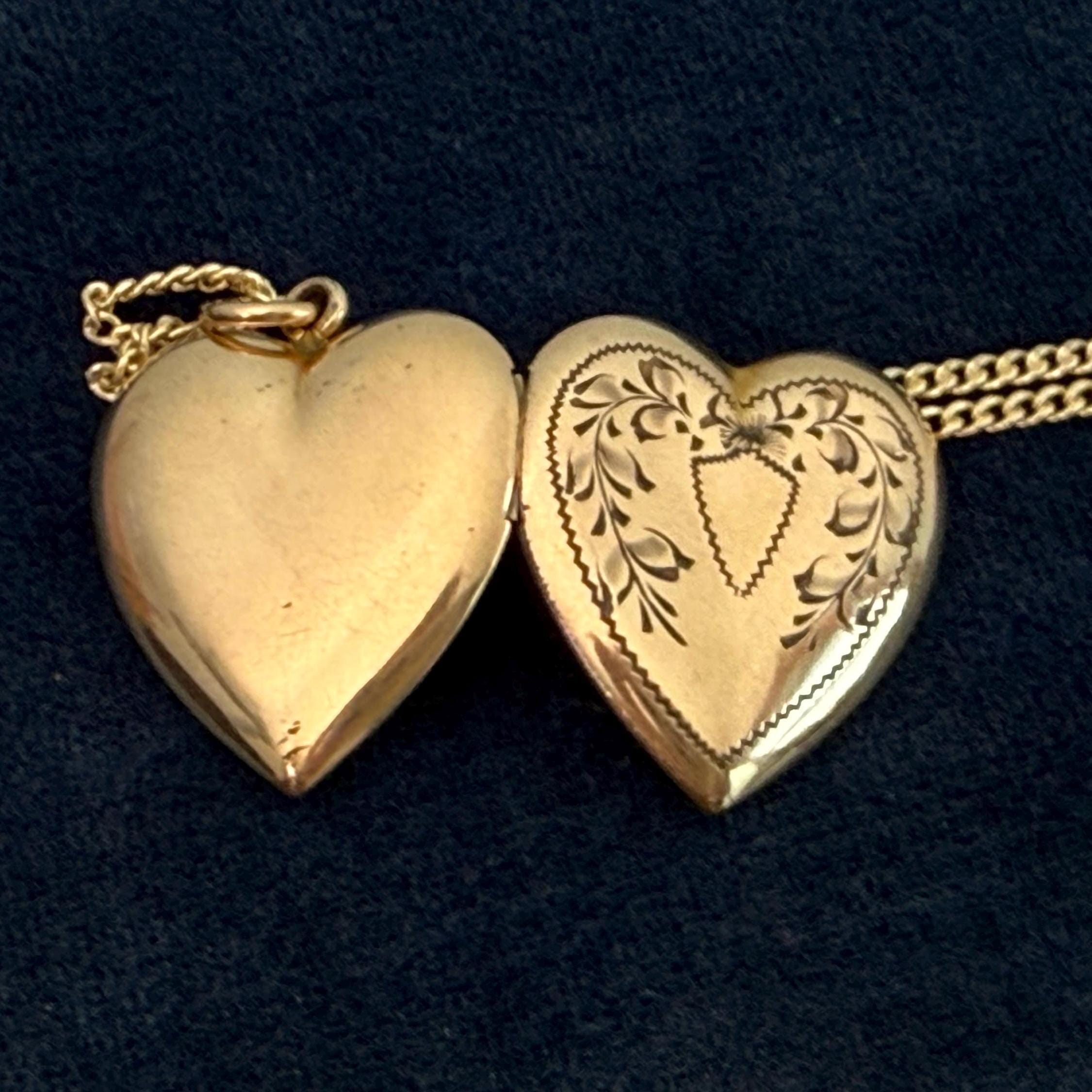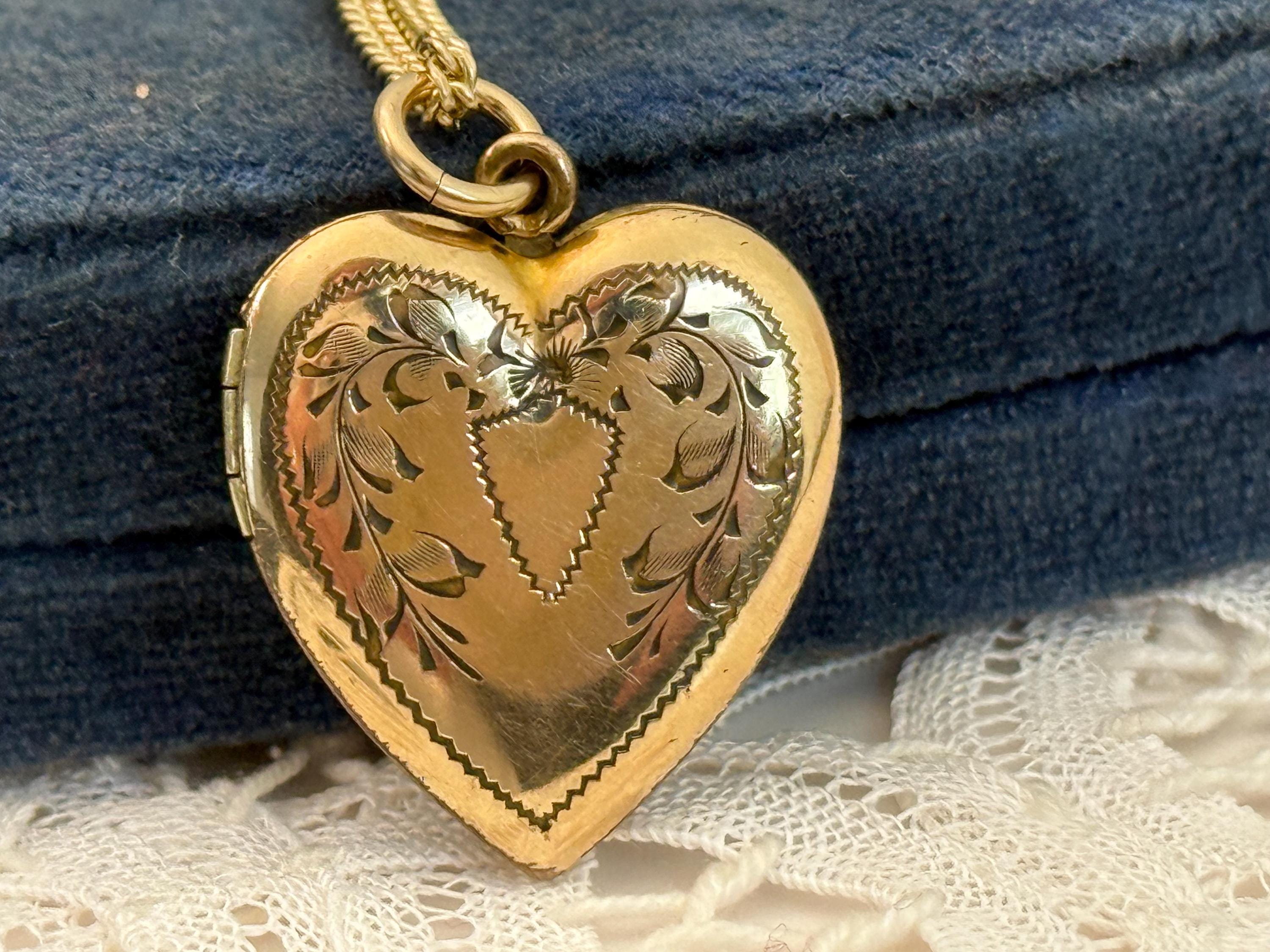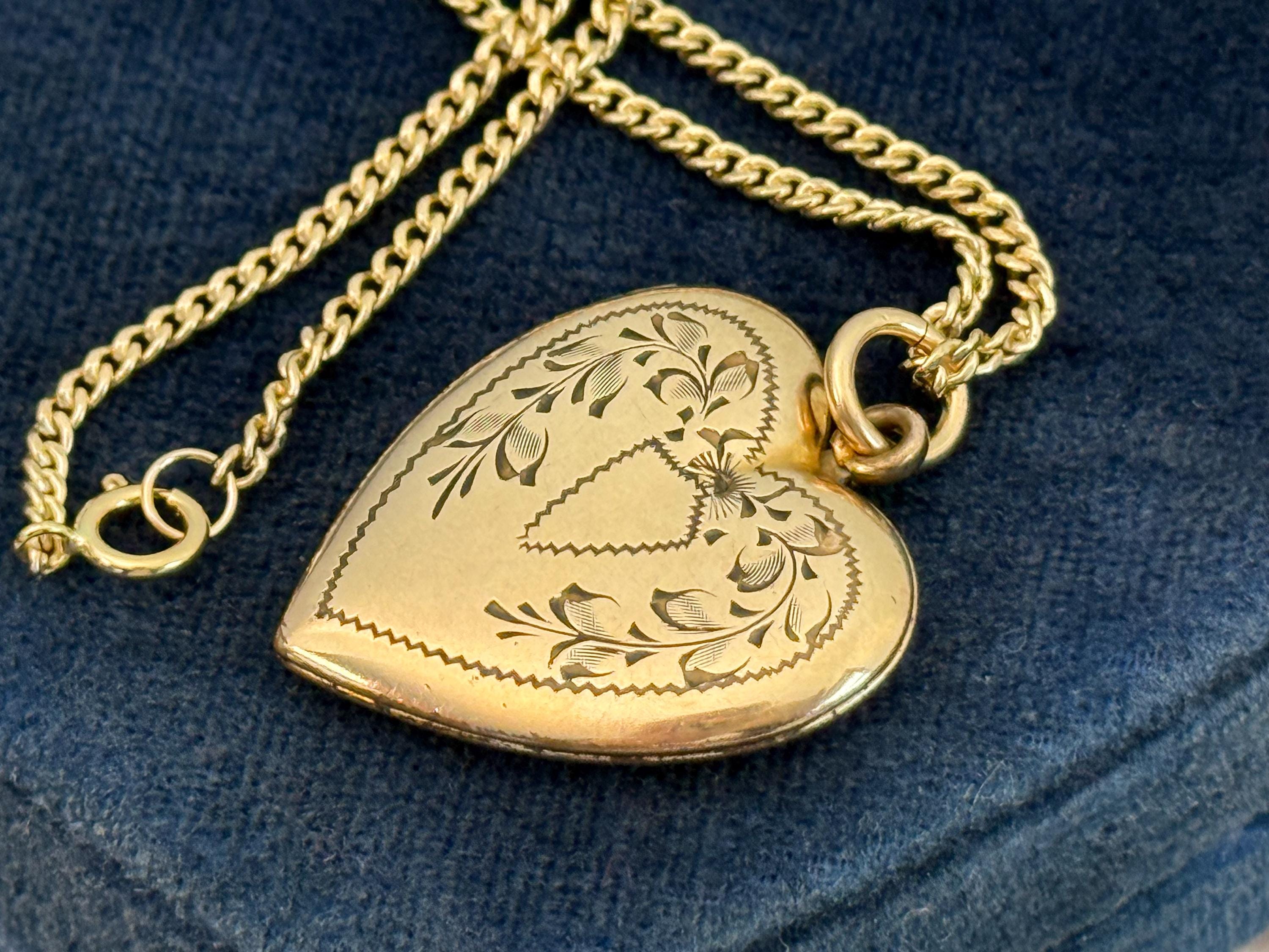 Vintage Etched Heart Locket, 12K Gold Filled, 14K GF Chain