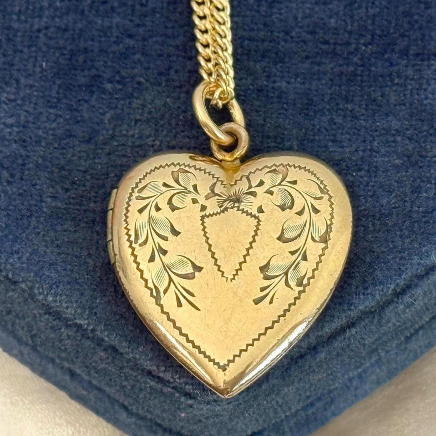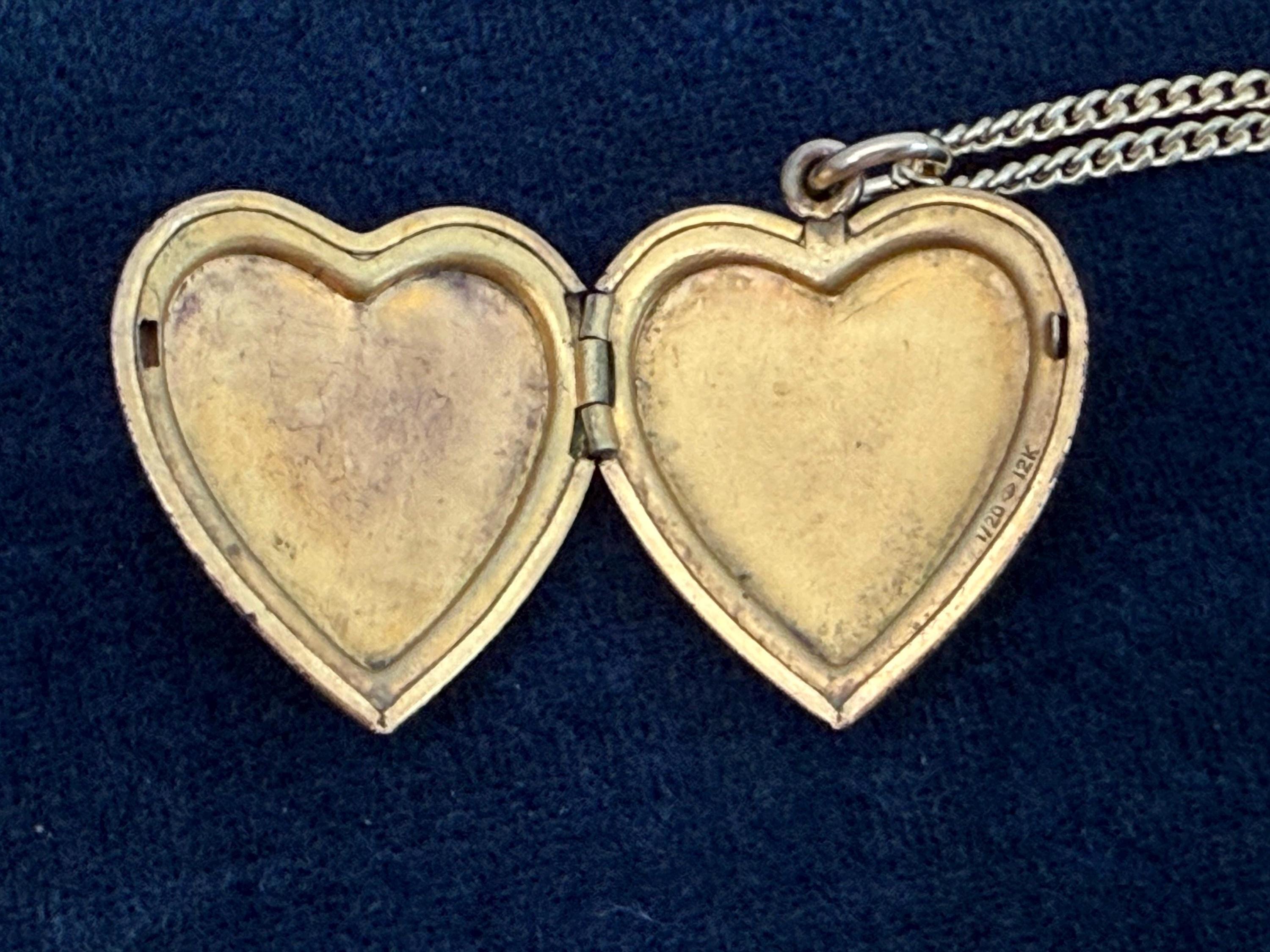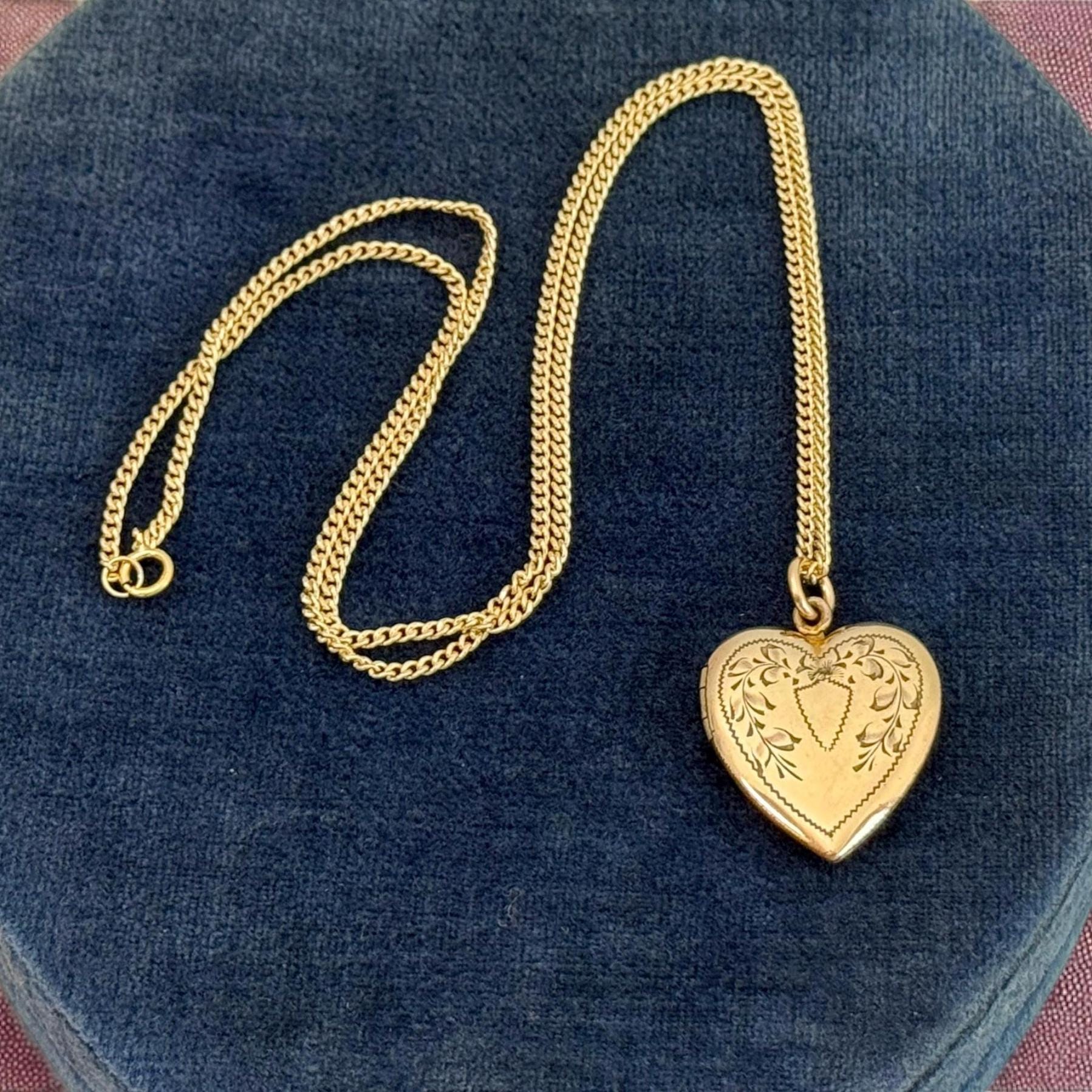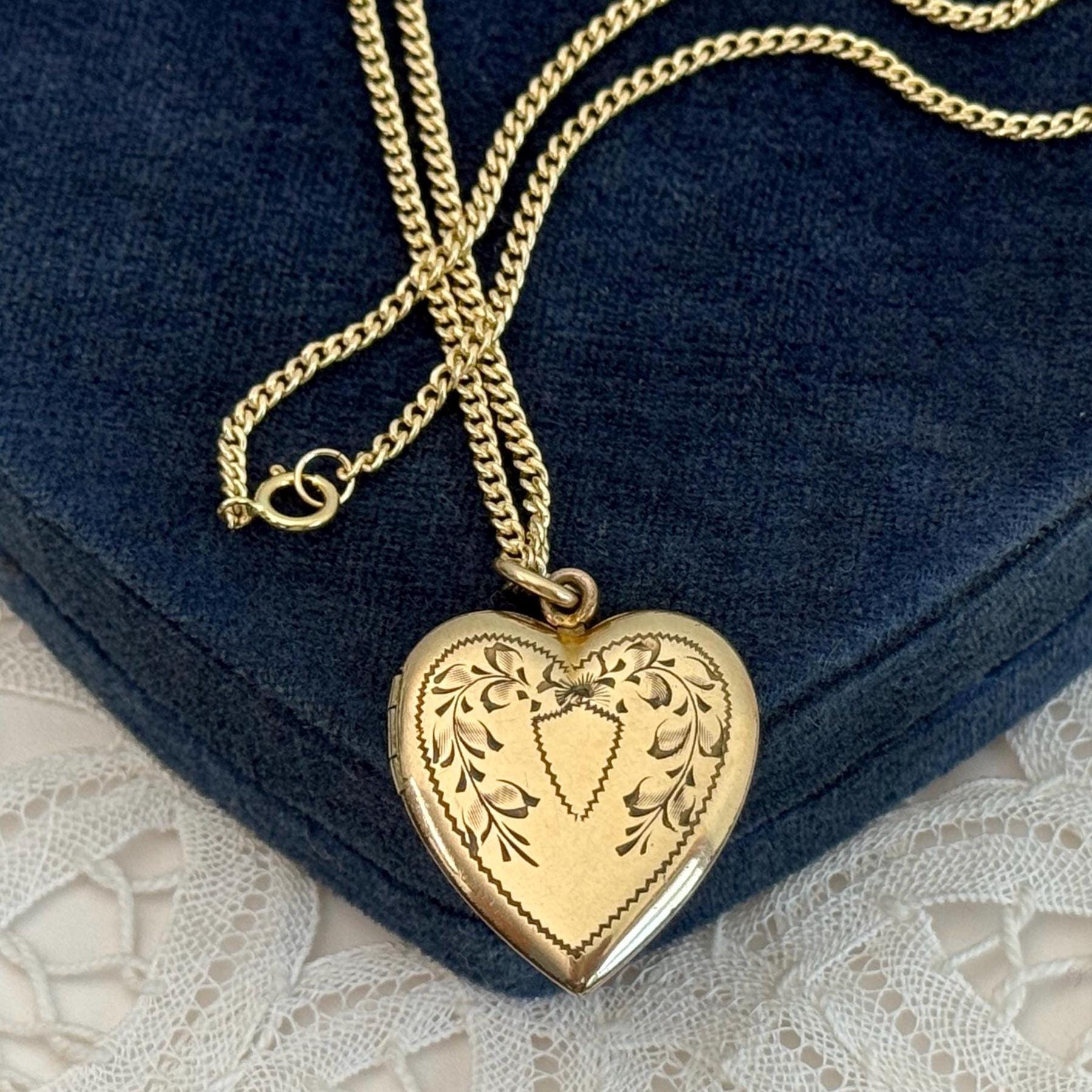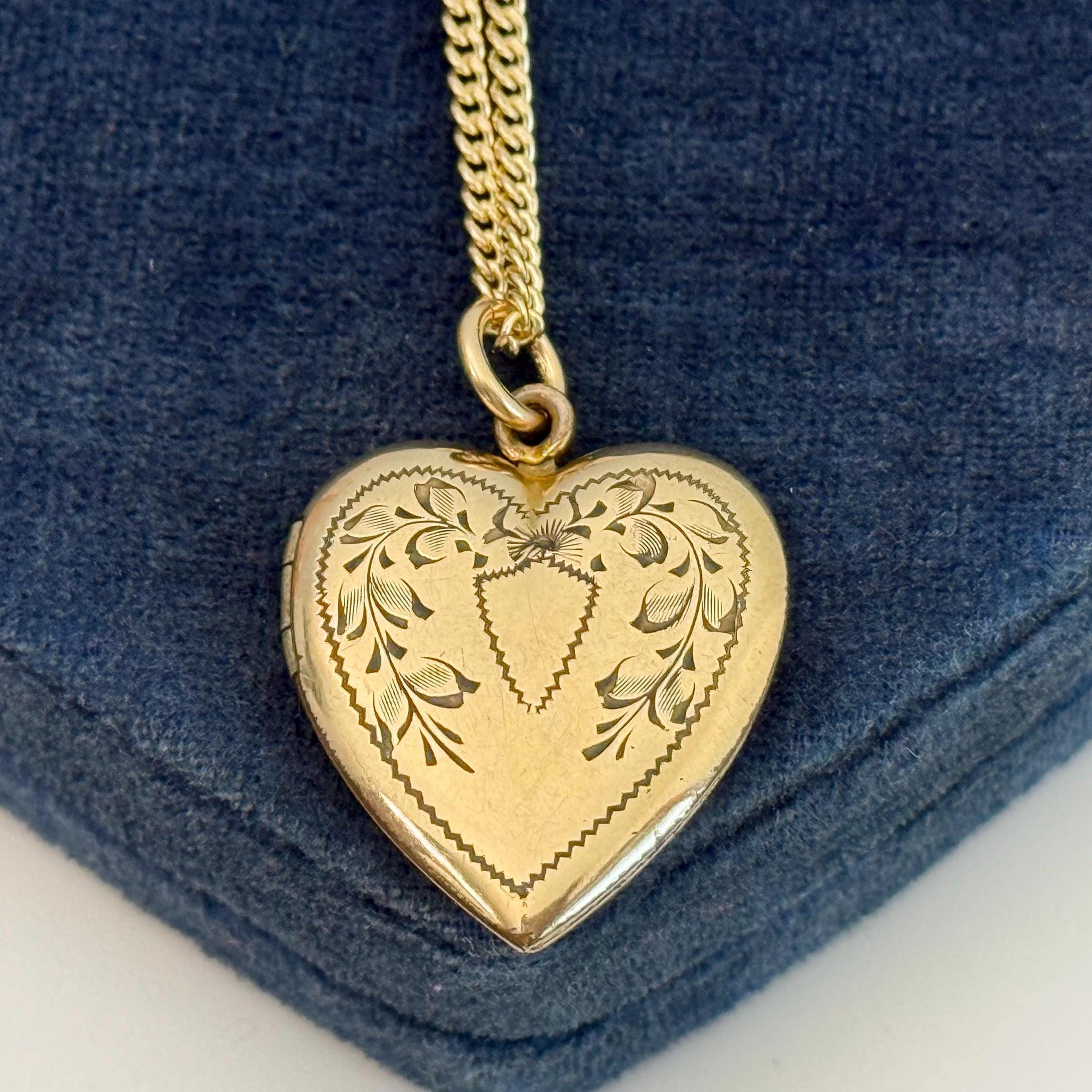 Vintage Etched Heart Locket, 12K Gold Filled, 14K GF Chain
