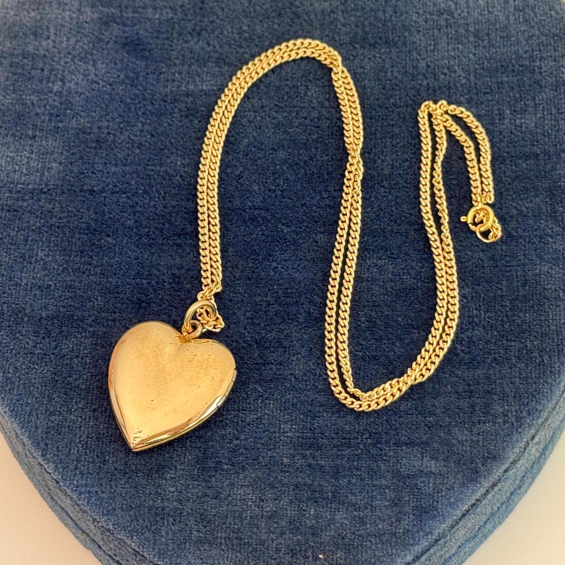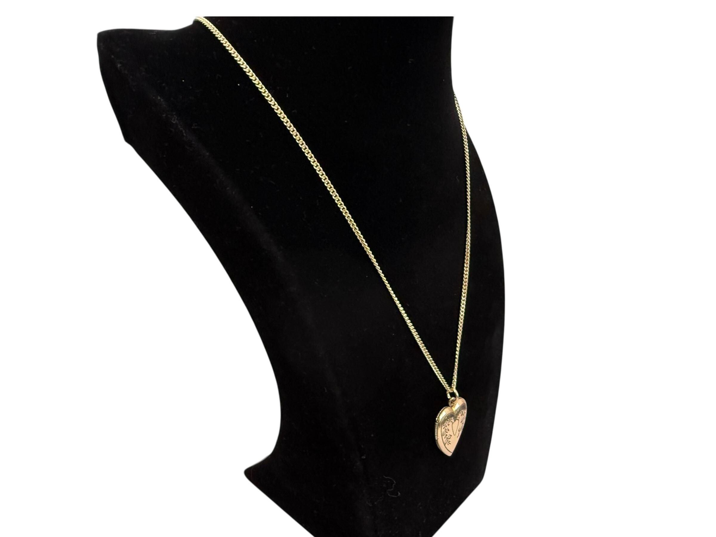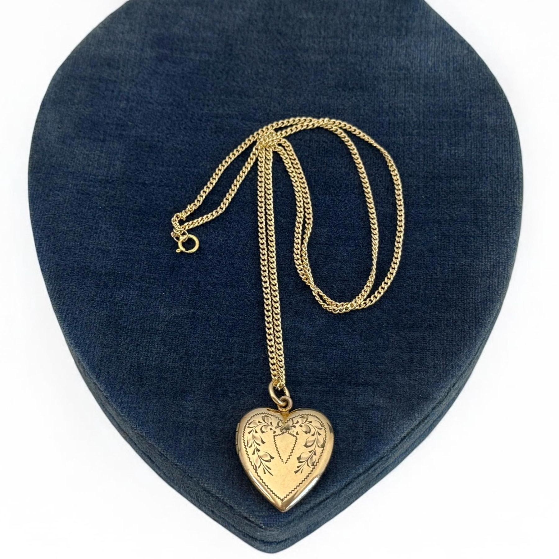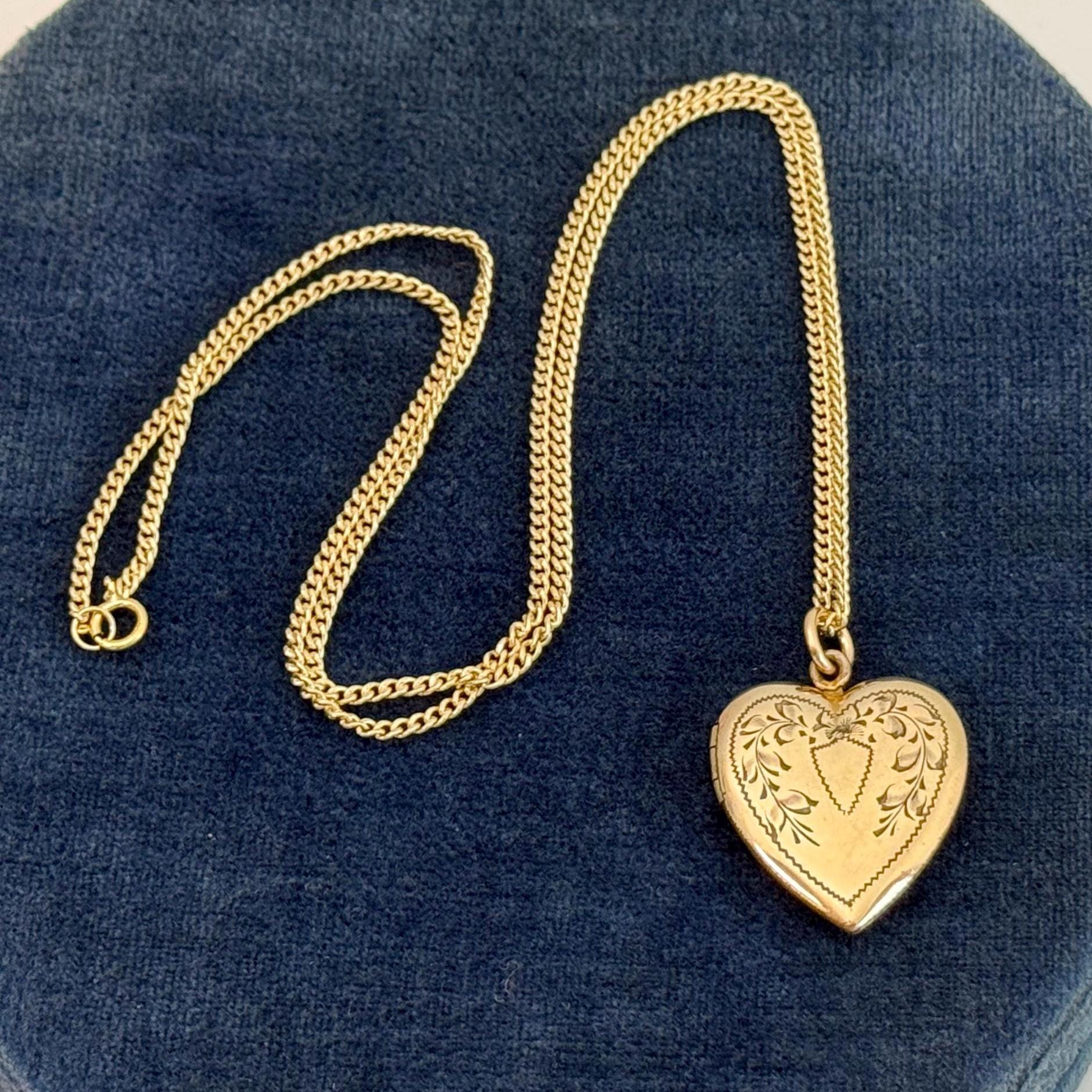 The sweet etched heart shaped locket is circa mid century. It is attached to a new 14K gold filled curb chain that is 22" in length.