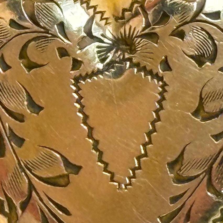 Lovely vintage 12K gold filled etched heart locket with a shield cartouche and leafy design on the front. This Retro Era locket hangs on a new 14K gold filled curb chain.