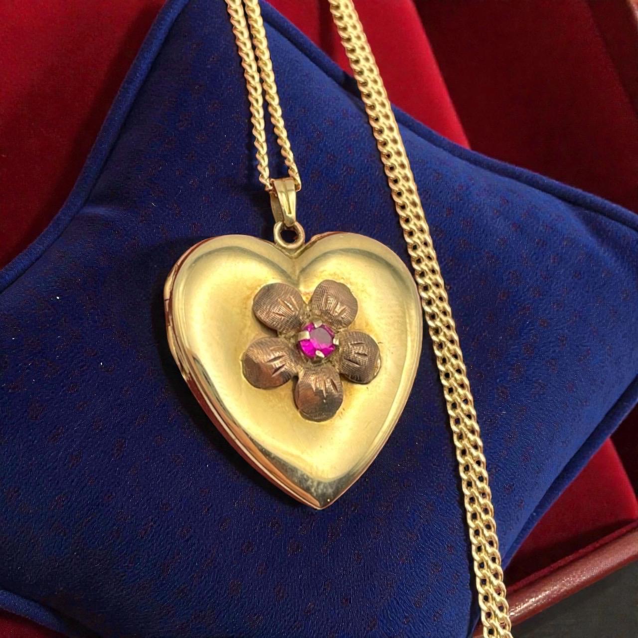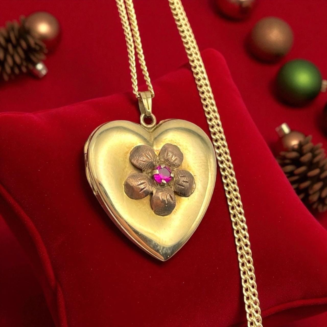 Vintage 10K Gold Heart Locket Necklace: Pink Sapphire Flower, Keepsake Photo Pendant