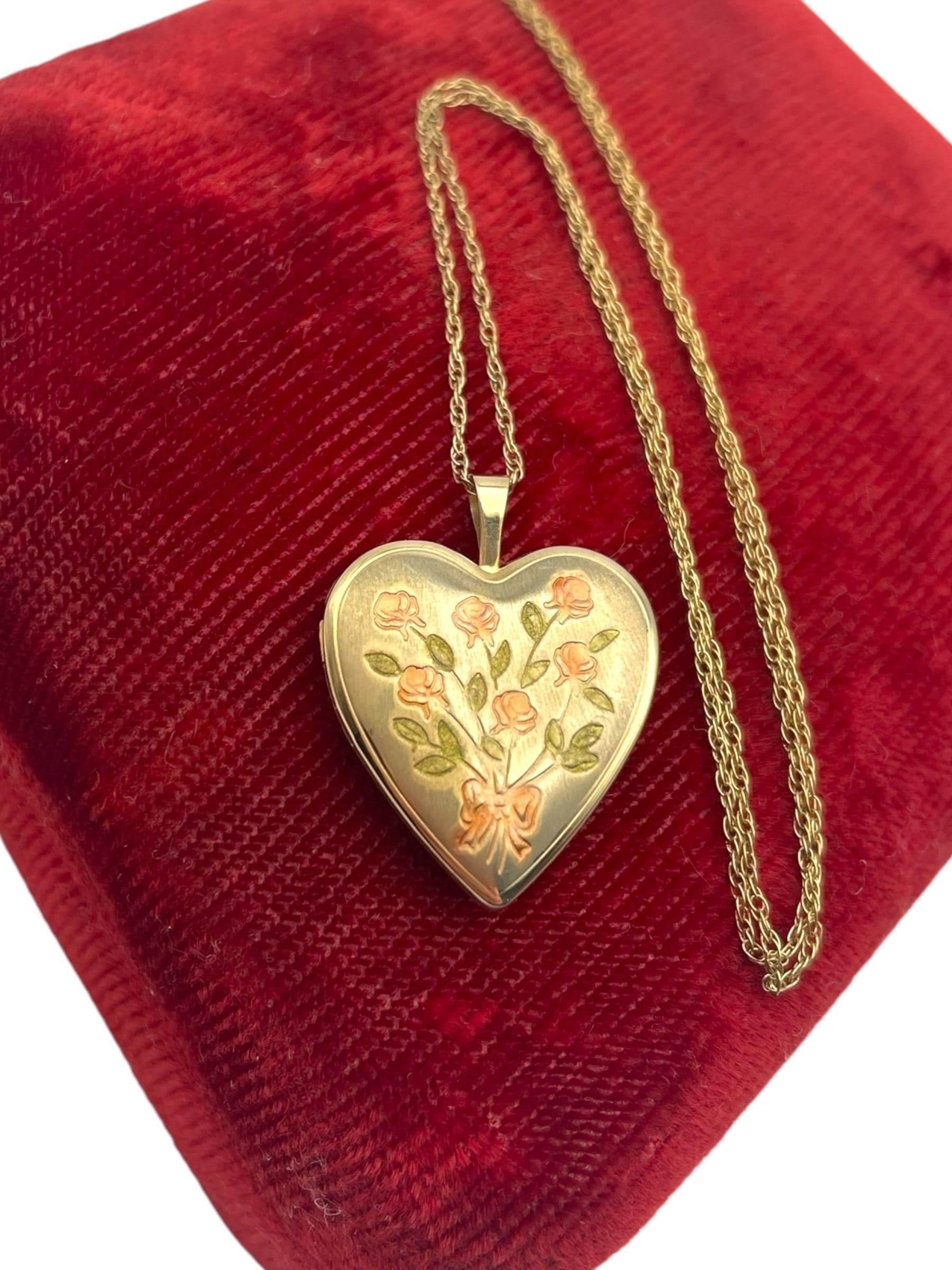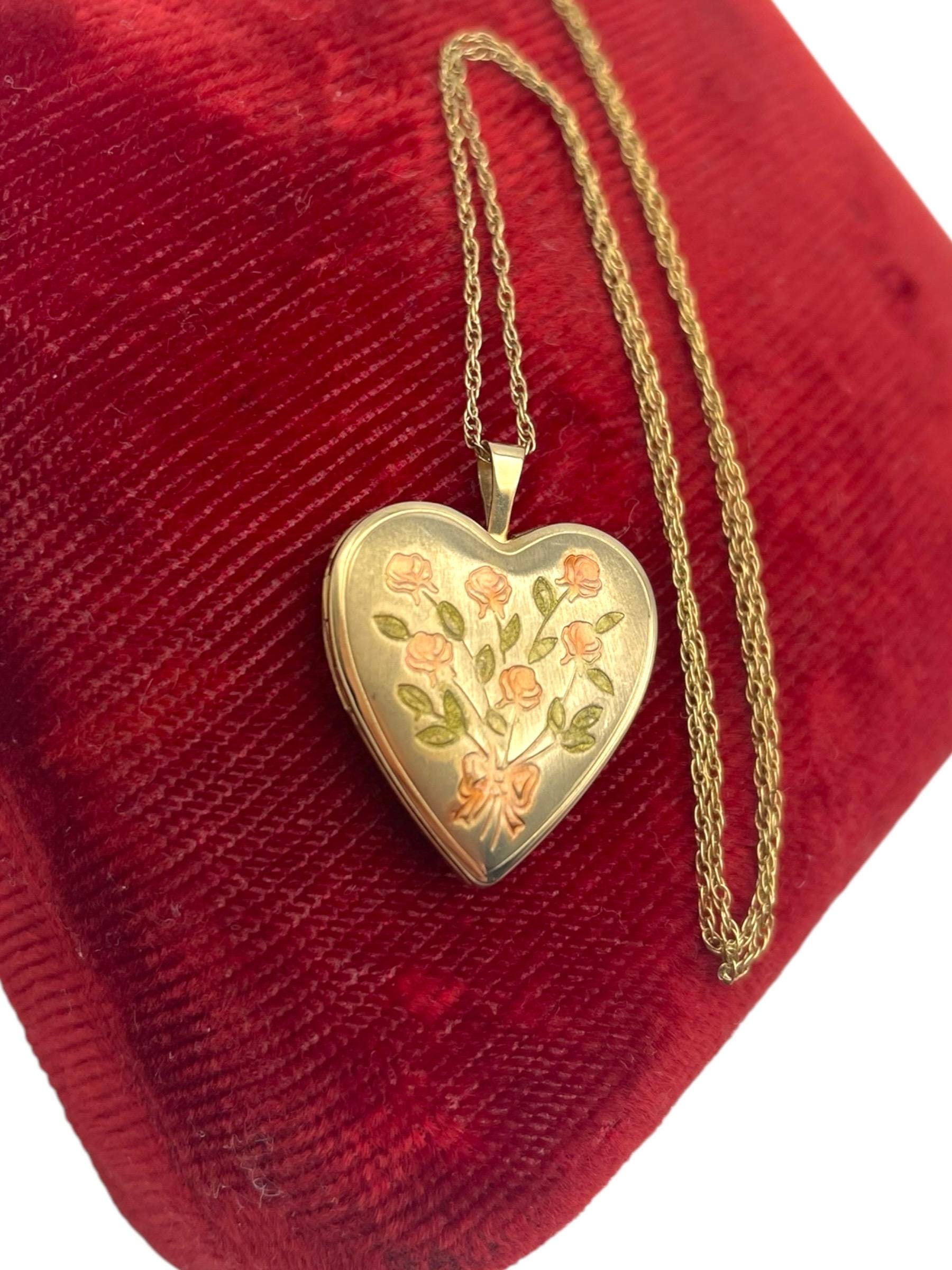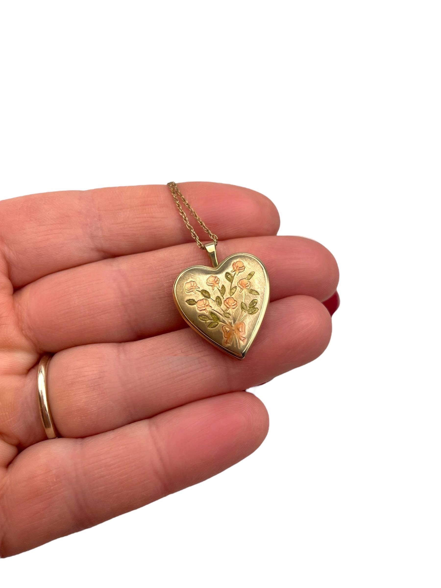 Pretty and pink vintage gold filled heart shaped locket on a 14K gold filled chain. The sweet and feminine locket pendant has a bouquet of pink roses with green stems on the front, tied at the bottom with a pink ribbon. The back of this little locket is plain with no design. The original frames and paper inserts remain.