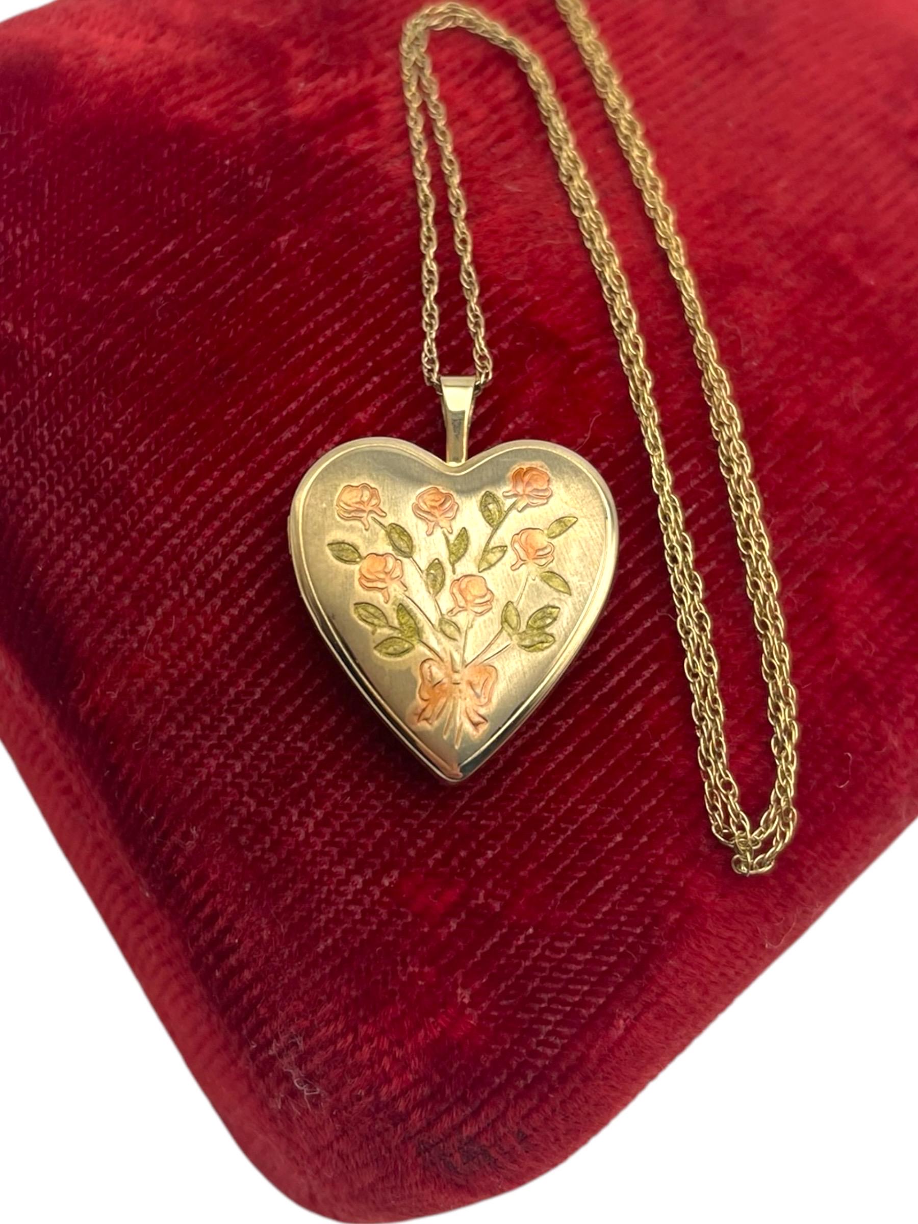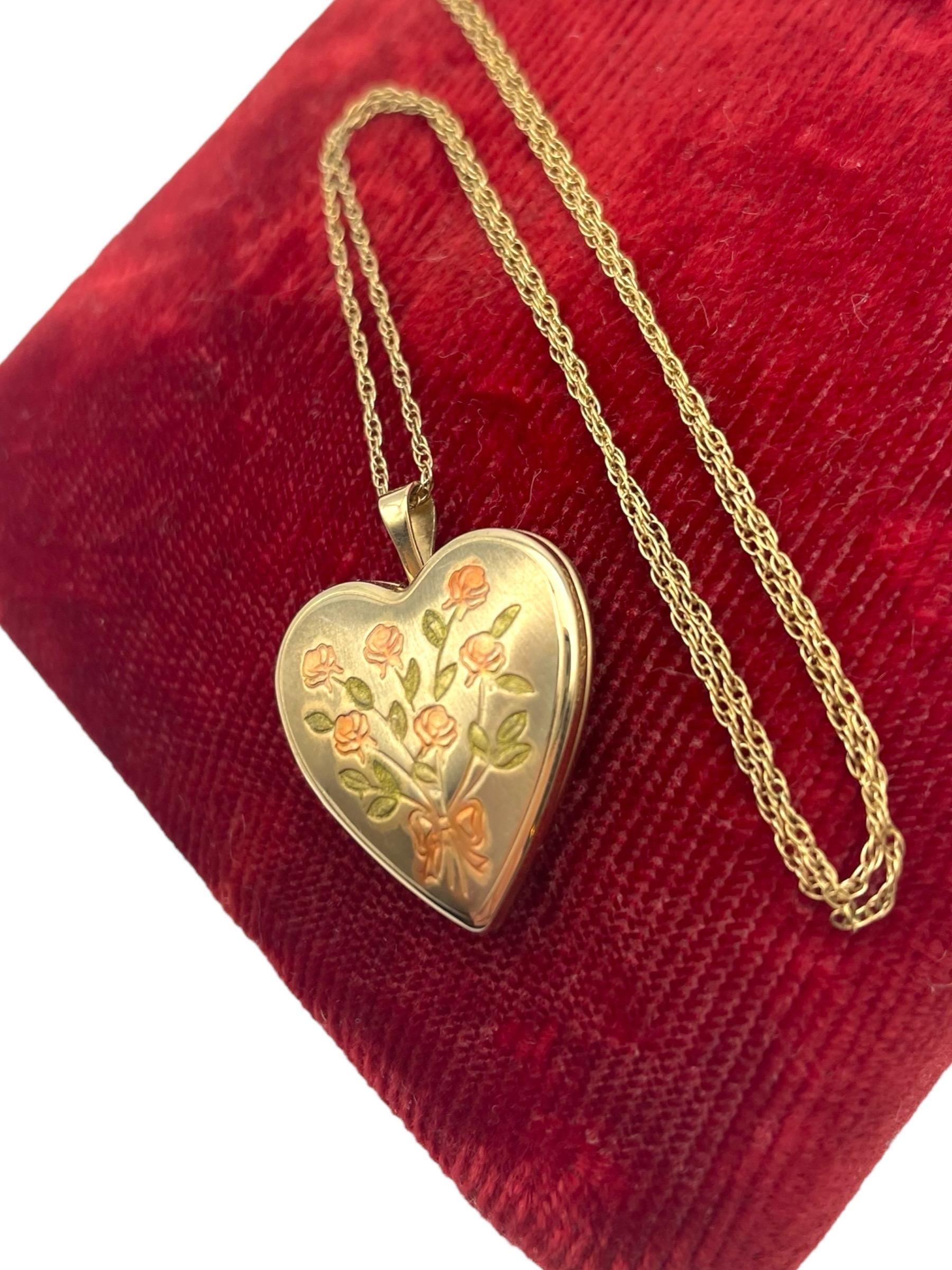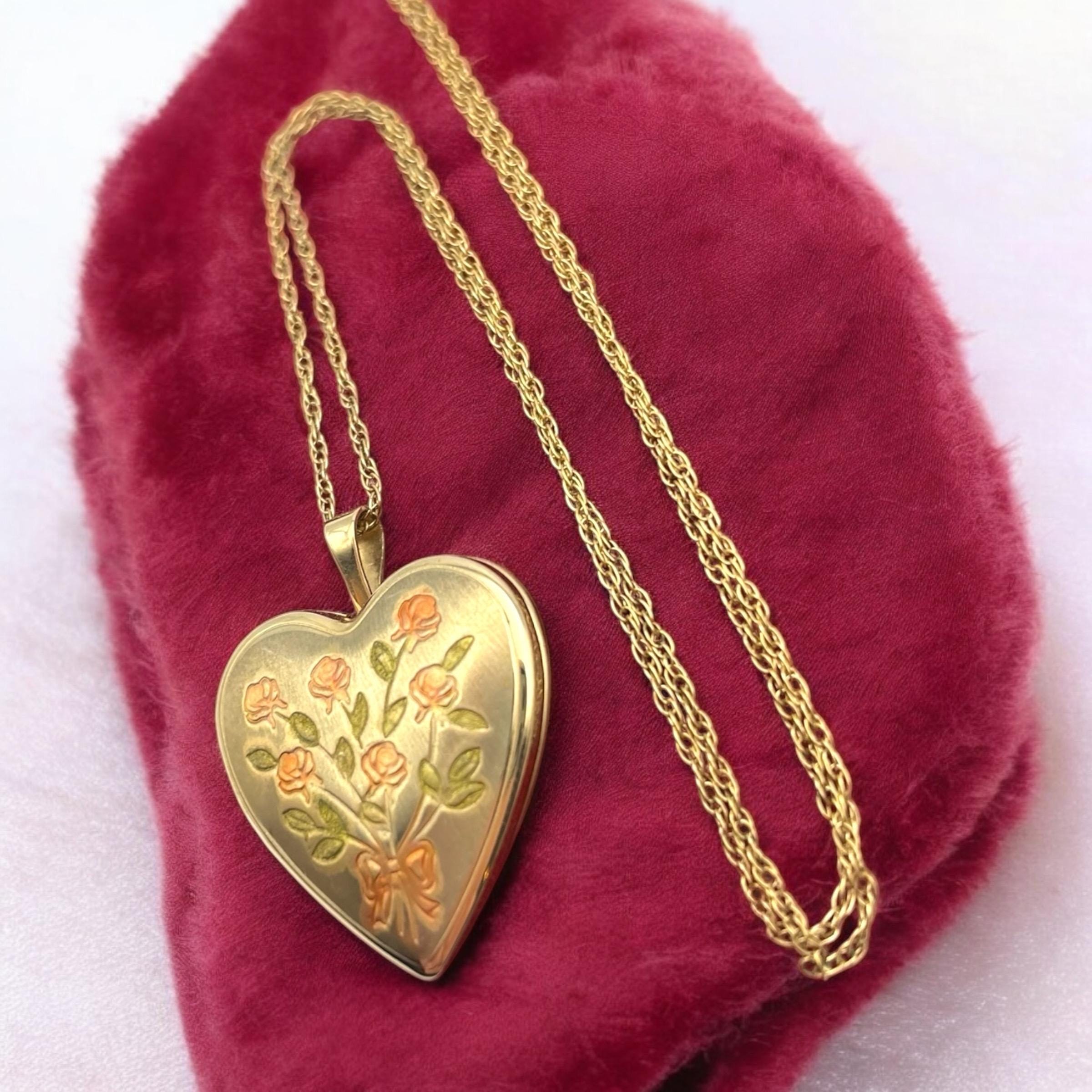 Pretty and pink vintage gold filled heart shaped locket on a 14K gold filled chain. The sweet and feminine locket pendant has a bouquet of pink roses with green stems on the front, tied at the bottom with a pink ribbon. The back of this little locket is plain with no design. The original frames and paper inserts remain.