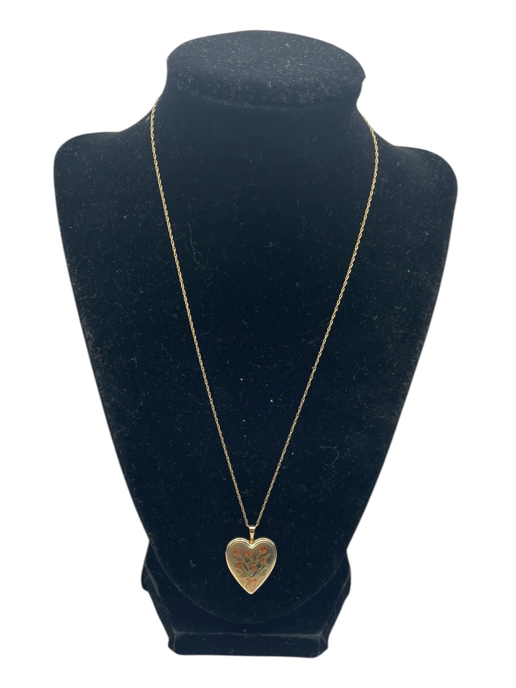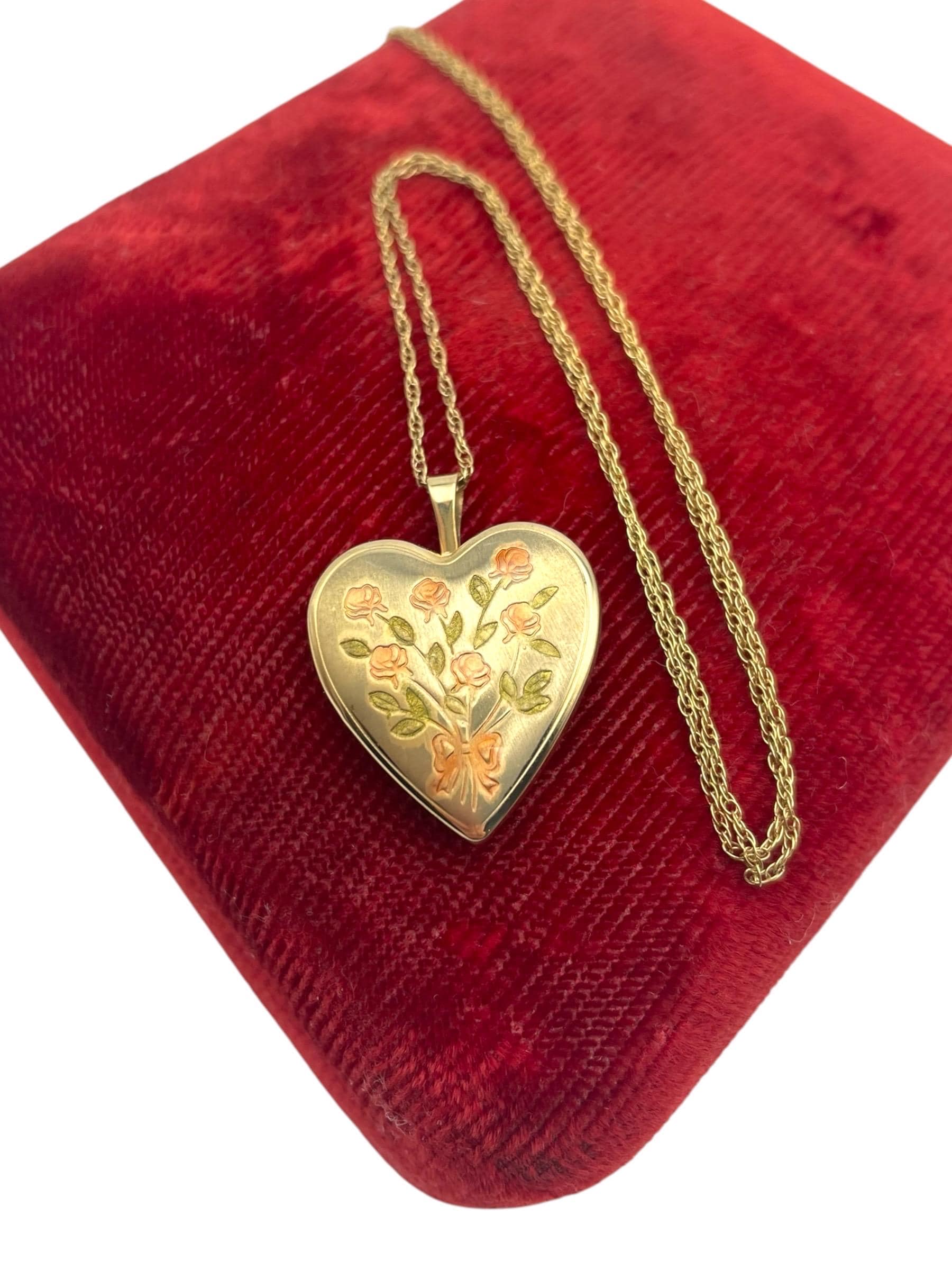 Heart Locket Necklace - Vintage 14K Gold Filled Heart PPC Locket Pendant - 14K GF Chain Pink Roses Flowers Green Leaves Photo Charm Jewelry