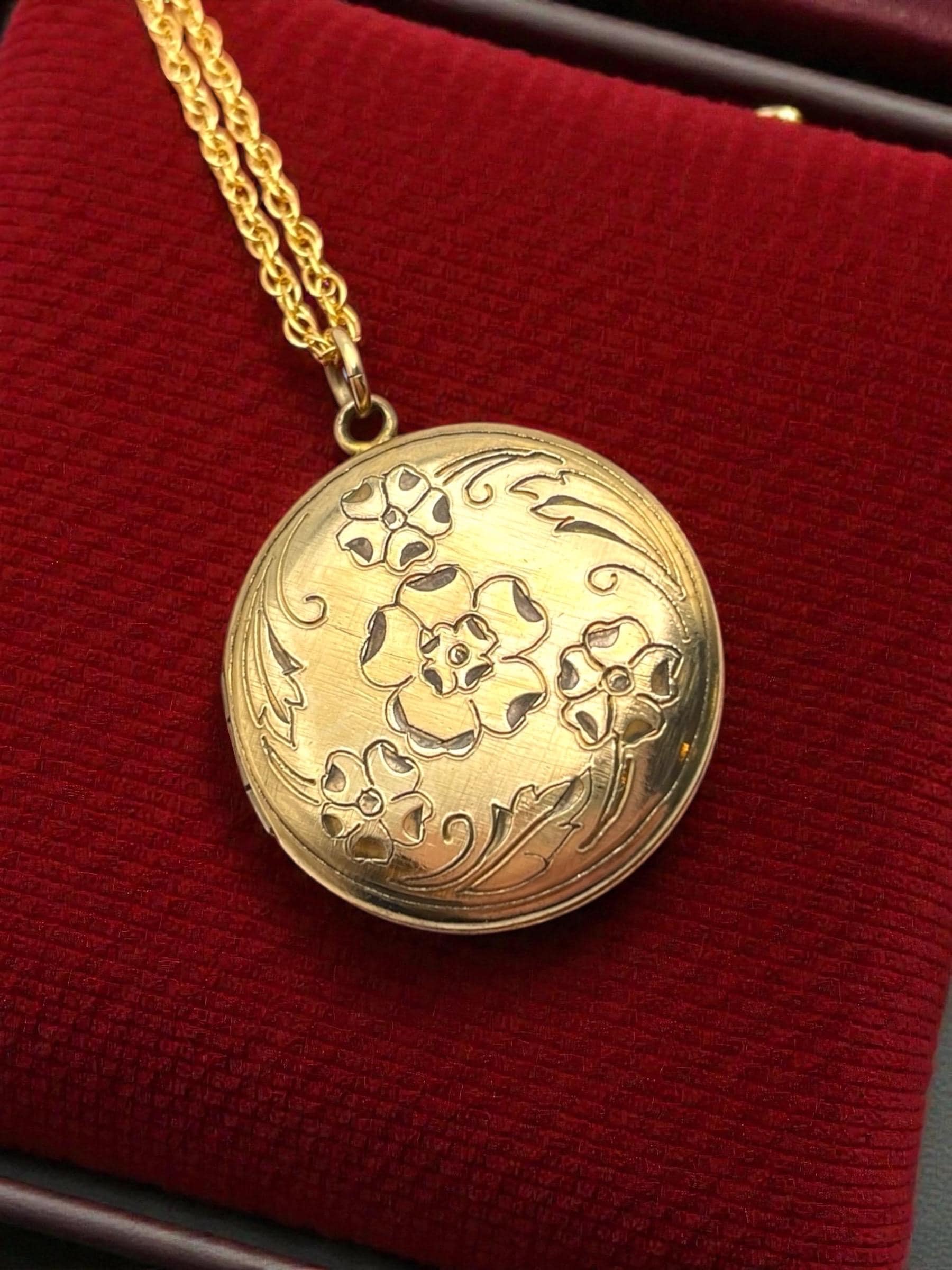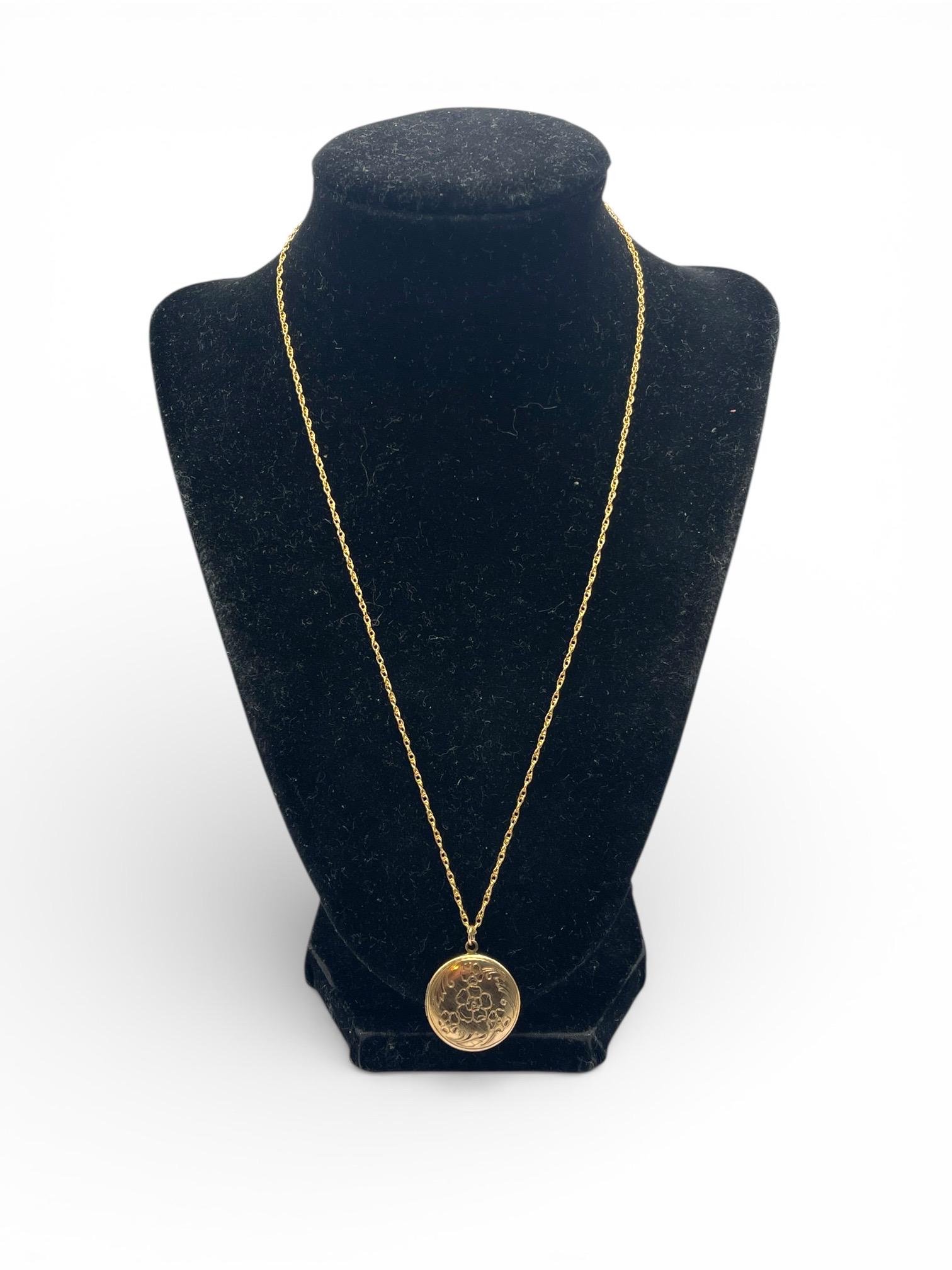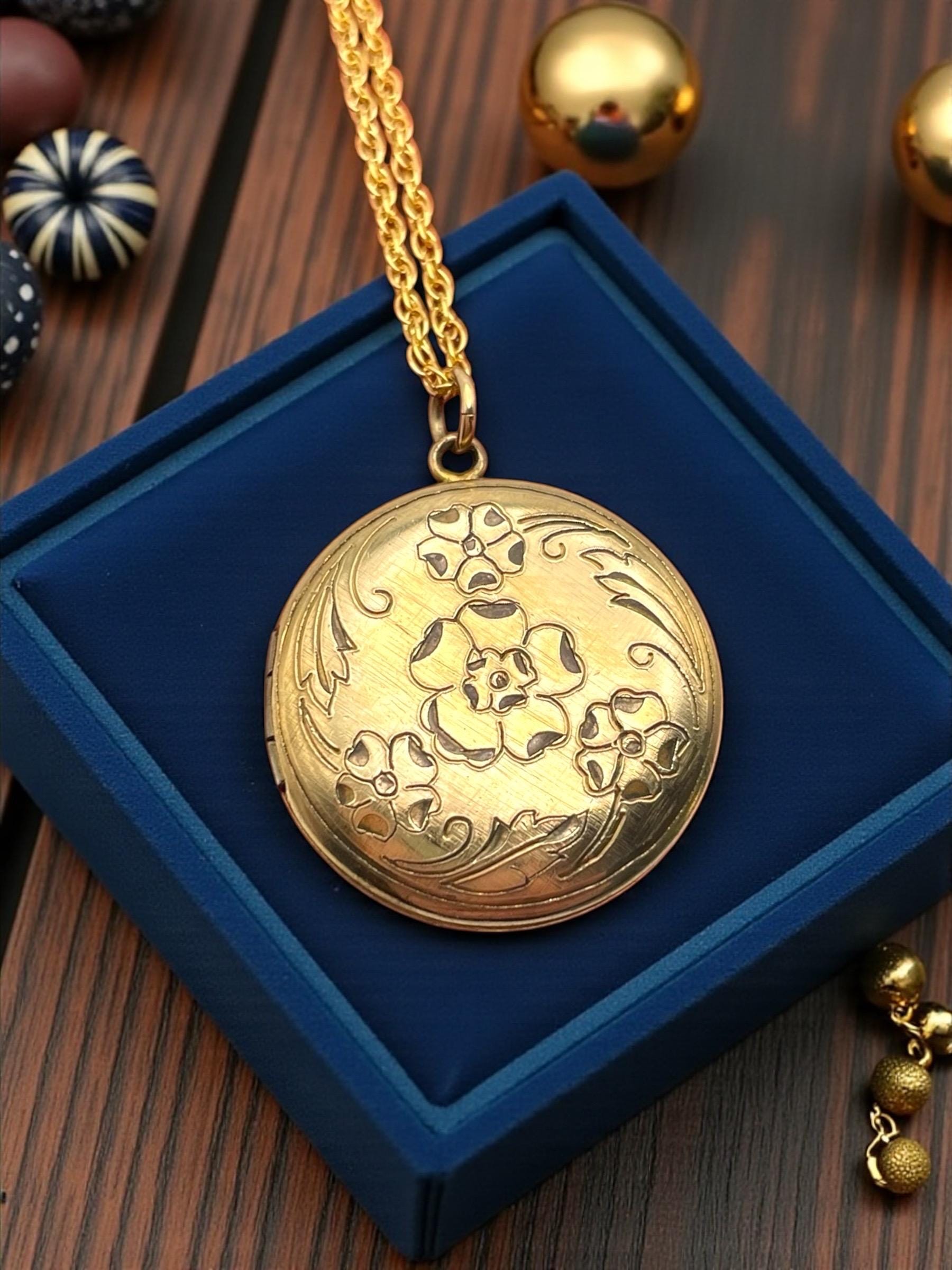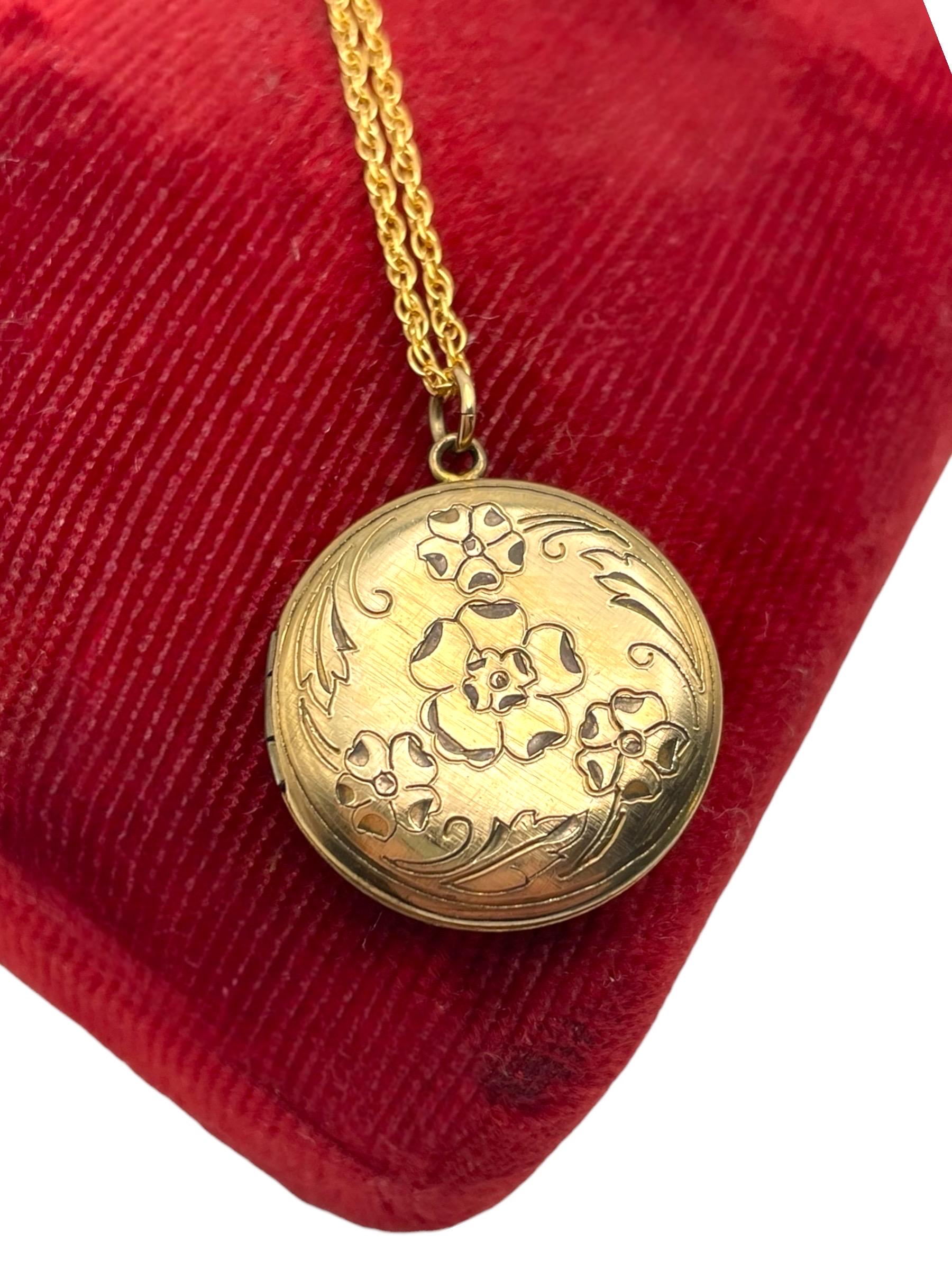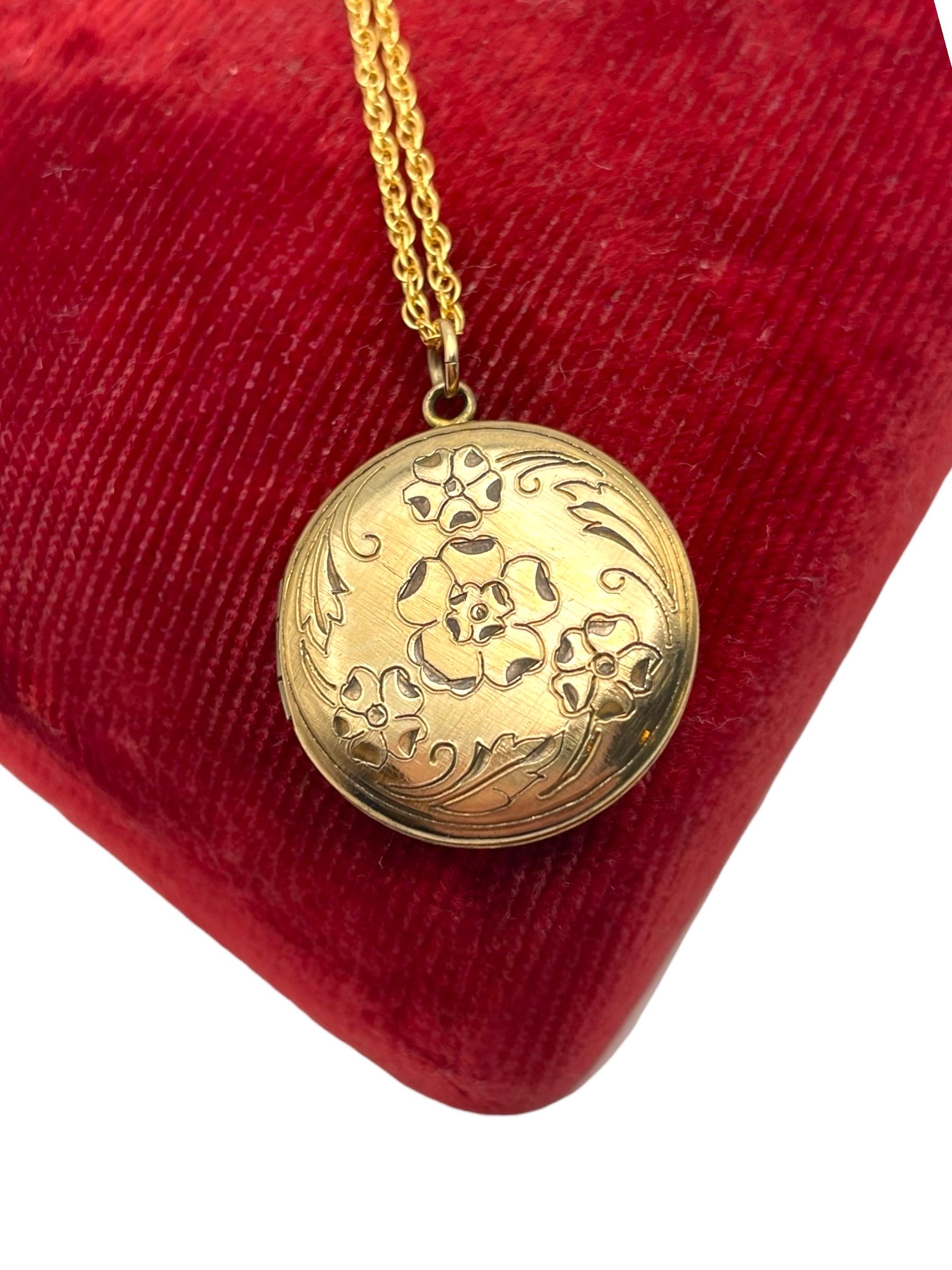 Vintage Floral Etched Locket Necklace: 14K Gold Filled Pendant, 1960s Retro Jewelry
