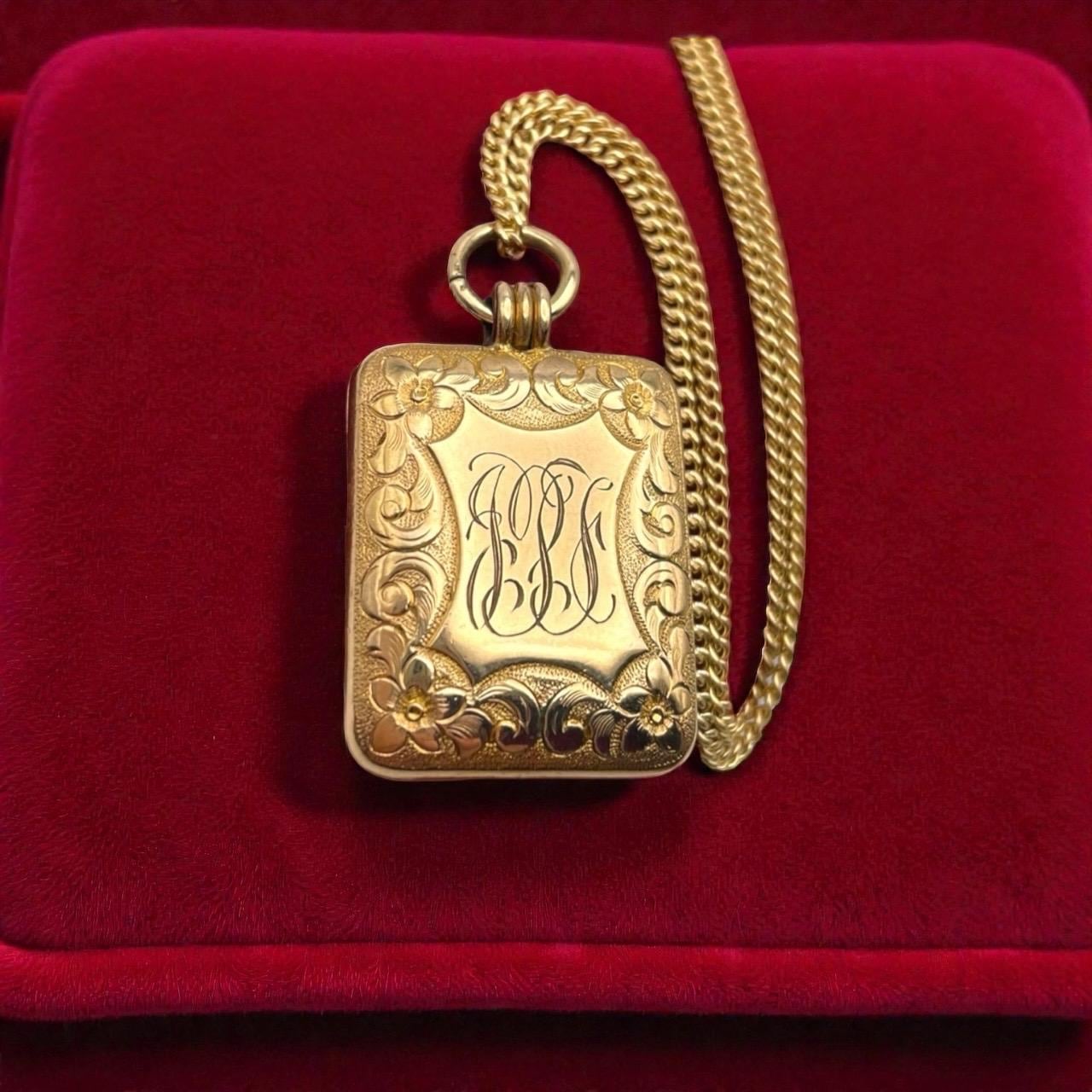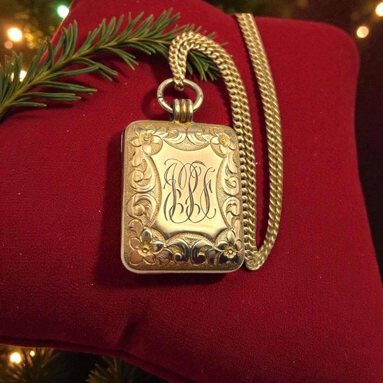 Gorgeous and large gold filled rectangular locket necklace. The front has an etched floral design around the edges with the cursive monogram "JPF" in the center. The back is plain with no design.