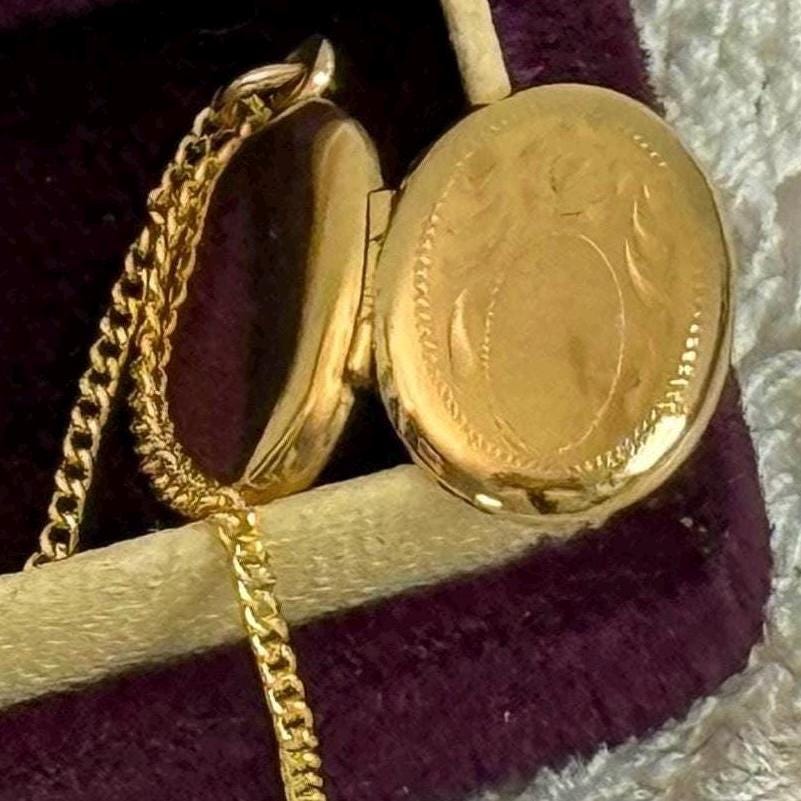 The locket hangs from a new 14K yellow gold filled chain that secures with a spring ring clasp. The clasp opens and closes as it should.