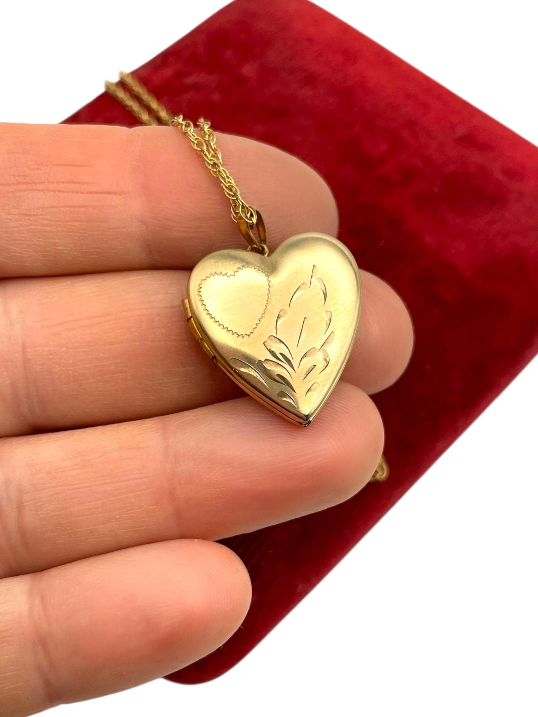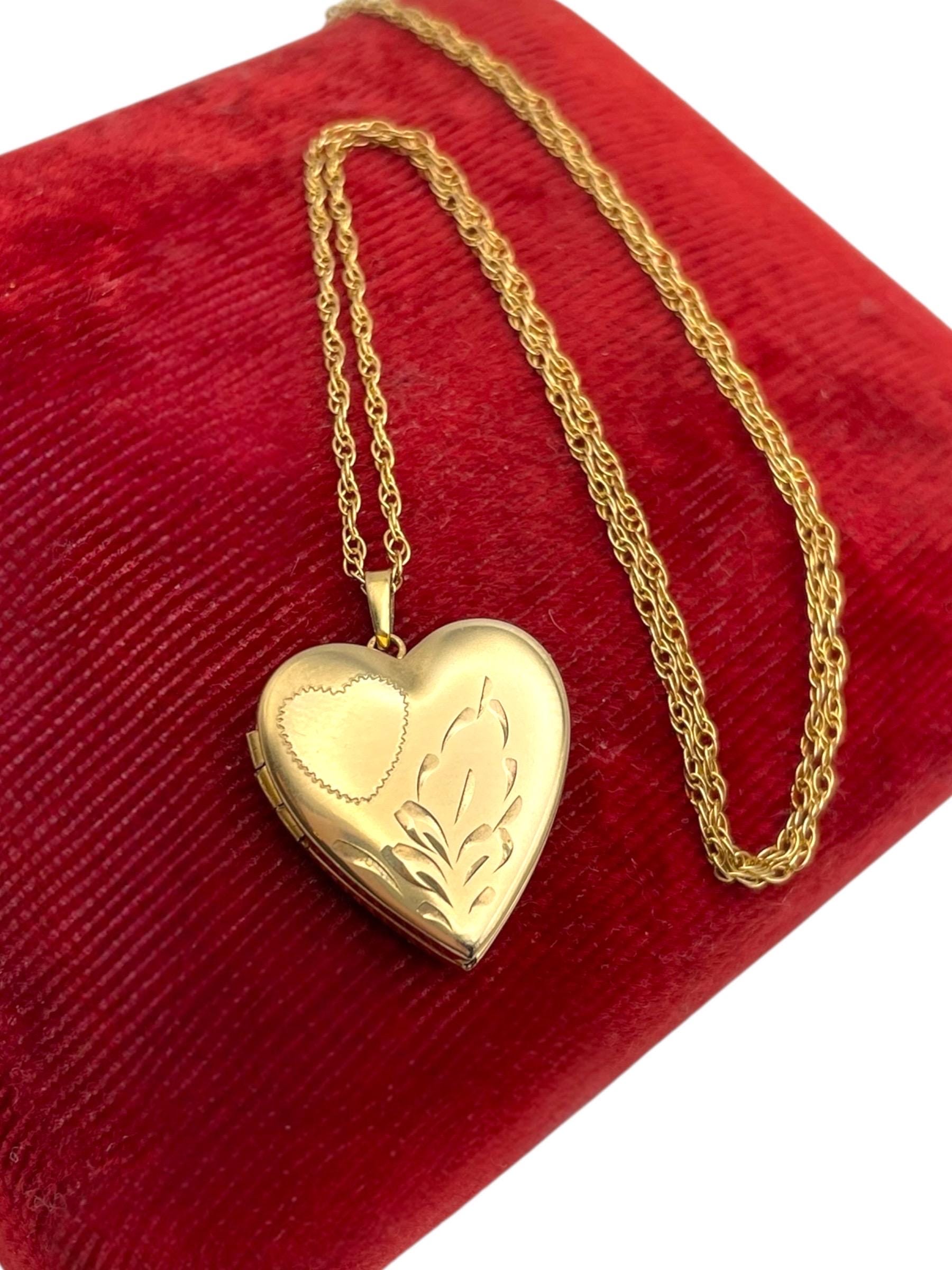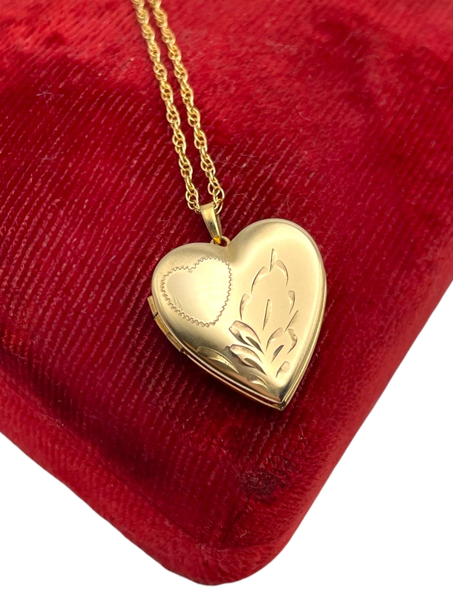 Feminine and classic vintage 14k gold filled heart shaped locket on a fine chain. The heart shaped locket pendant has an etched heart on the front left with some etched leaves on the right. The interior of the locket is completely empty and can hold two tiny photos (one on each side). The locket is empty except for one side has the plastic cover and paper backing. The back of this little locket has a shiny finish. It closes securely with a snap.