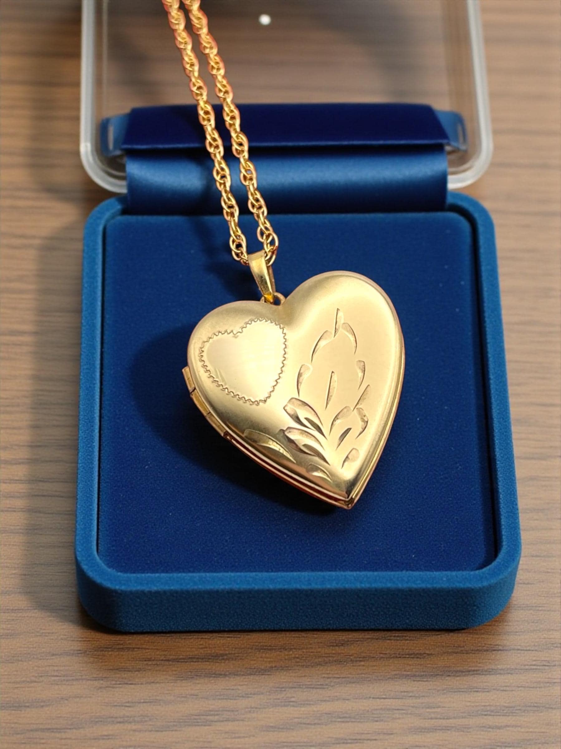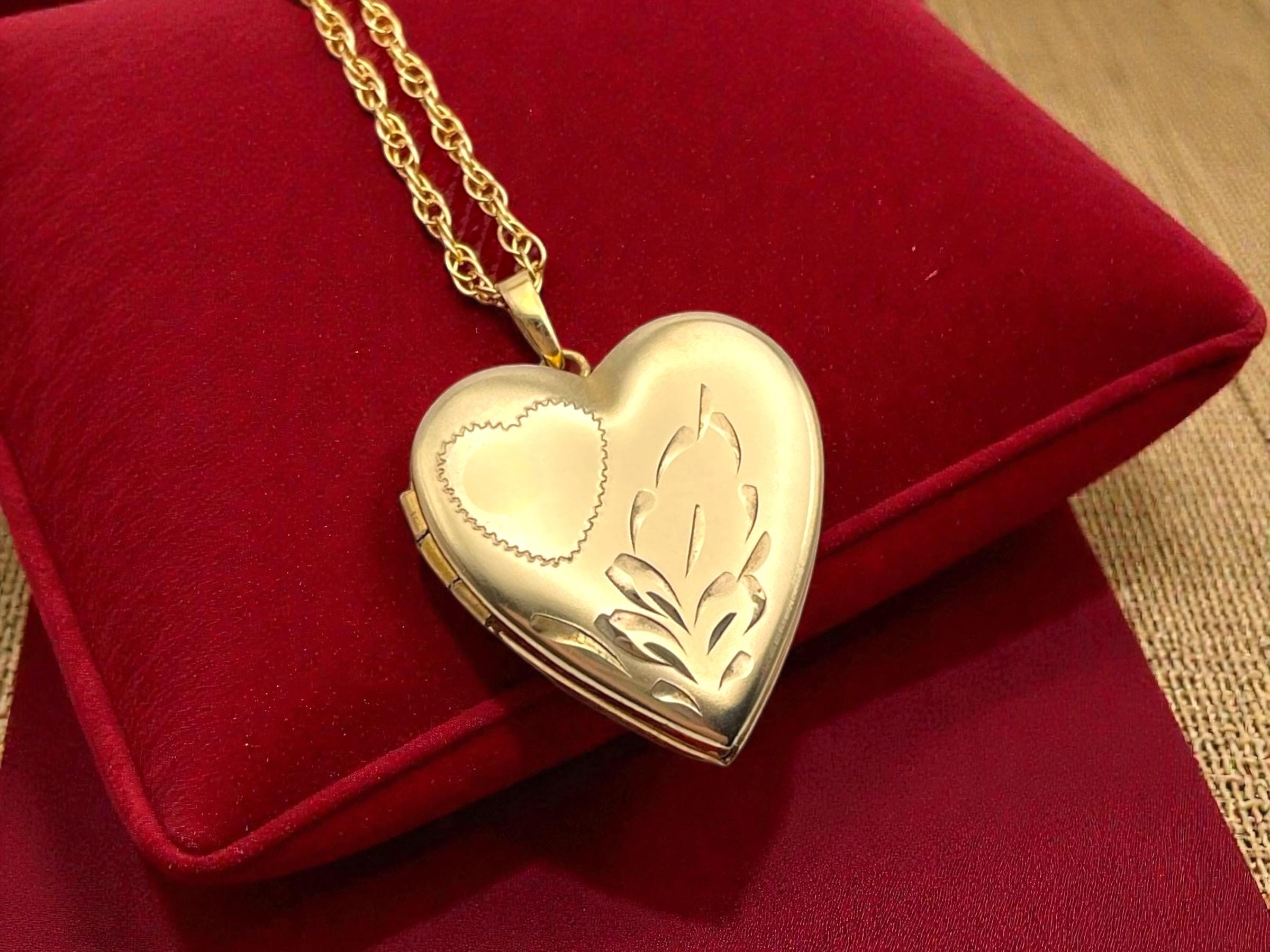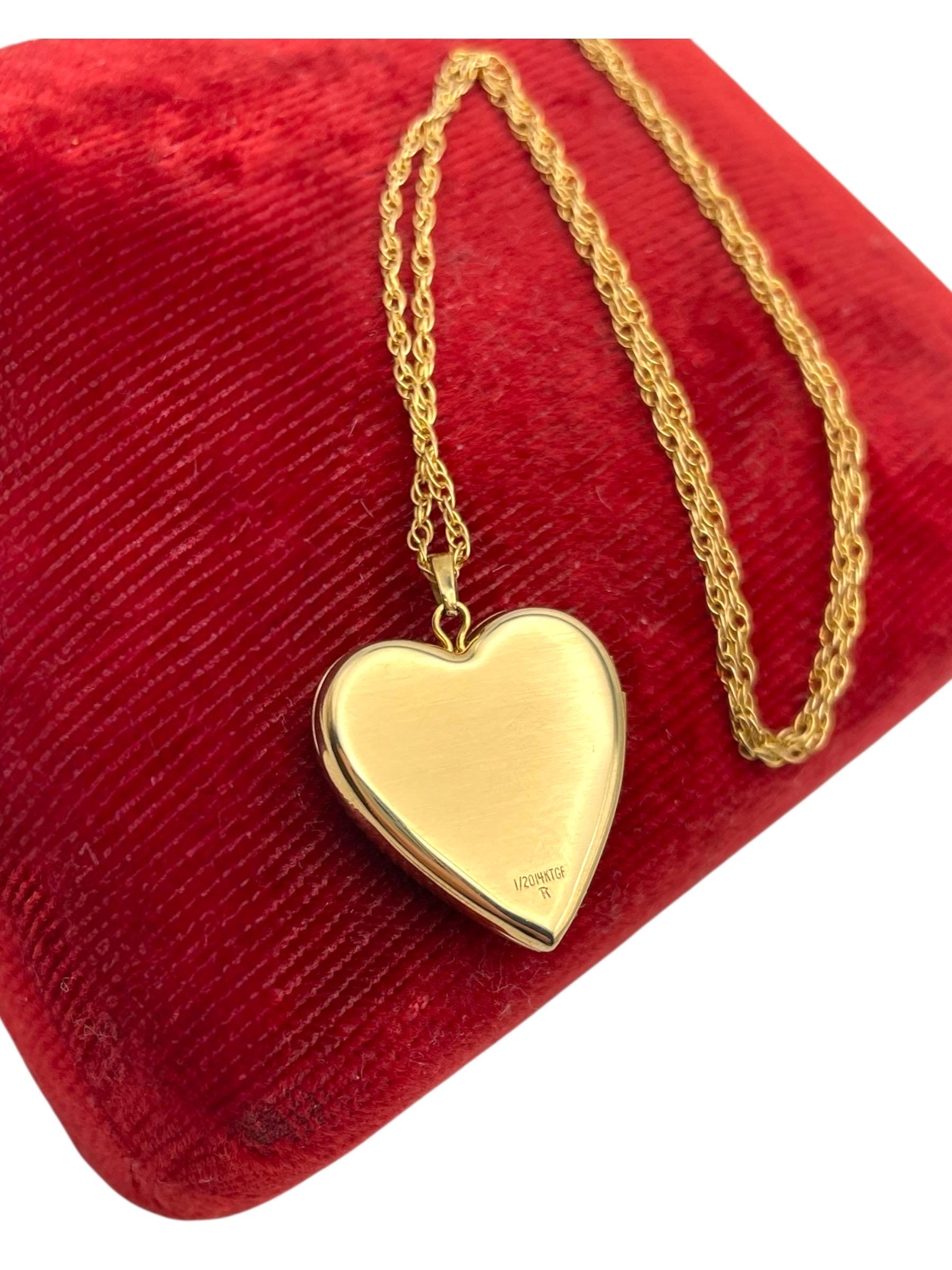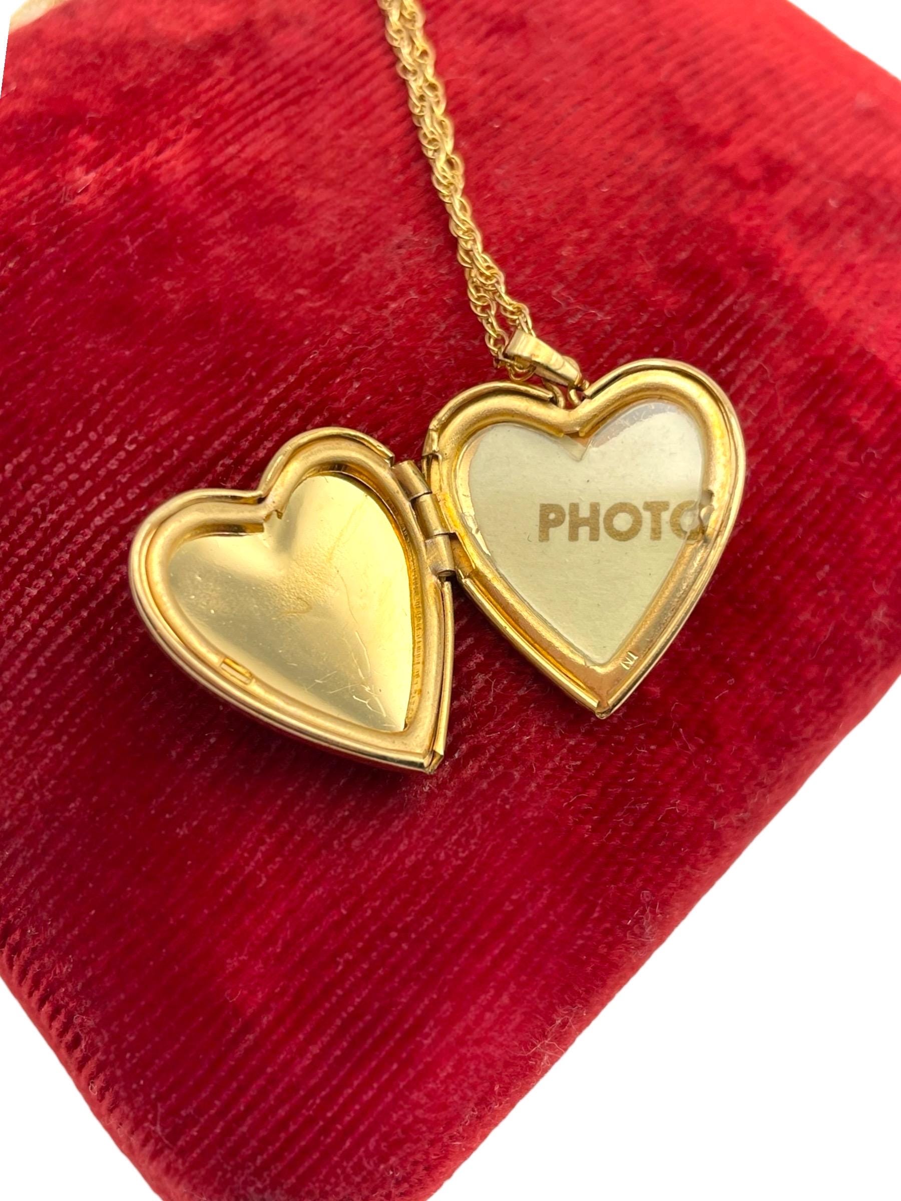 Feminine and classic vintage 14k gold filled heart shaped locket on a fine chain. The heart shaped locket pendant has an etched heart on the front left with some etched leaves on the right. The interior of the locket is completely empty and can hold two tiny photos (one on each side). The locket is empty except for one side has the plastic cover and paper backing. The back of this little locket has a shiny finish. It closes securely with a snap.