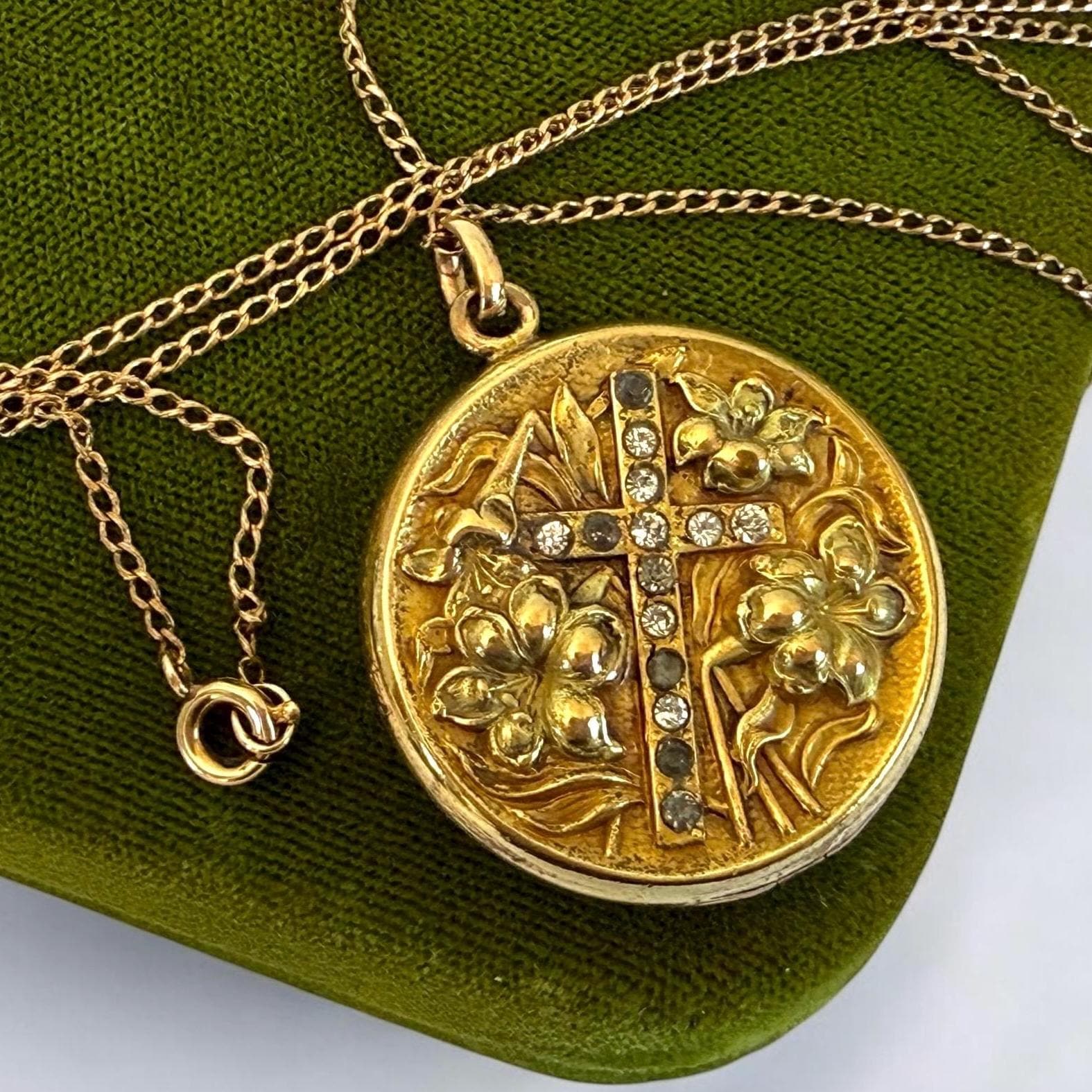 Lovely antique Art Nouveau gold plated round photo locket on a vintage gold plated chain with a religious theme. Beautiful and ornate, this locket was from the early to mid 1900s. The locket front features a matte finish with a raised floral and paste studded cross design. The cross is somewhat offset from the center and is set with 14 clear paste stones. A flower that appears to be a lily is on the front in three places around the cross.