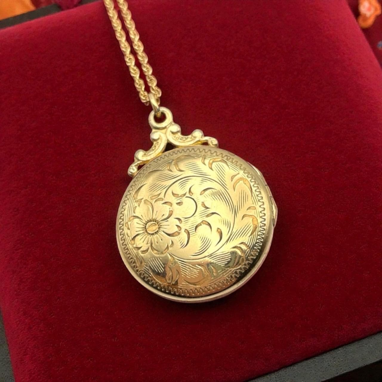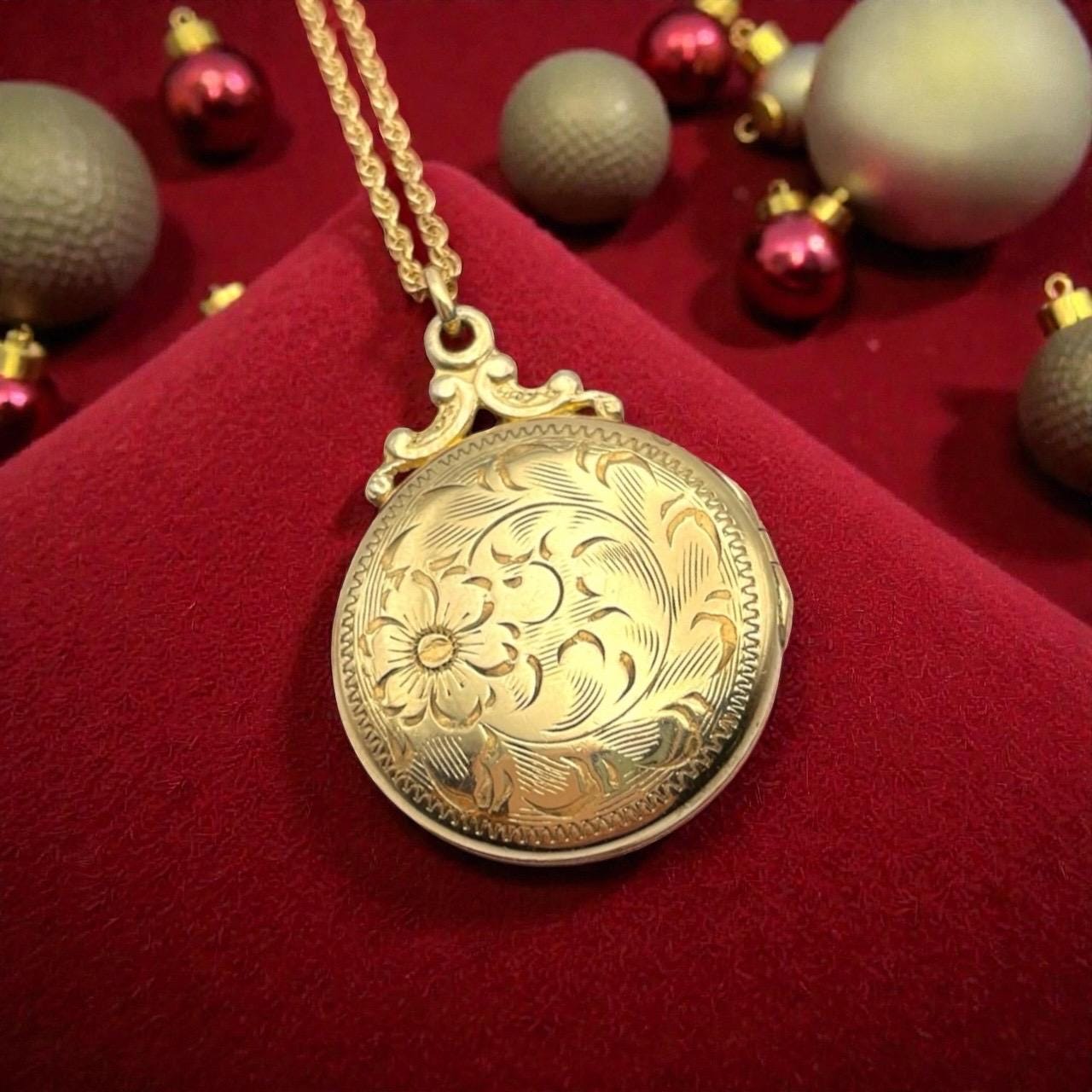 Vintage gold filled round etched locket made by Birks (Canada). Locket has an etched floral design on the front and back has the message "Love Bert Feb. 14 '57".