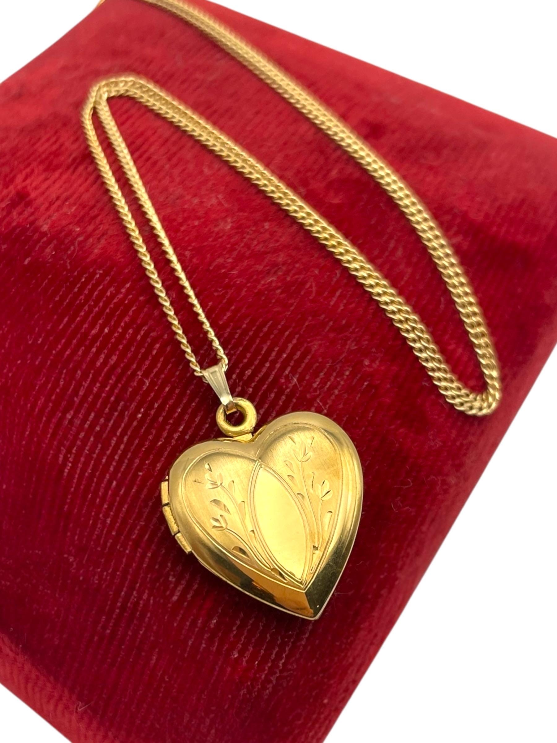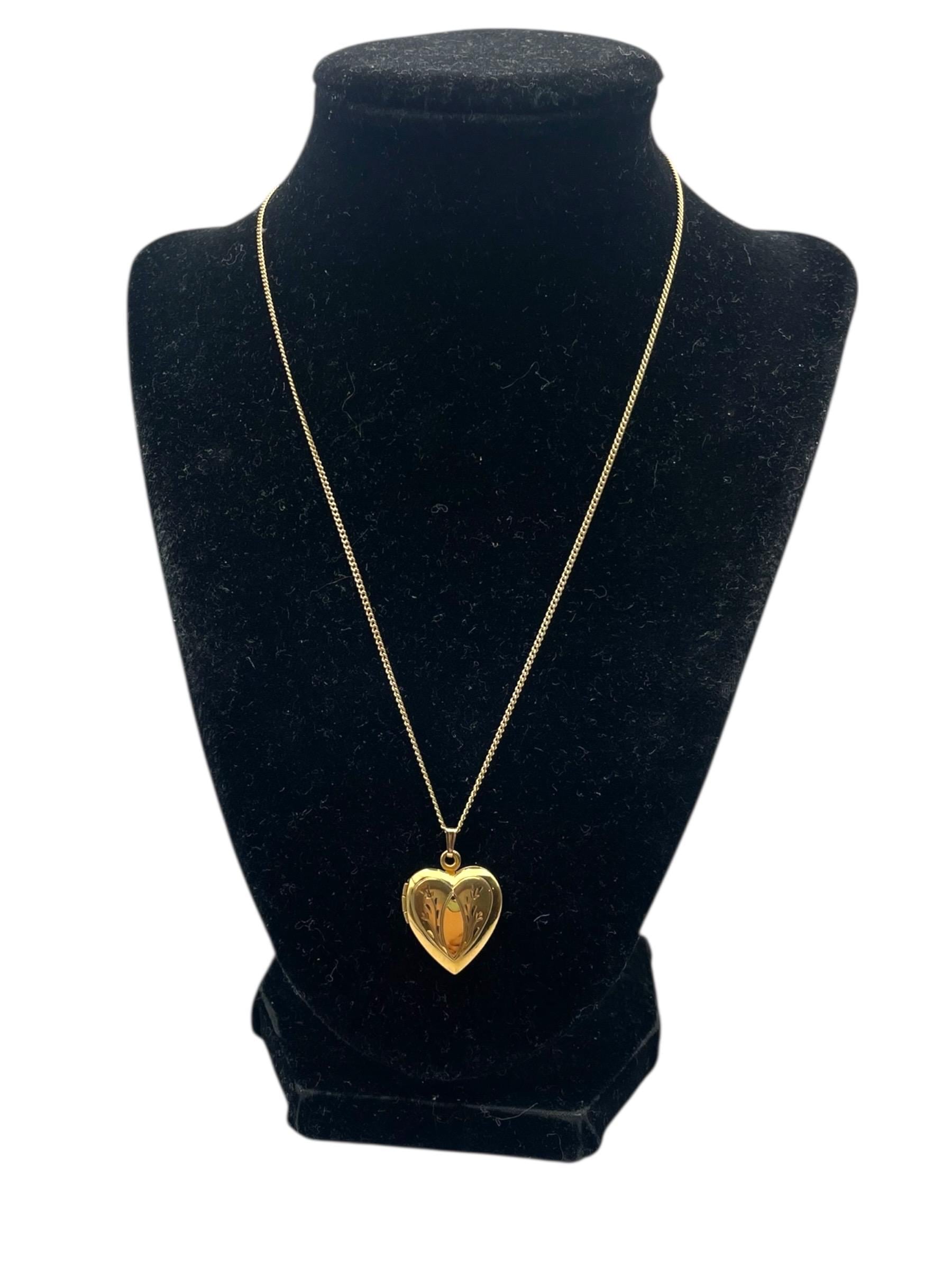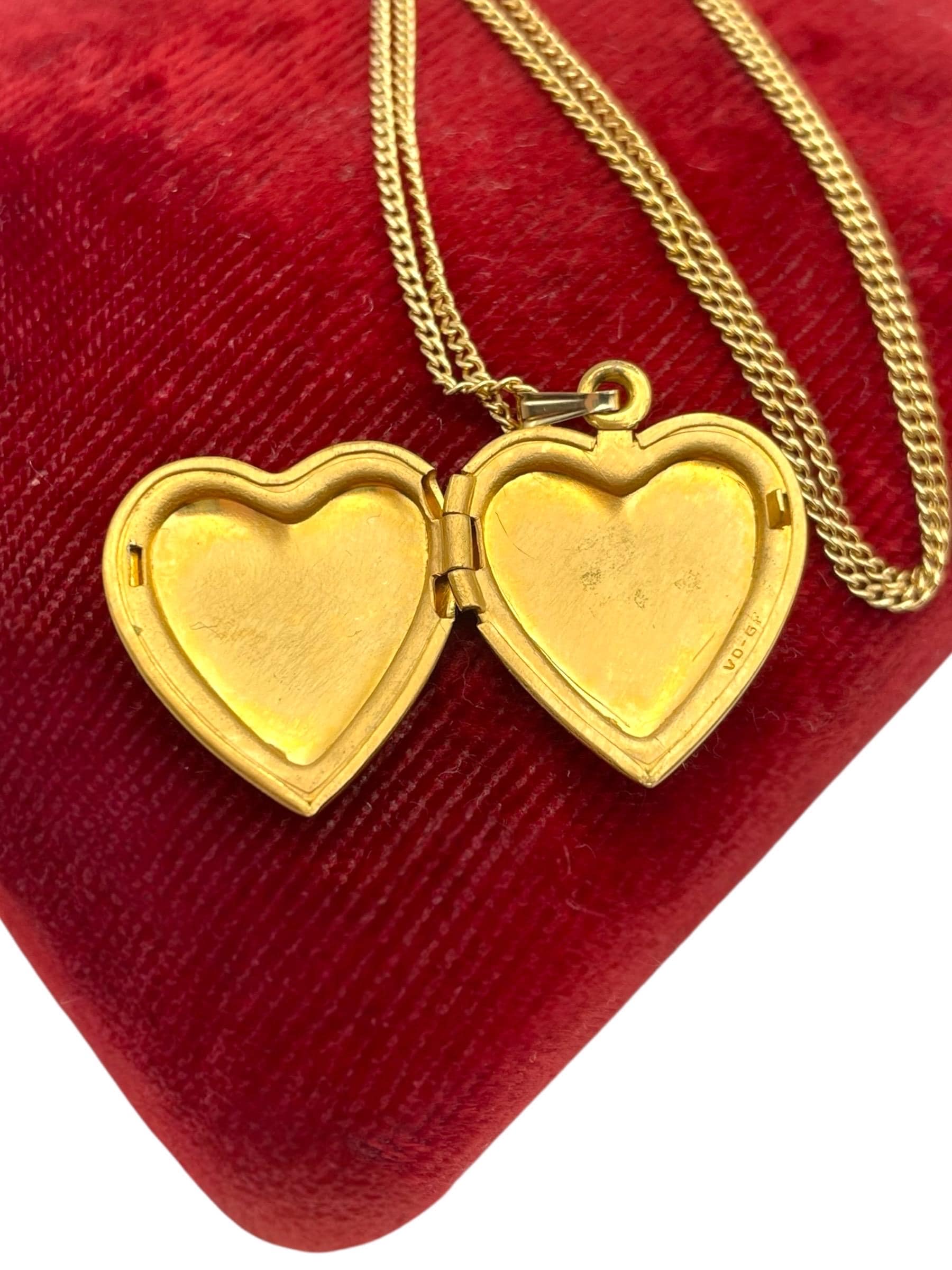 Lovely vintage gold filled photo locket. This heart shaped locket is circa mid century (1950s) in age. The front features an etched design and the back is plain with no design.