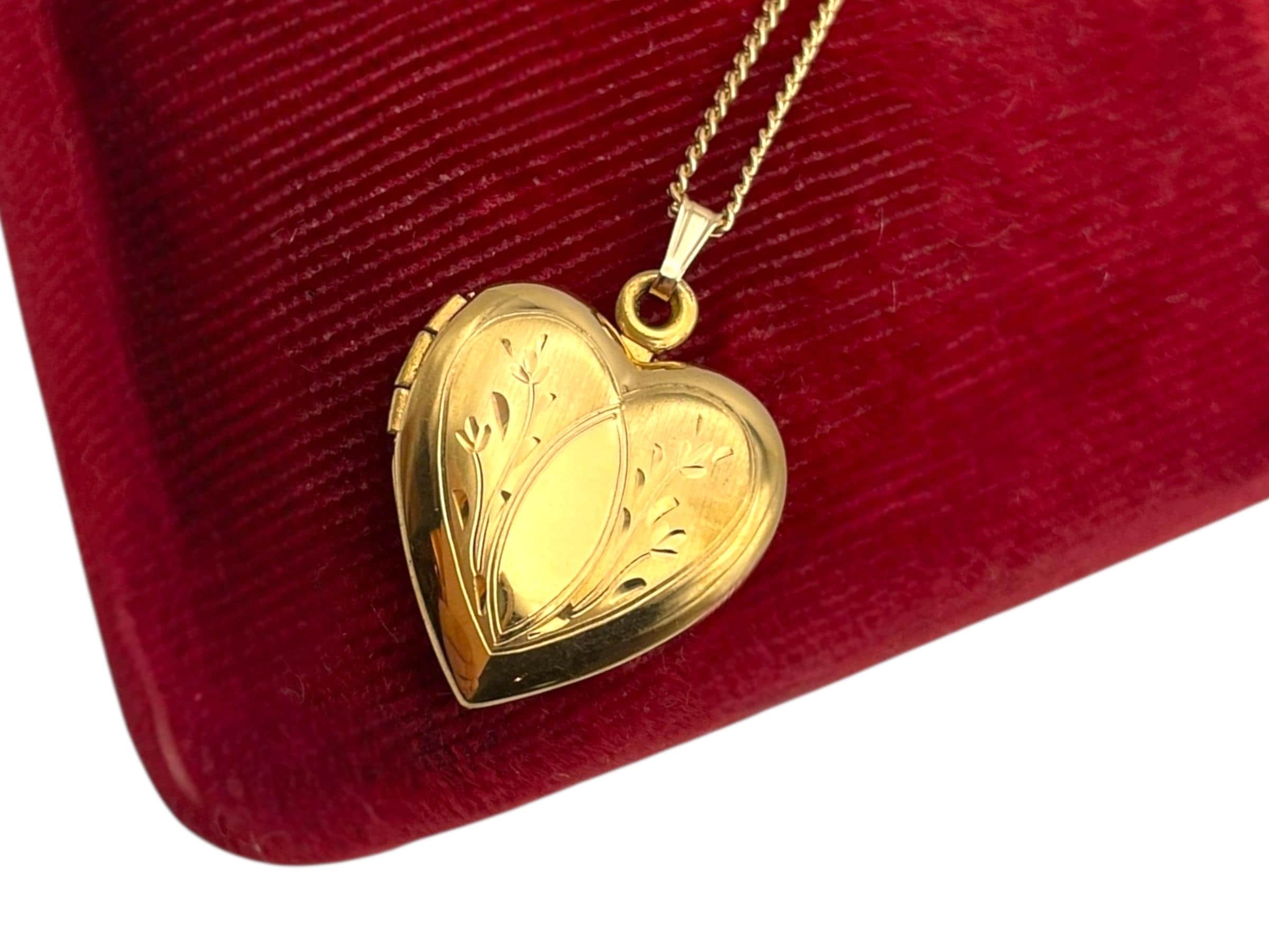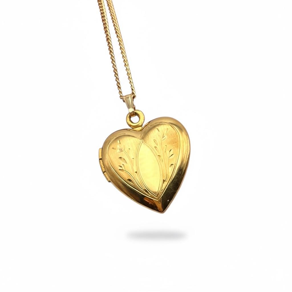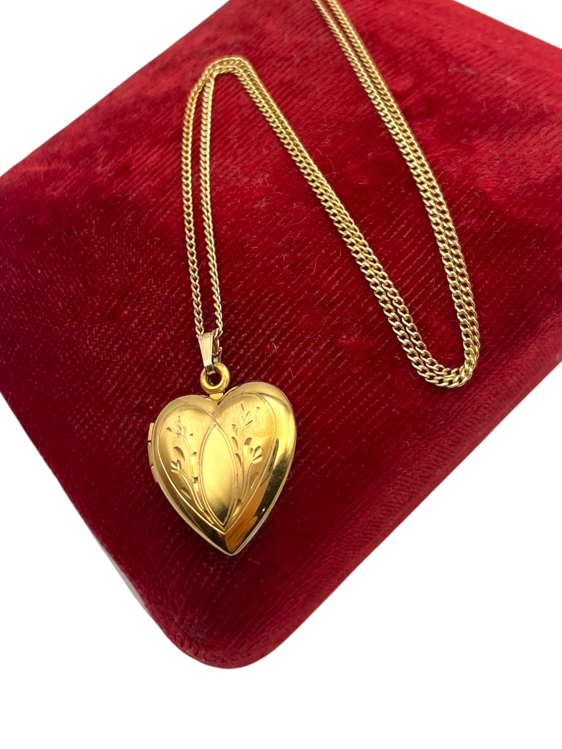 Lovely vintage gold filled photo locket. This heart shaped locket is circa mid century (1950s) in age. The front features an etched design and the back is plain with no design.