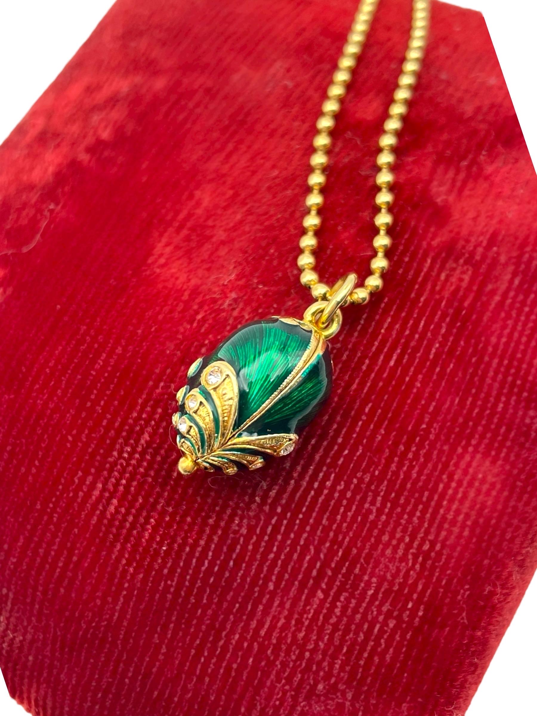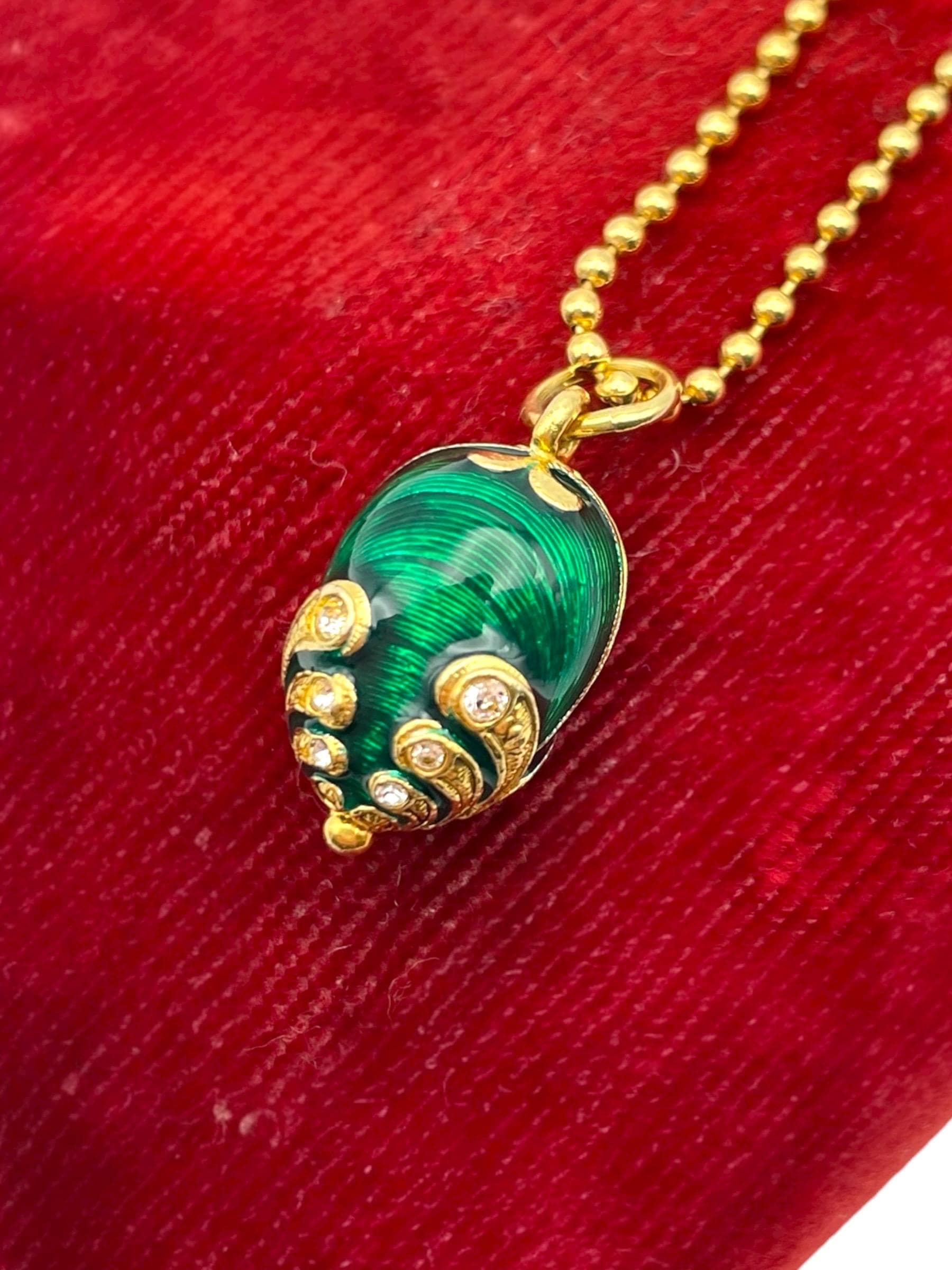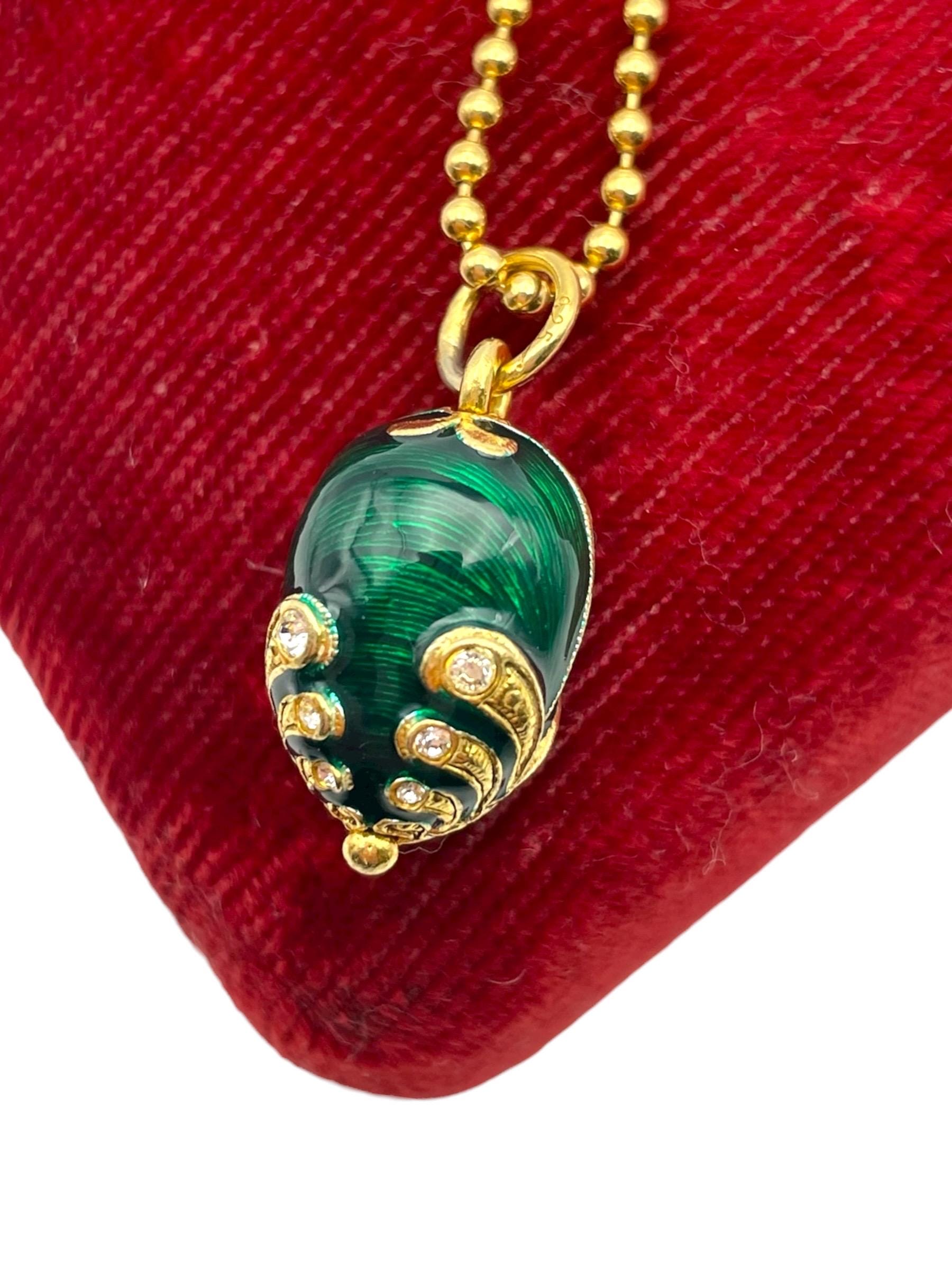 Green Guilloche Fabergé egg rhinestone vermeil sterling silver pendant necklace.