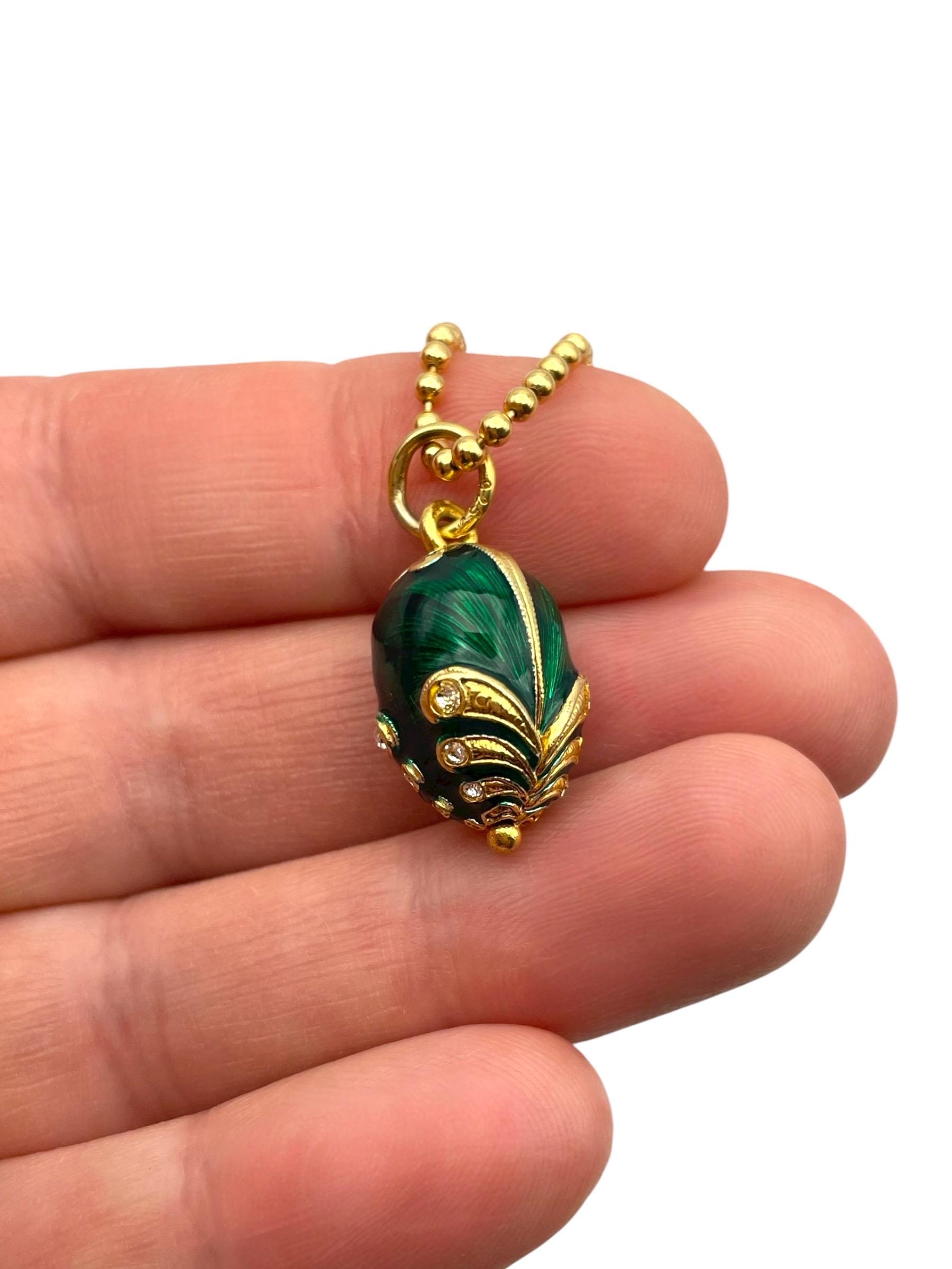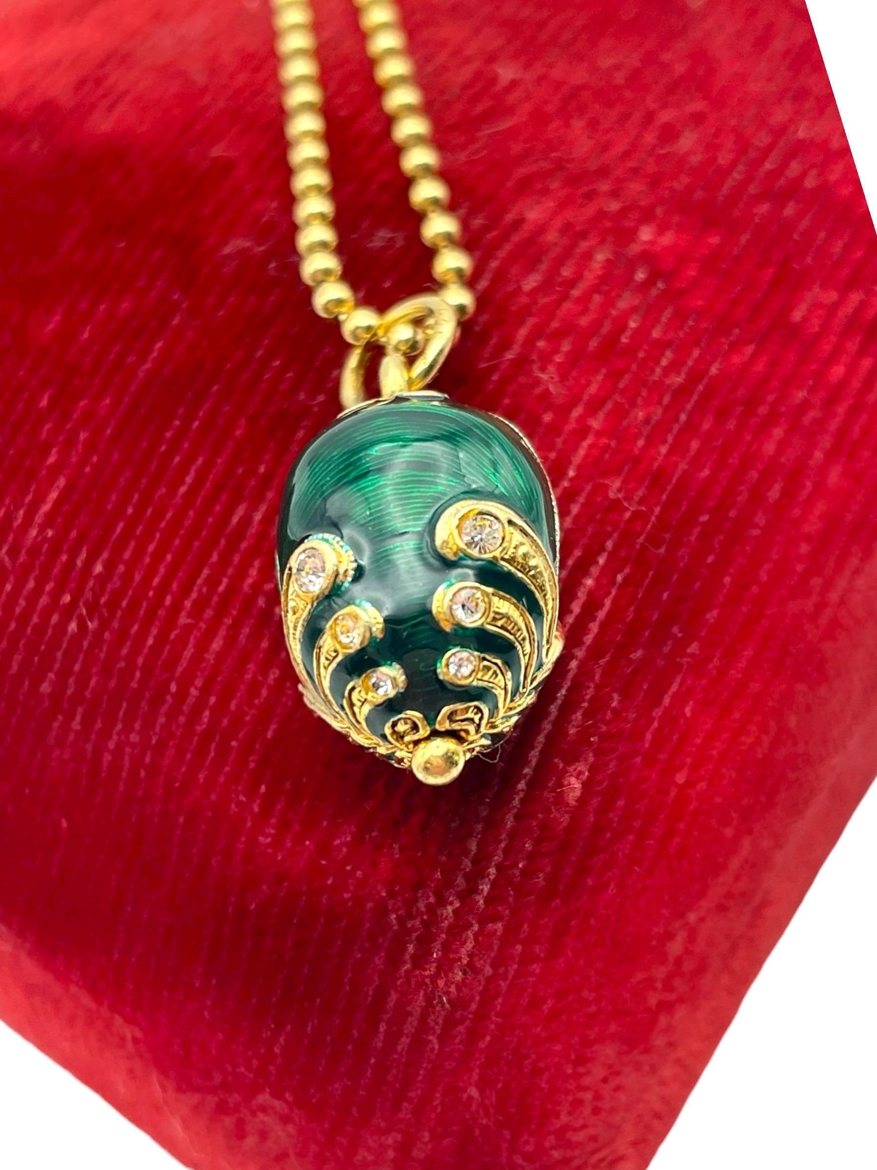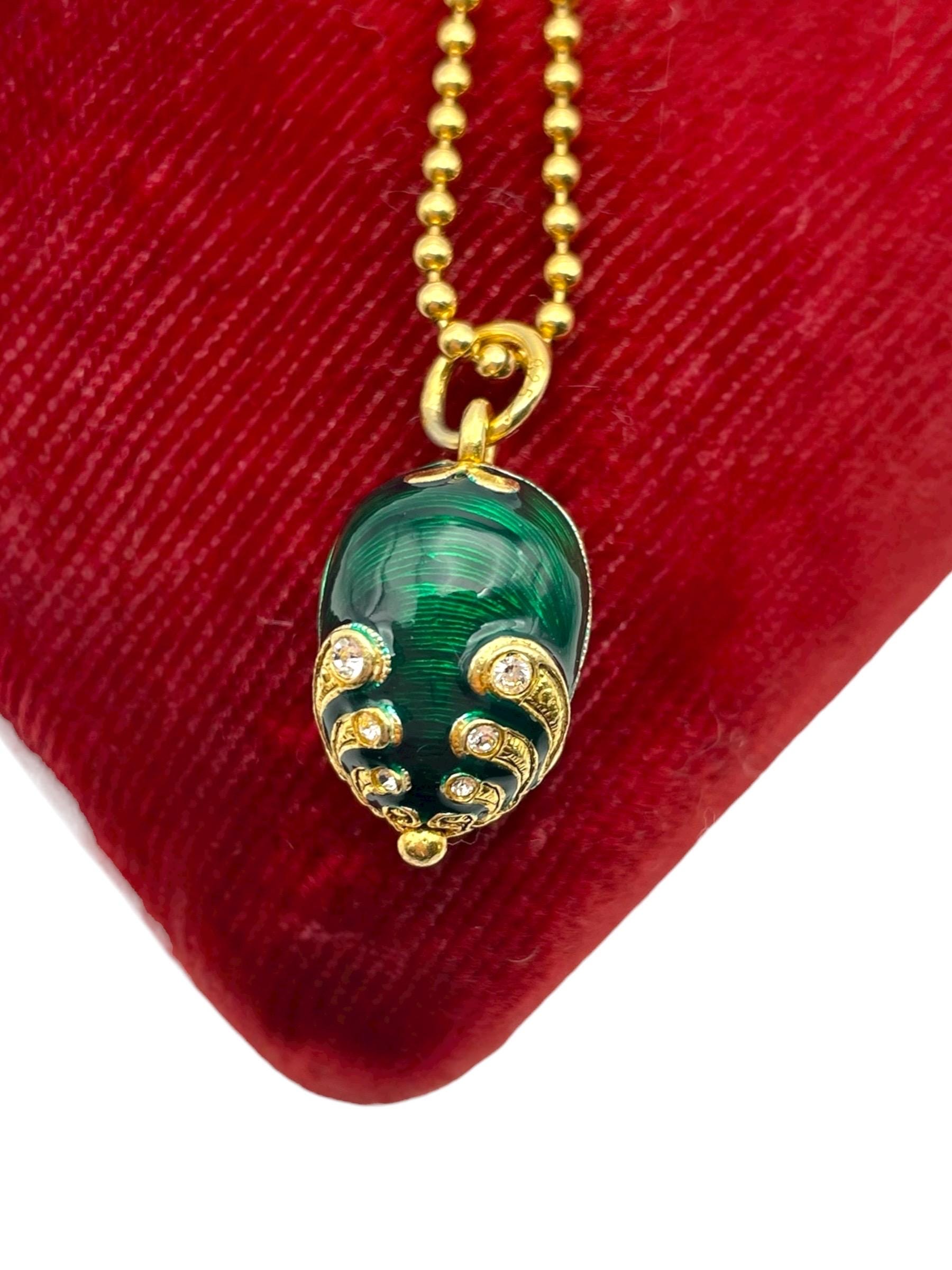 Green Guilloche Fabergé egg rhinestone vermeil sterling silver pendant necklace.