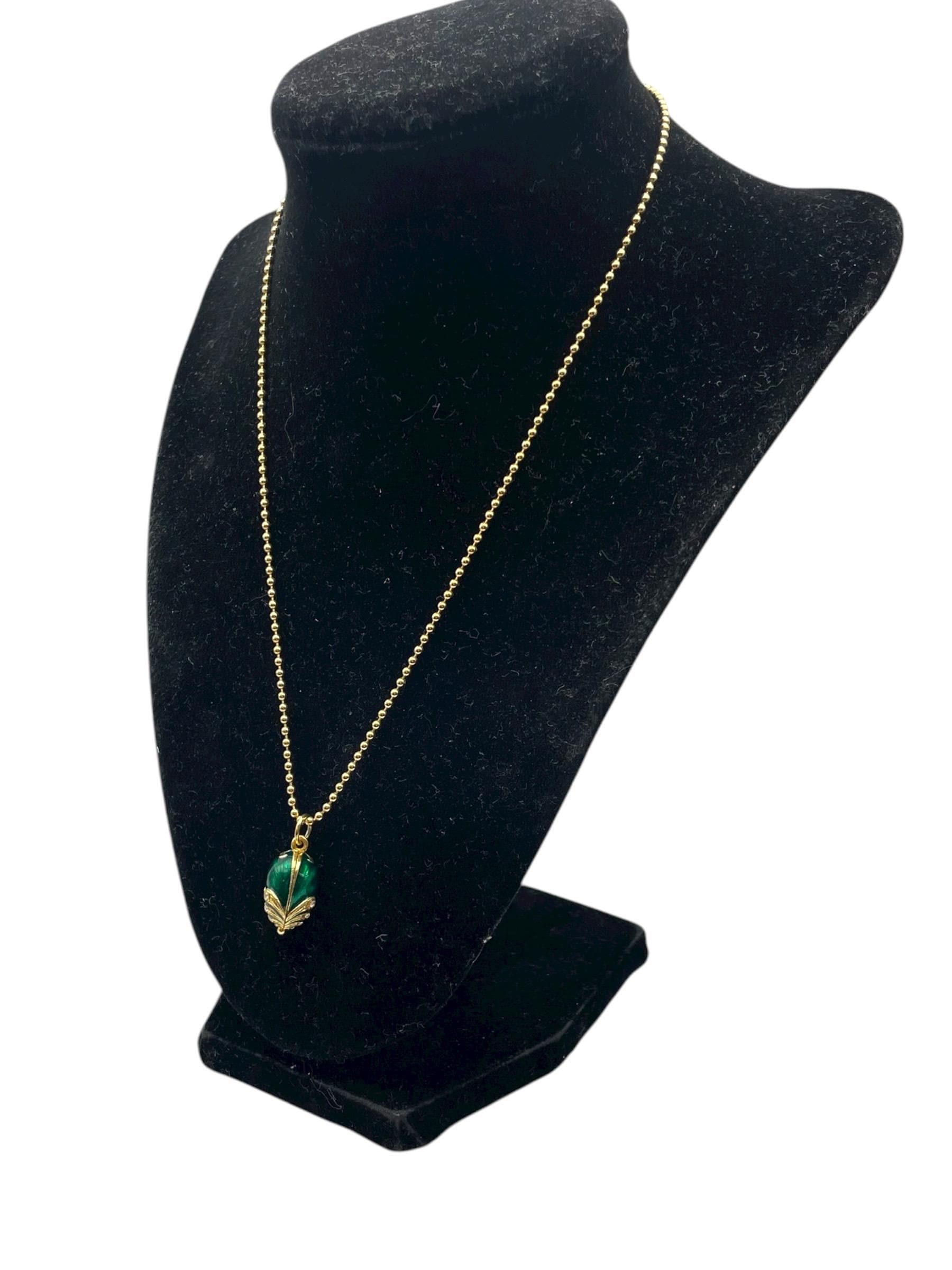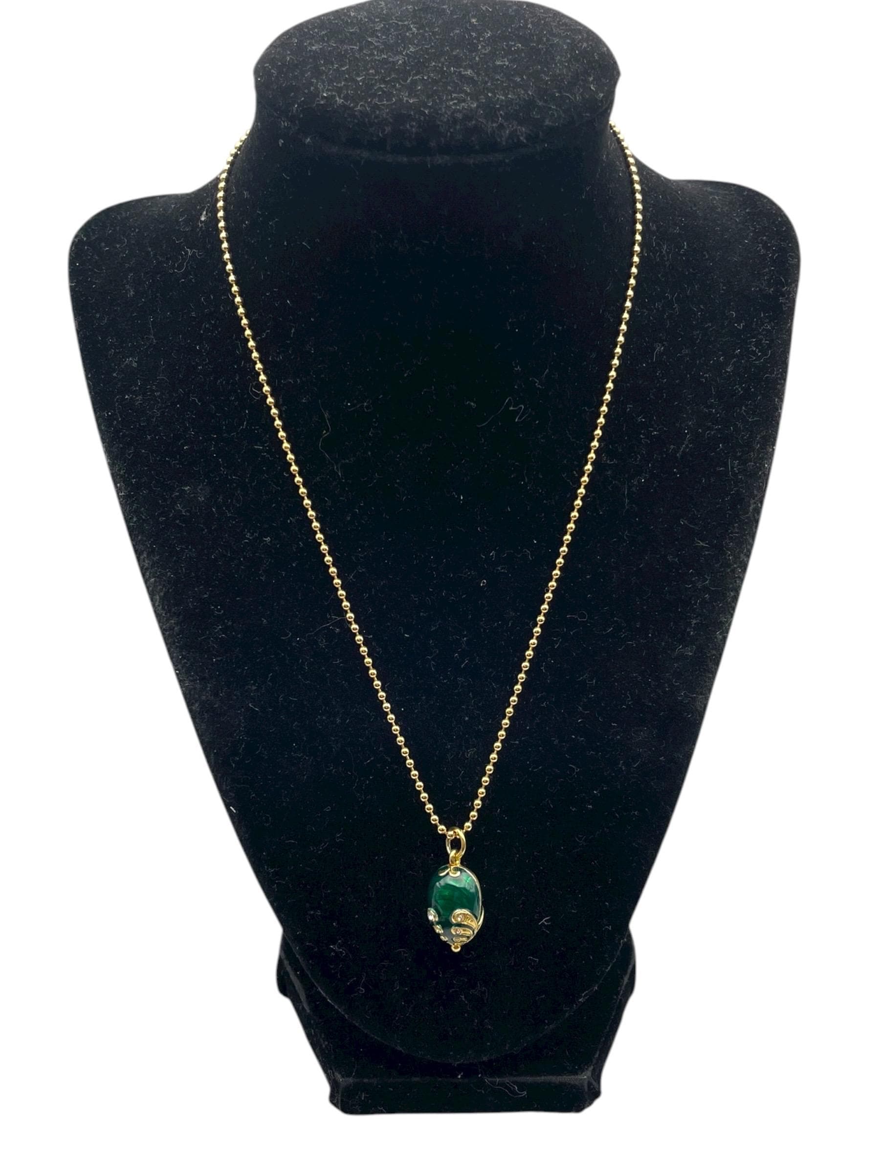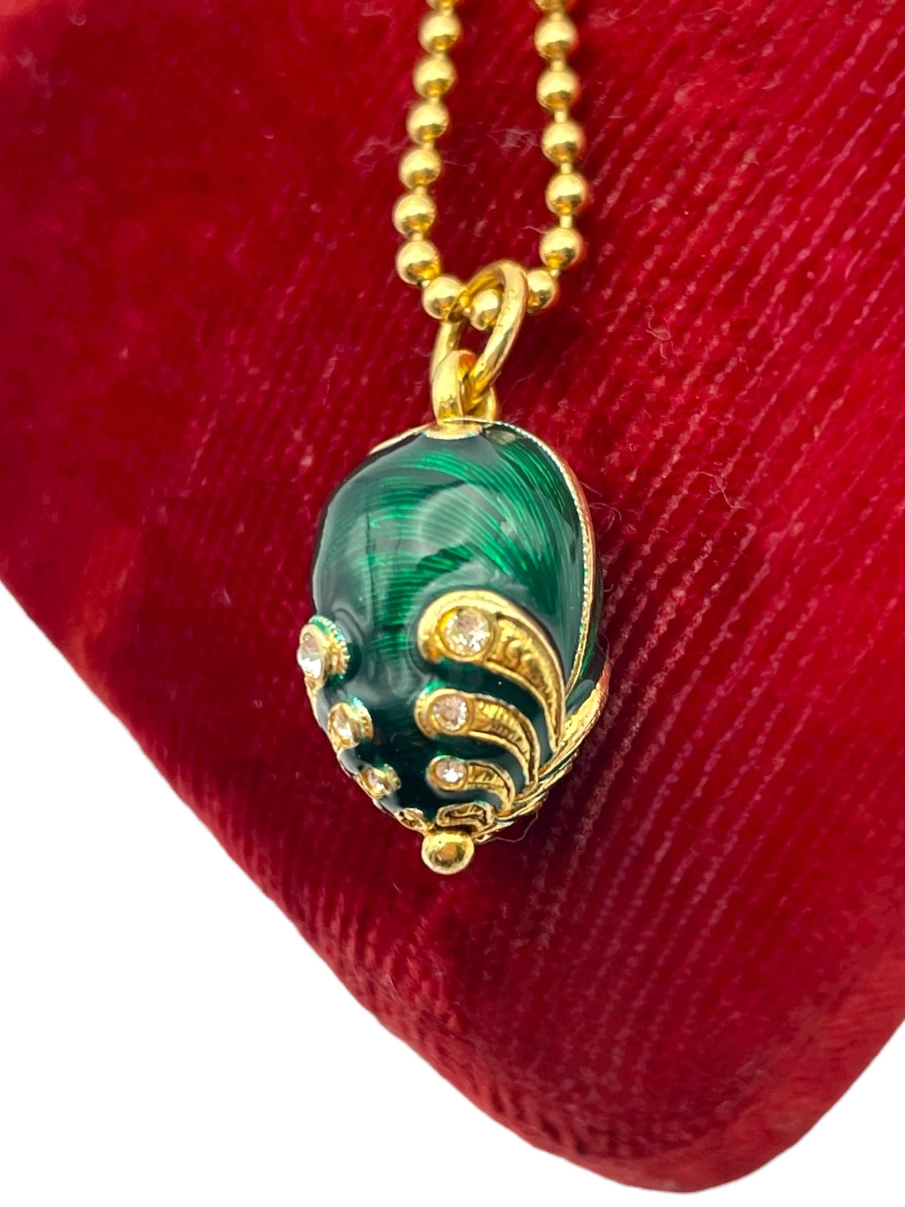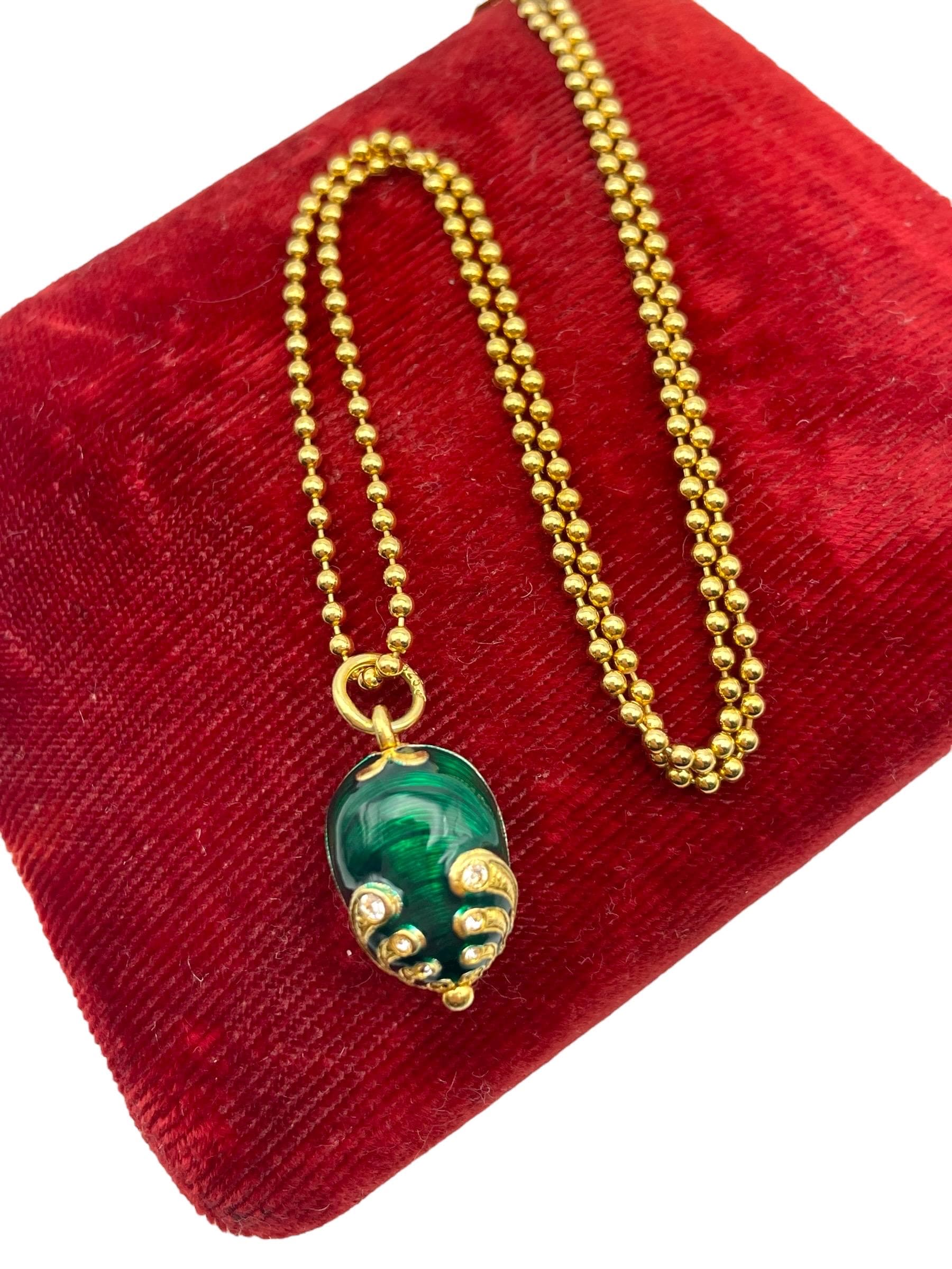 Vintage Green Guilloche Fabergé Egg Pendant - With Rhinestones Gold Vermeil over Sterling Silver Pendant Necklace with 14K GF Ball Chain