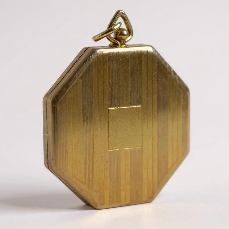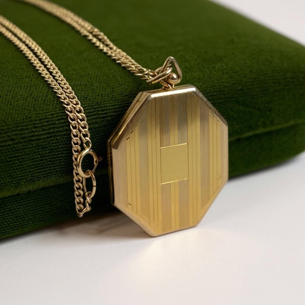 An antique eight-sided or octagon shaped locket. This lovely and large locket has a rectangular cartouche etched in the center. A pinstripe pattern covers the rest of the front. The back is plain with no design and a shiny finish.